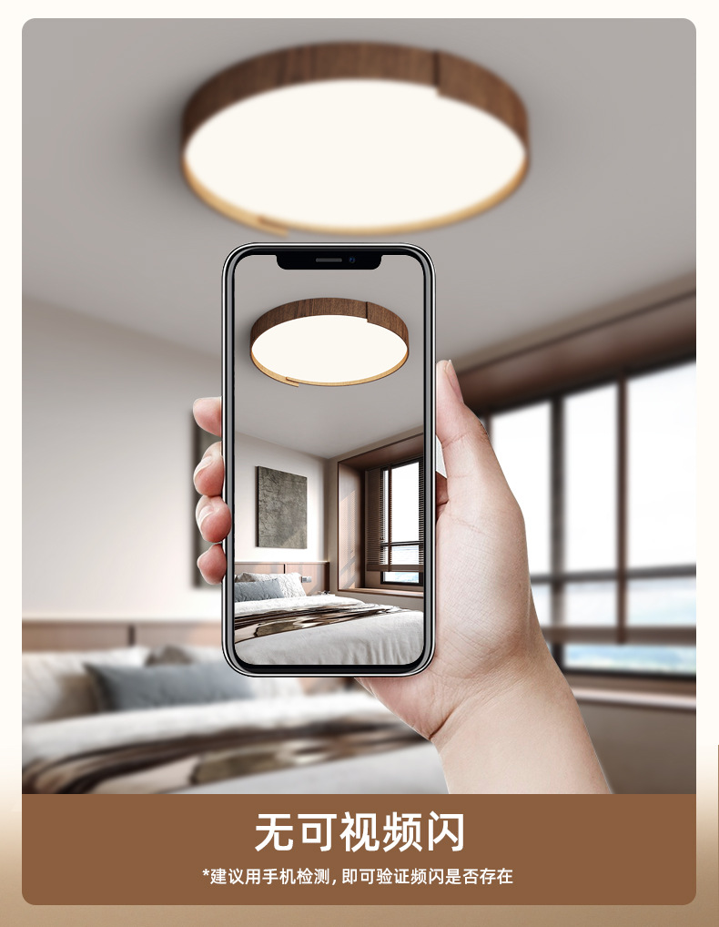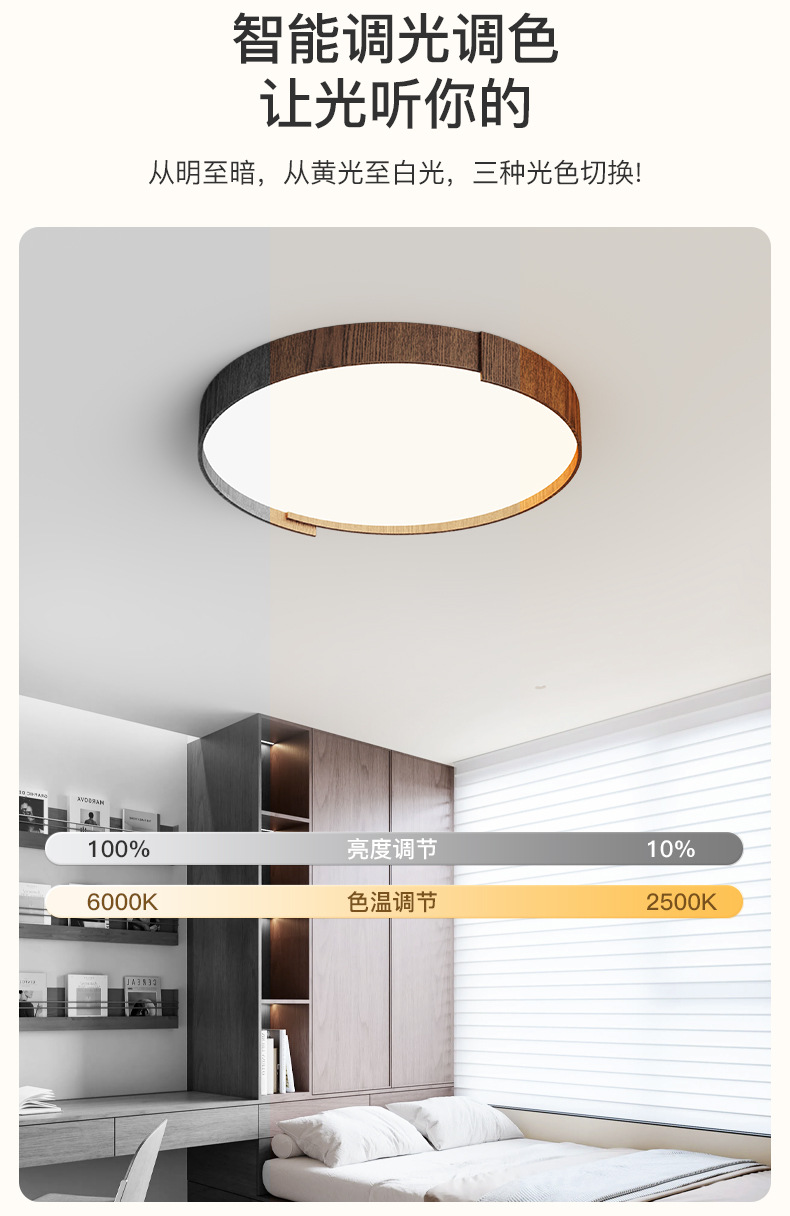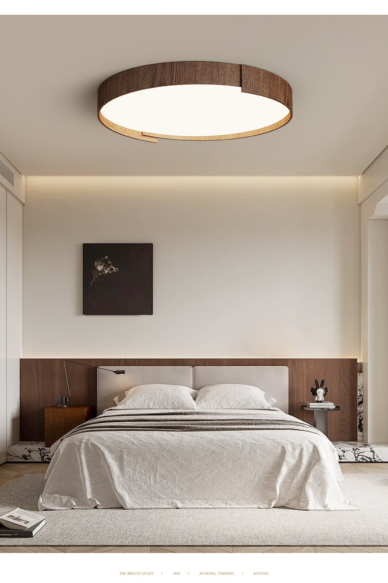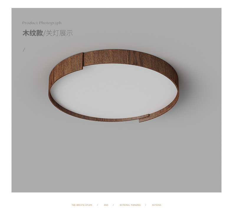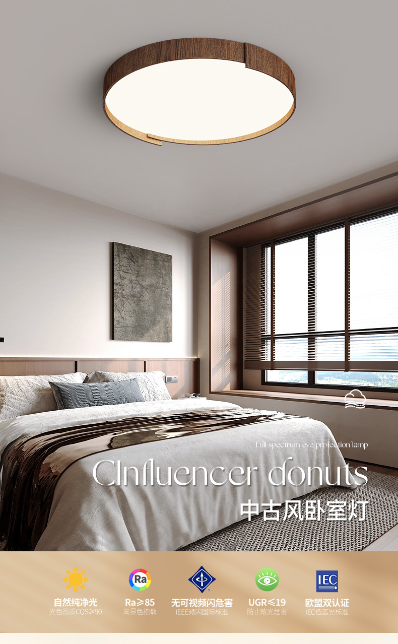 Lámpara de techo de dormitorio de estilo retro, personalidad de moda, grano de madera de nogal moderno, lámpara de sala de estar de protección ocular de espectro completo redondo