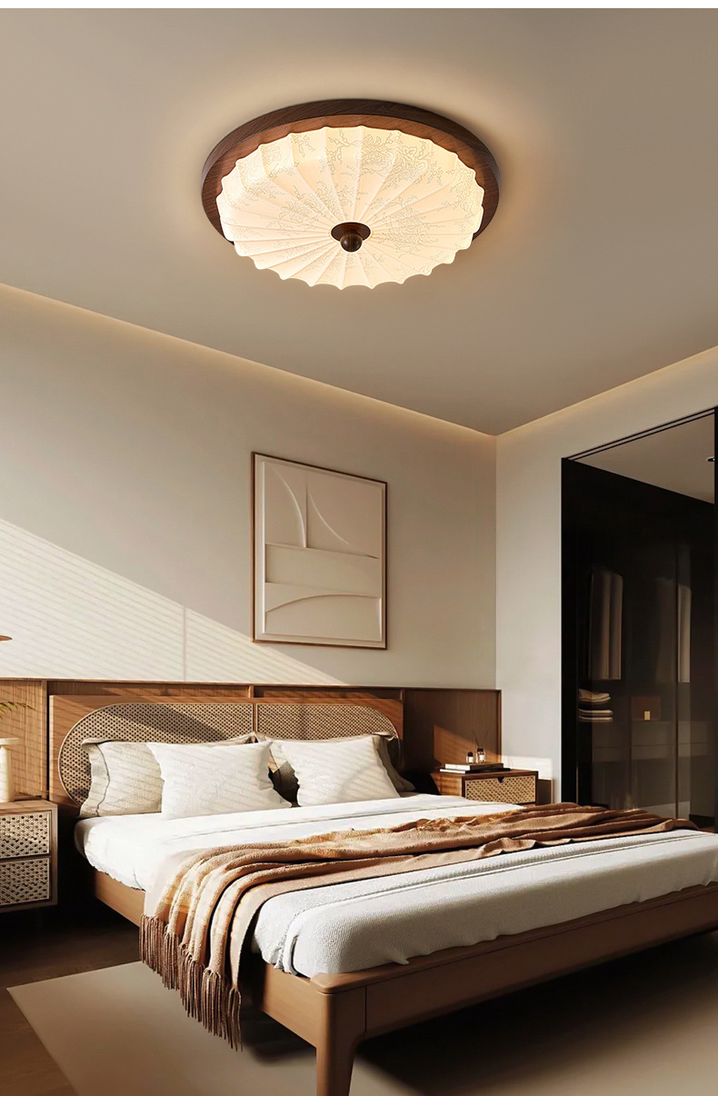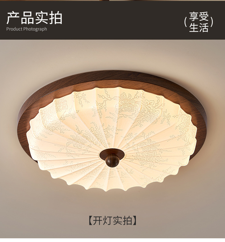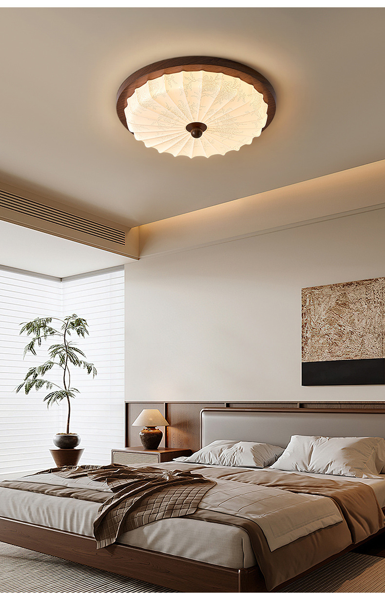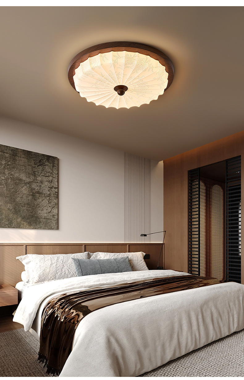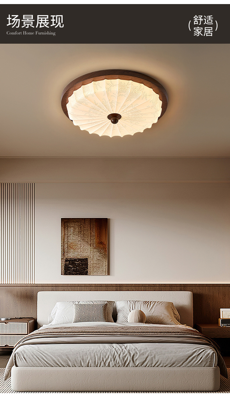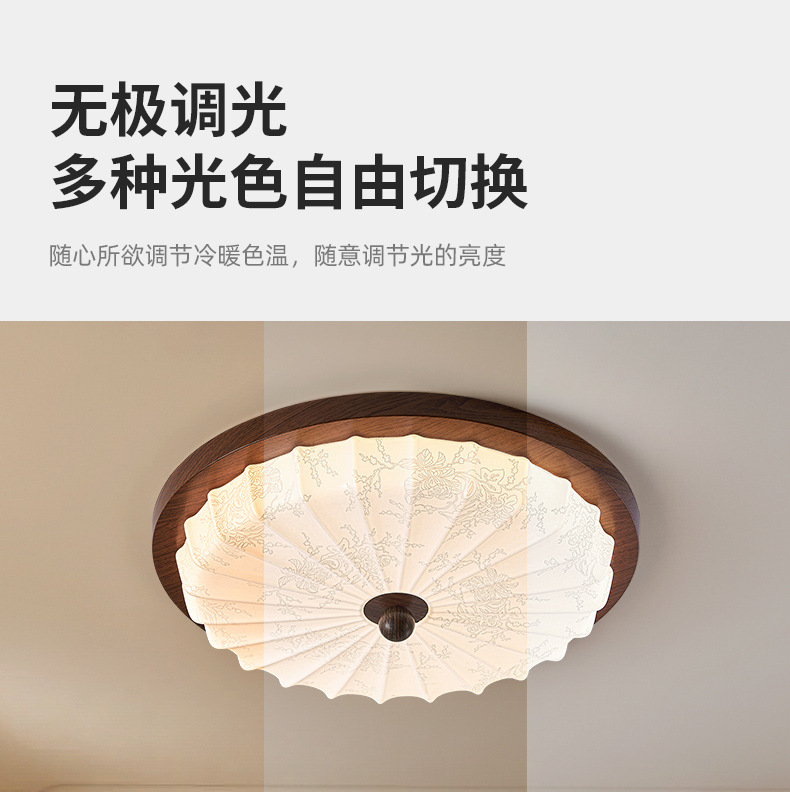 Estilo antiguo, nogal, grano de madera, lámpara de dormitorio, protección ocular, viento silencioso, lámpara de techo retro americano, sensación de alta calidad, lámpara de habitación del dormitorio principal