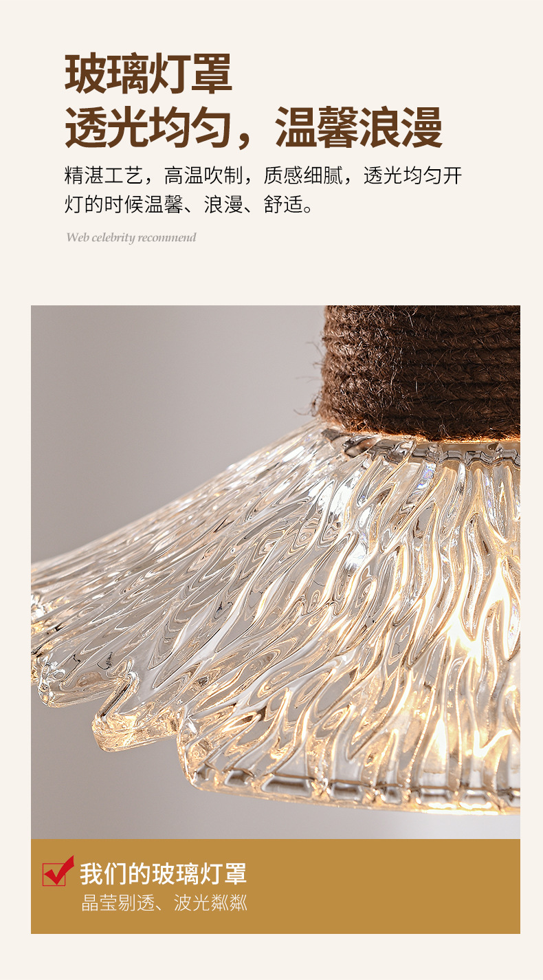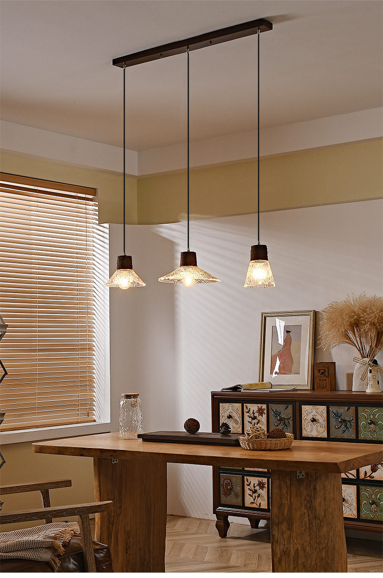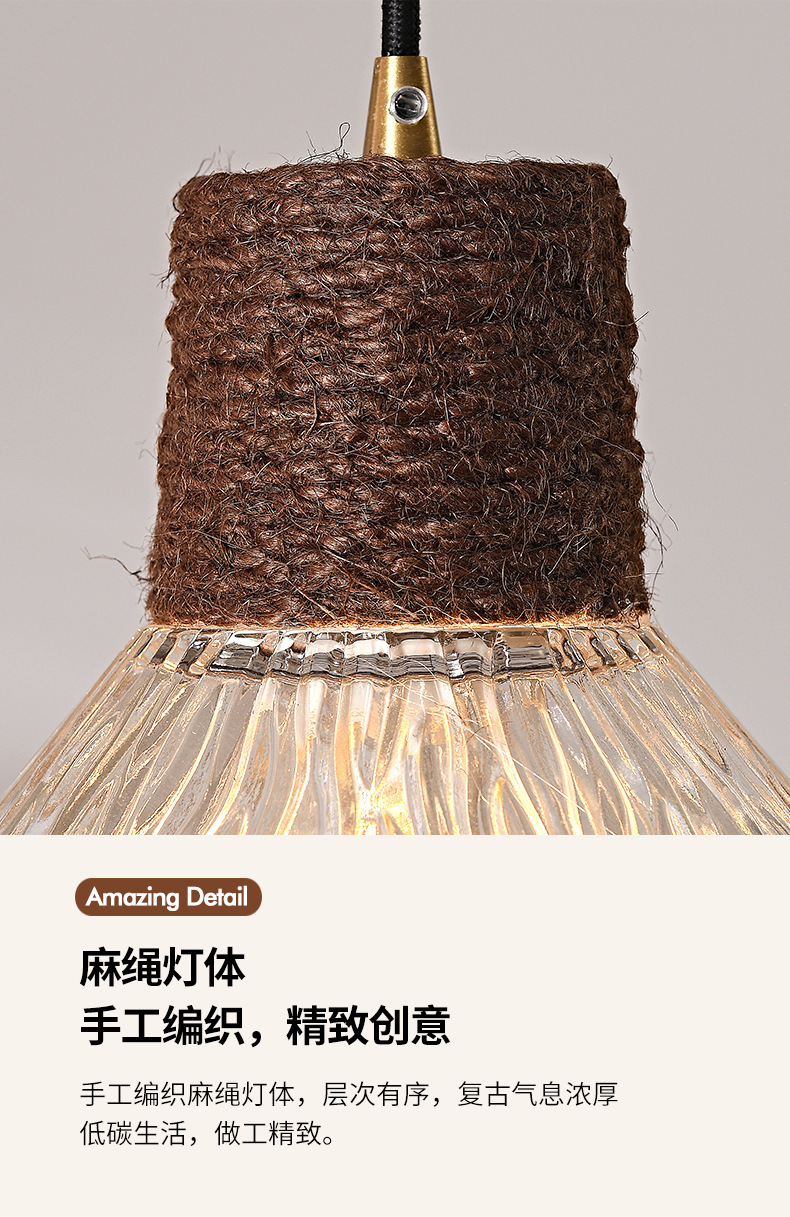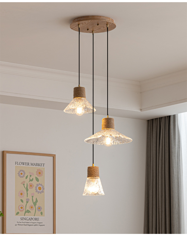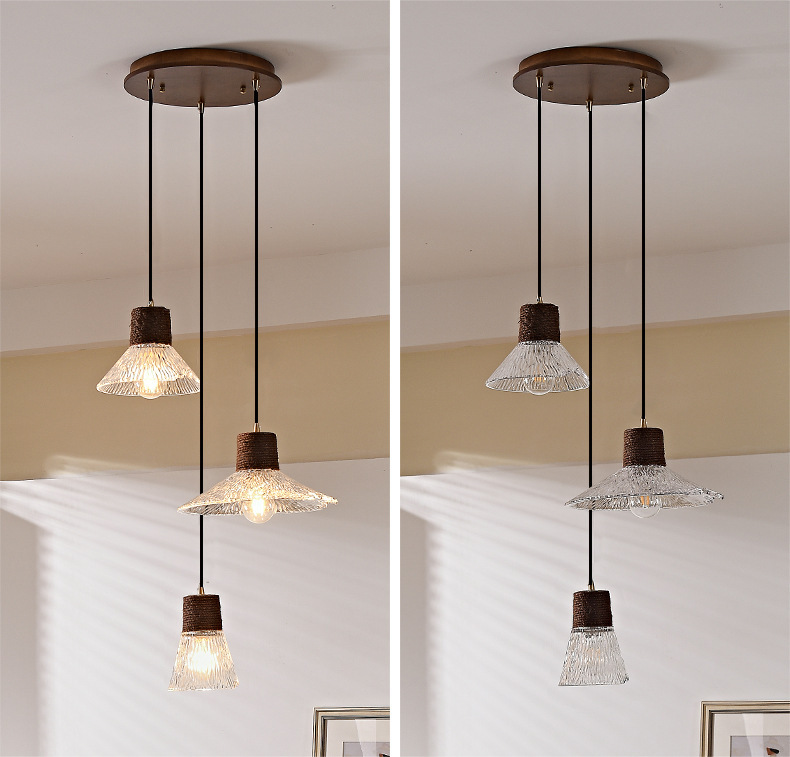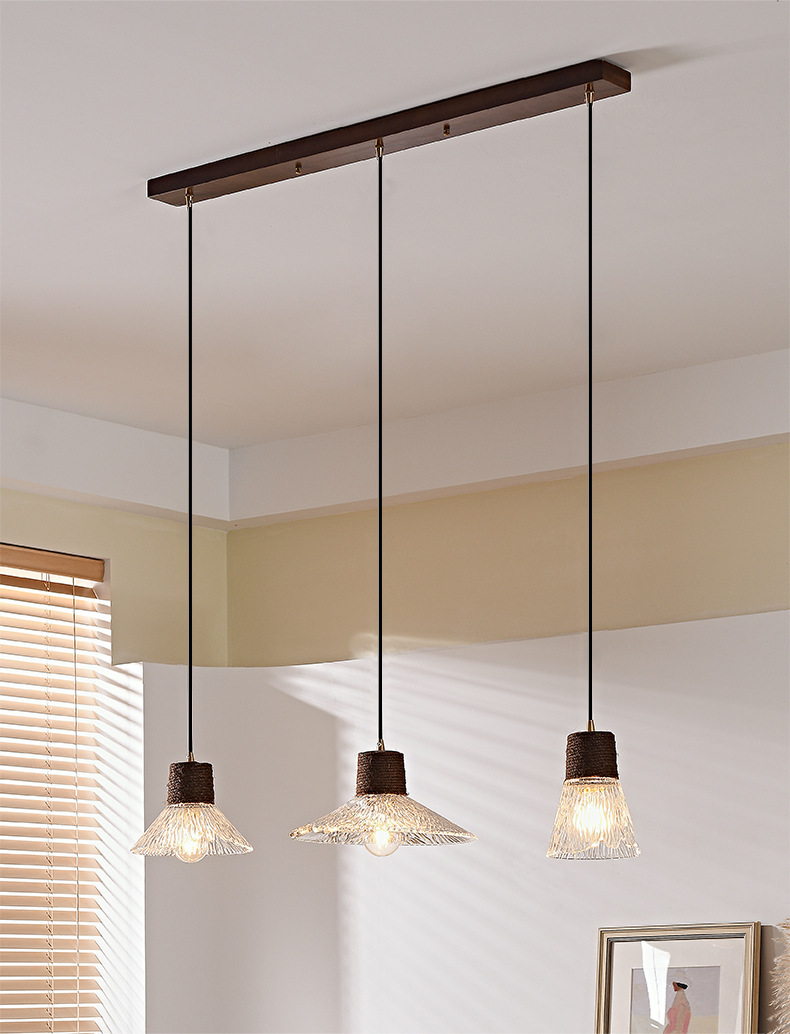 Candelabro de restaurante de estilo medio, barra de estilo retro Nanyang, escritorio, ventana, mesa de comedor, lámpara, cuerda de cáñamo, vidrio, candelabro de tres cabezas
