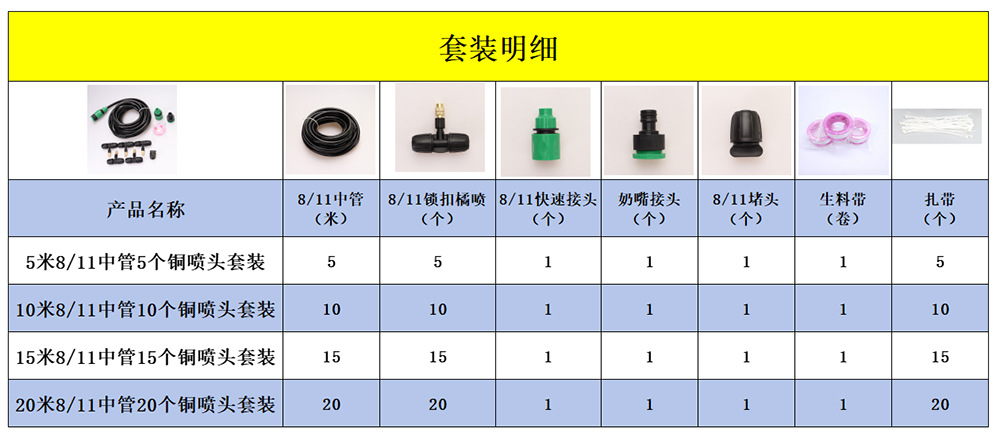 | Especificaciones | Juego de 5 m 8/11 tubo medio 5 boquillas de cobre,10 m 8/11 tubo medio 10 juego de boquillas de cobre,15 m 8/11 tubo medio 15 juego de boquillas de cobre,20 m 8/11 tubo medio conjunto de 20 boquillas de cobre |