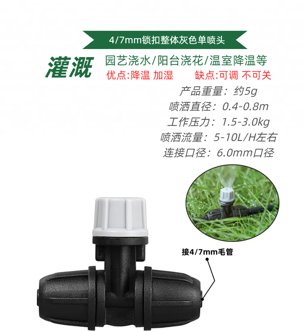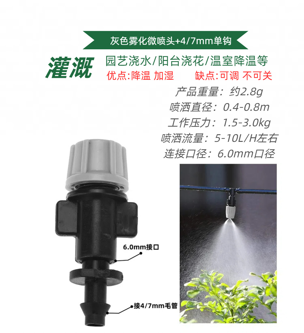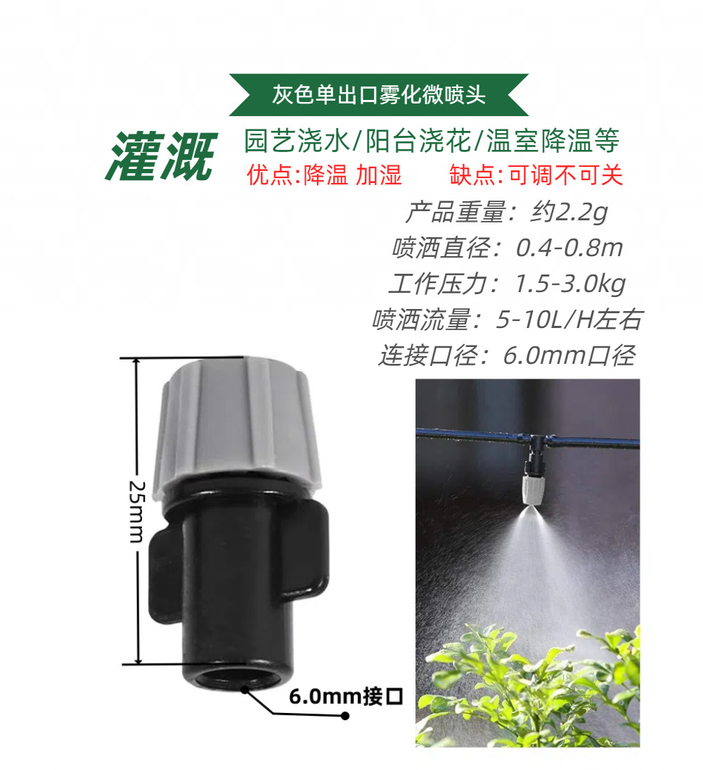 boquilla de pulverización gris transfronteriza para riego de jardín con salida única de enfriamiento de invernadero para humidificar hongos y micro boquilla de pulverización automática de riego