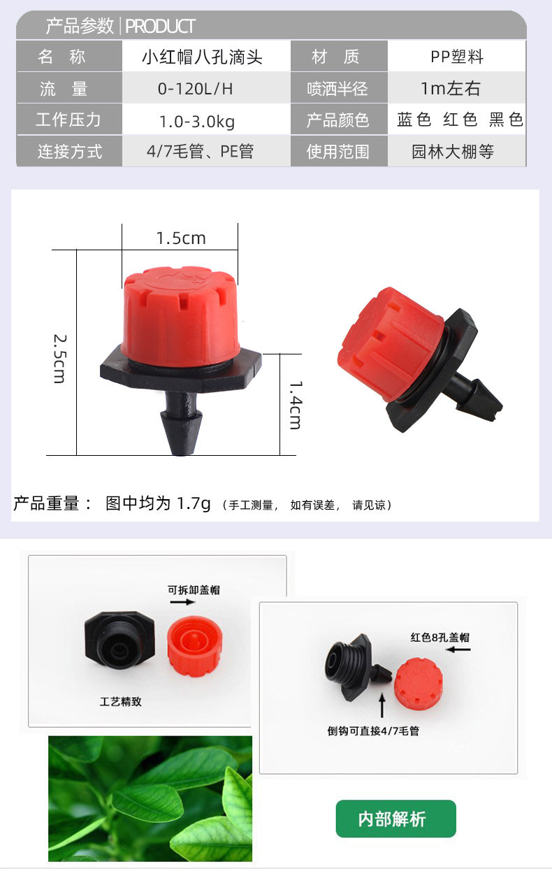 Agro agujero ajustable goteo pequeña gorra roja 8 agujeros rojo flujo ajustable goteo accesorios de tubería de riego por goteo de árboles frutales