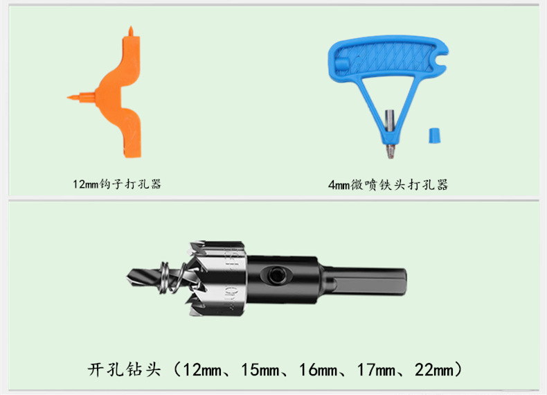 | Especificaciones | Perforador de cinturón blando 16, perforador de cinturón blando 20, perforador de cinturón blando 25, perforador de cinturón blando 30, perforador de gancho de 8 mm, perforador de gancho de 10 mm, perforador de gancho de 12 mm, perforador de tipo t de 8 mm, perforador de tipo t de 10 mm, perforador de tipo t de 12 mm, perforador de tipo t de 15 mm, perforador de tubo duro de 16 mm (azul), perforador de tubo duro de 16 mm (naranja), perforador de plástico completo de microinyección de 4 mm, perforador de cabeza de hierro de microinyección de 4 mm, perforador de perforación de agujero de 12 mm, perforador de perforación de agujero de agujero de 15 mm, perforador de agujero de 16 mm, perforador de agujero de taladro de perforación de taladro de 17 mm taladro perforado de 22 mm |