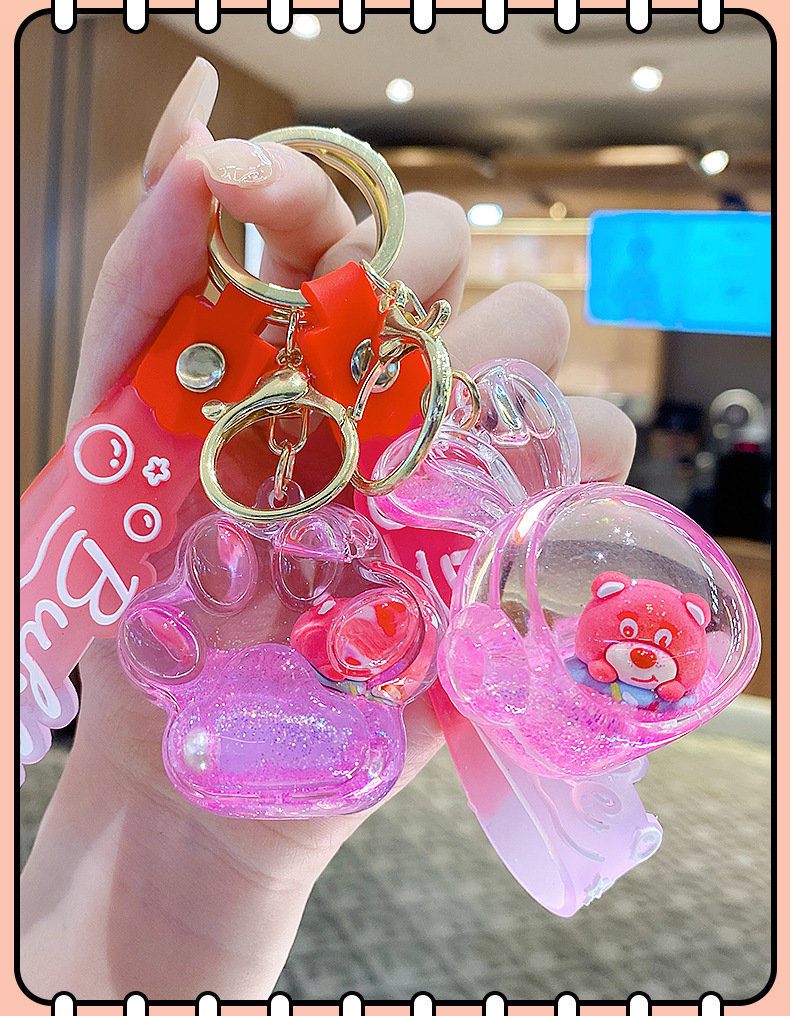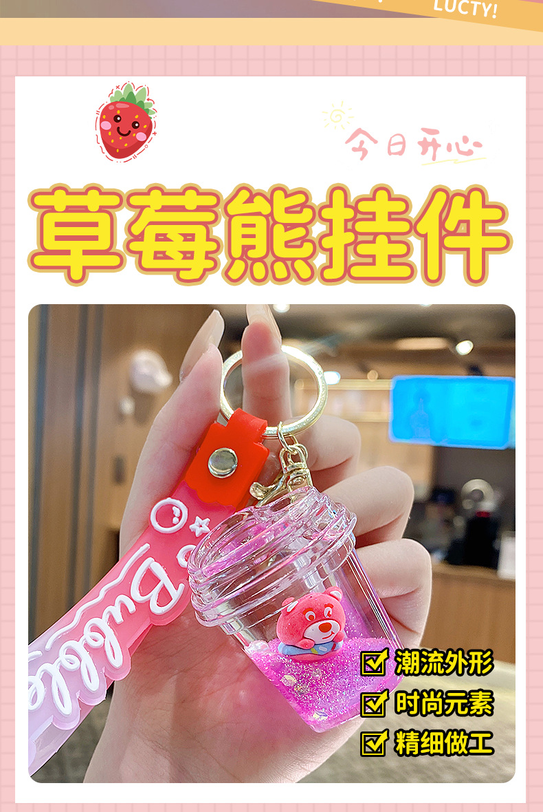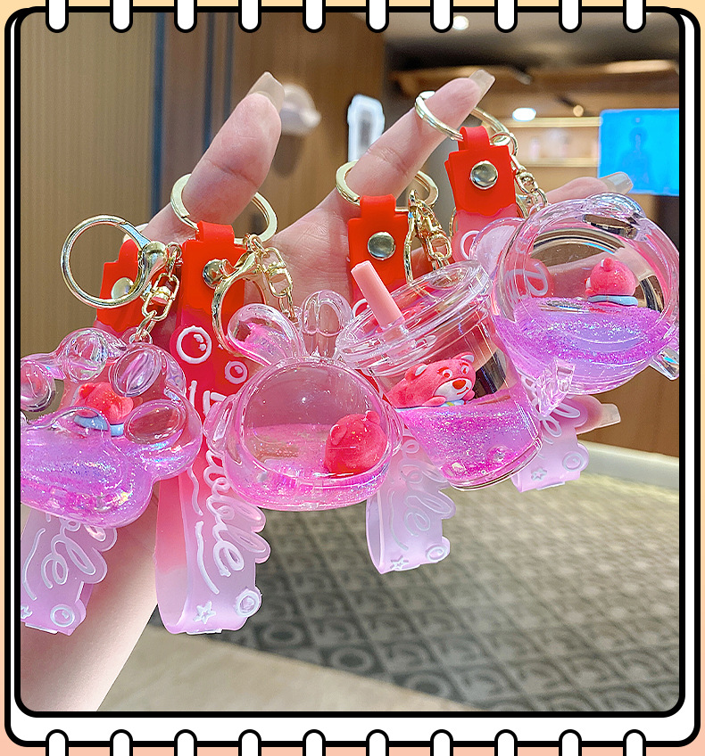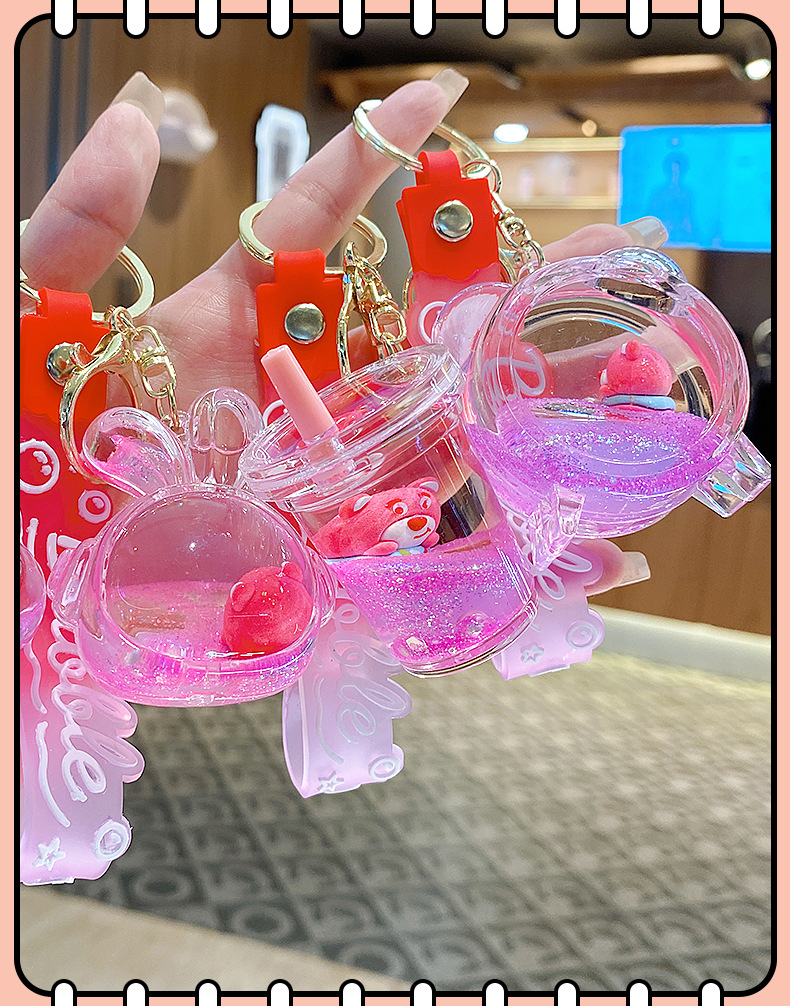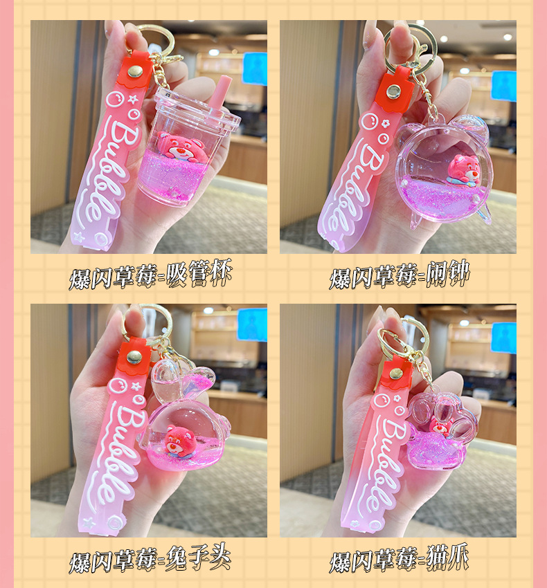 Botella de arena flotante de aceite flash fresas oso muñeca colgante llavero mochila para hombres y mujeres colgantes de automóviles pequeños regalos al por mayor