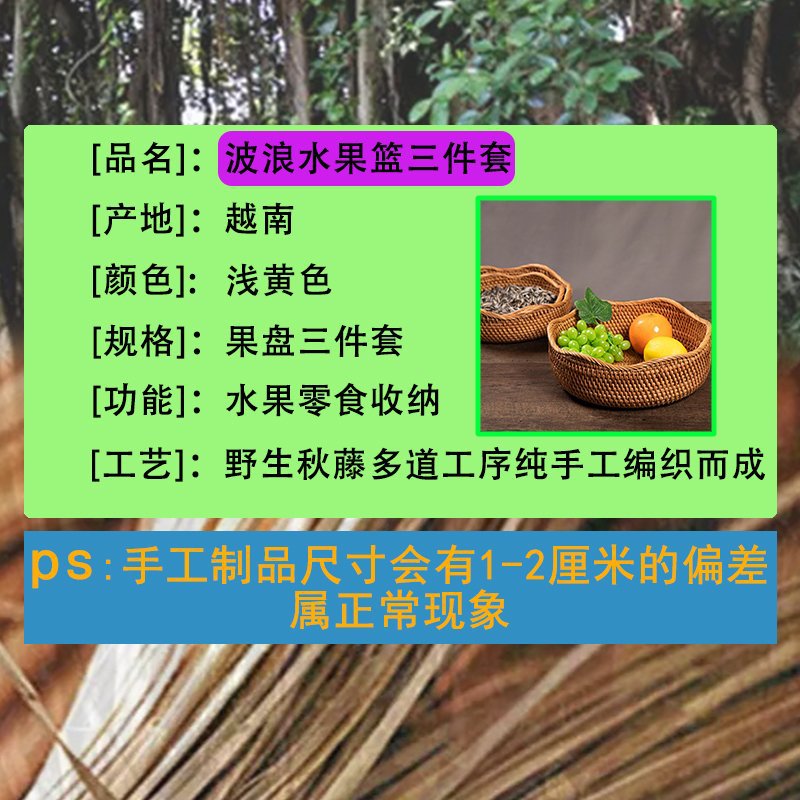 | Colores | Cesta de frutas de borde ondulado trompeta 22*6,Cesta de frutas de borde ondulado mediano 25*8,Canasta de frutas con borde ondulado grande 28*10,Juego de 3 piezas de borde ondulado azul fruta |