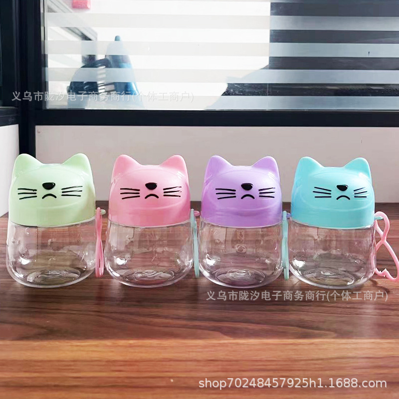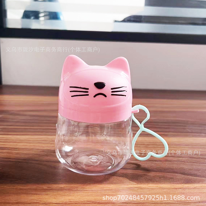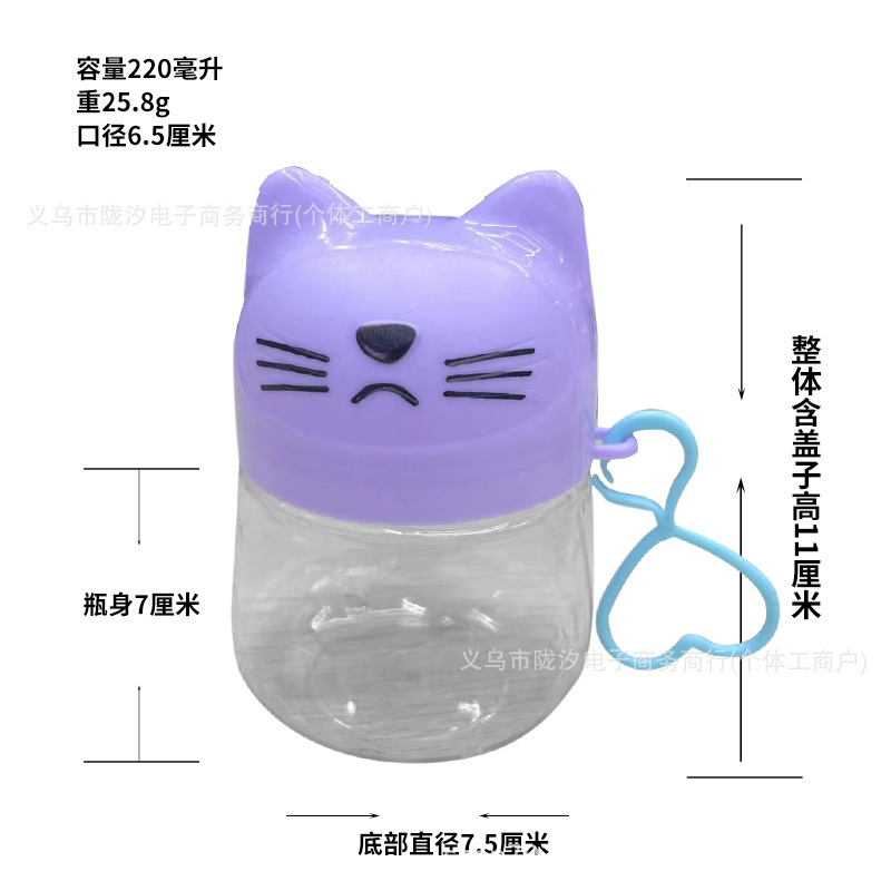 Gato de dibujos animados lindo botella de embalaje de plástico transparente de alimentos para mascotas de grado portátil caramelo con tapa soluble de frijol de color arcilla tarro lote