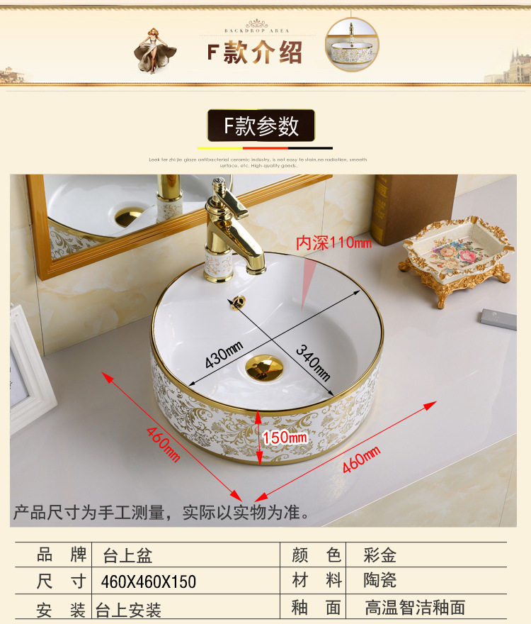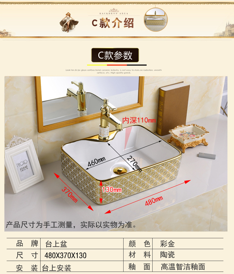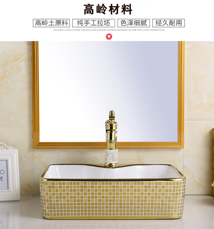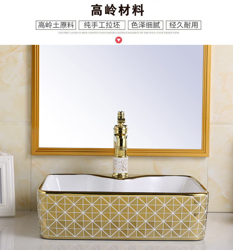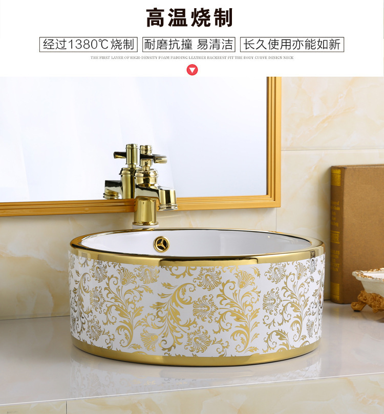 Exportación de alta temperatura color oro tablero lavabo lavabo de cerámica ligera de lujo fábrica de hotel lavabo galvanizado al por mayor