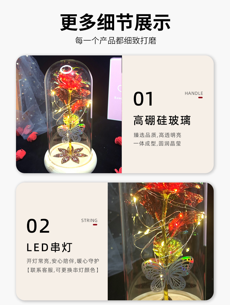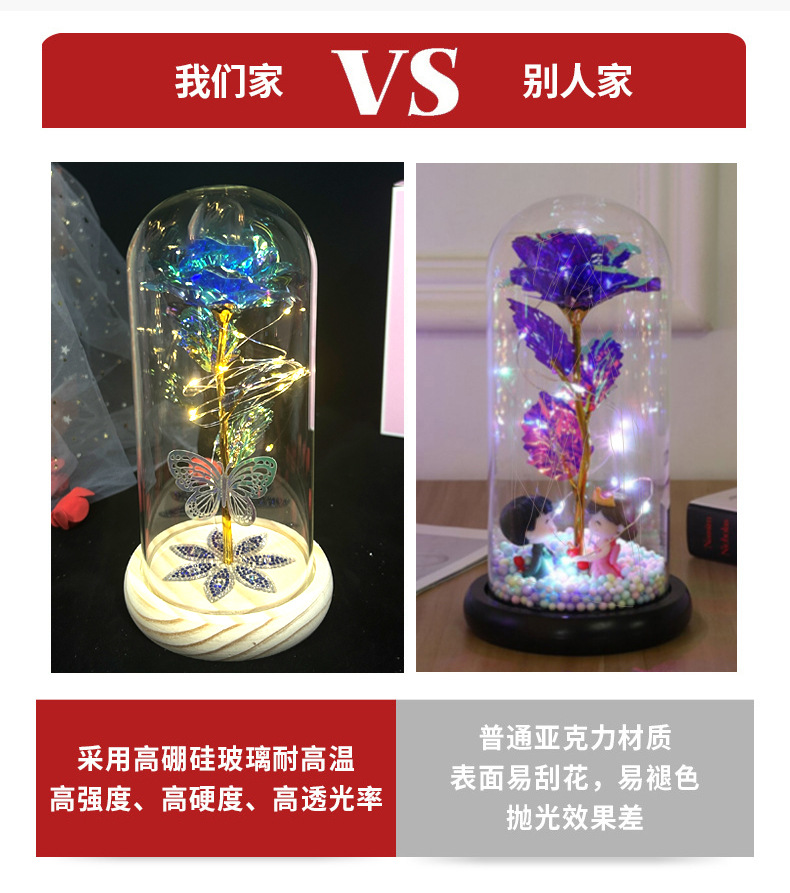 Cubierta de cristal de flor preservada, luz nocturna rosa de lámina dorada, 520, regalo de cumpleaños para el Día de San Valentín, adorno de Navidad