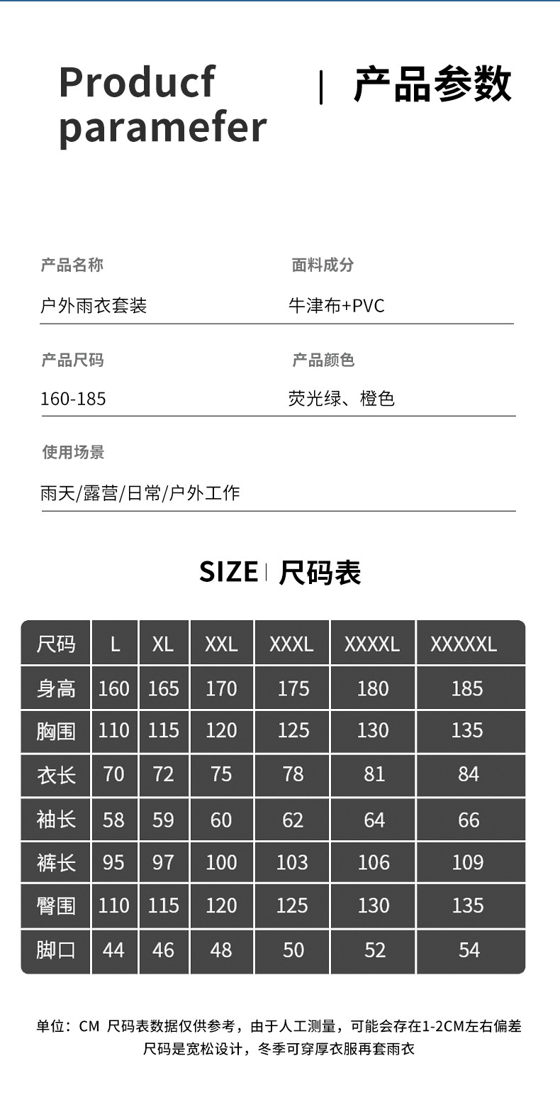 | Color | Pantalones de lluvia amarillo fluorescente (algodón), naranja (algodón), amarillo fluorescente (normal) con pantalones de lluvia, naranja (normal) con pantalones de lluvia |