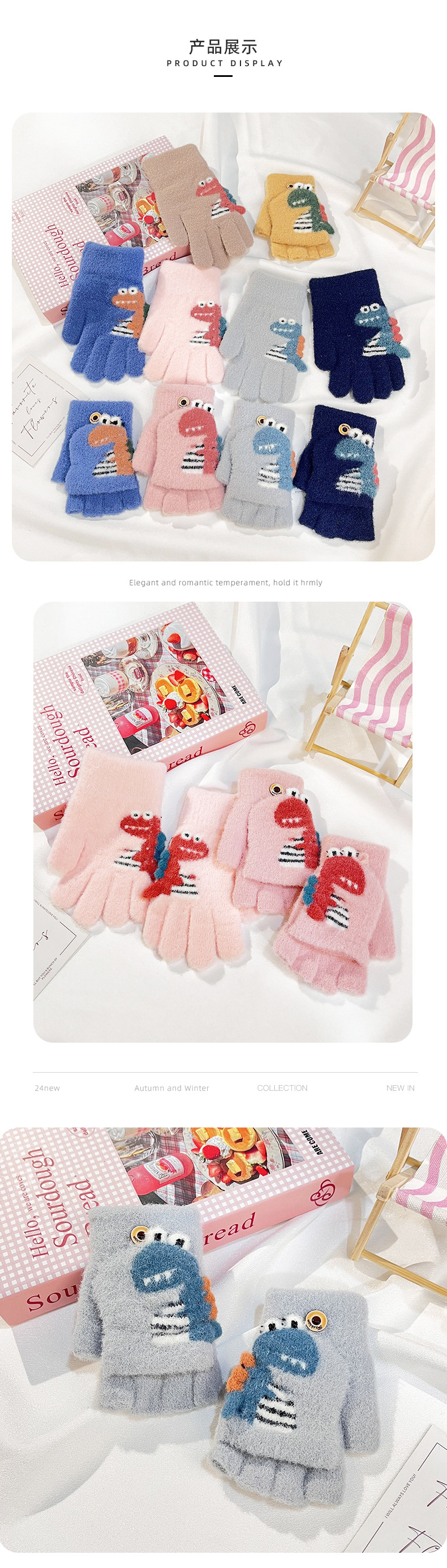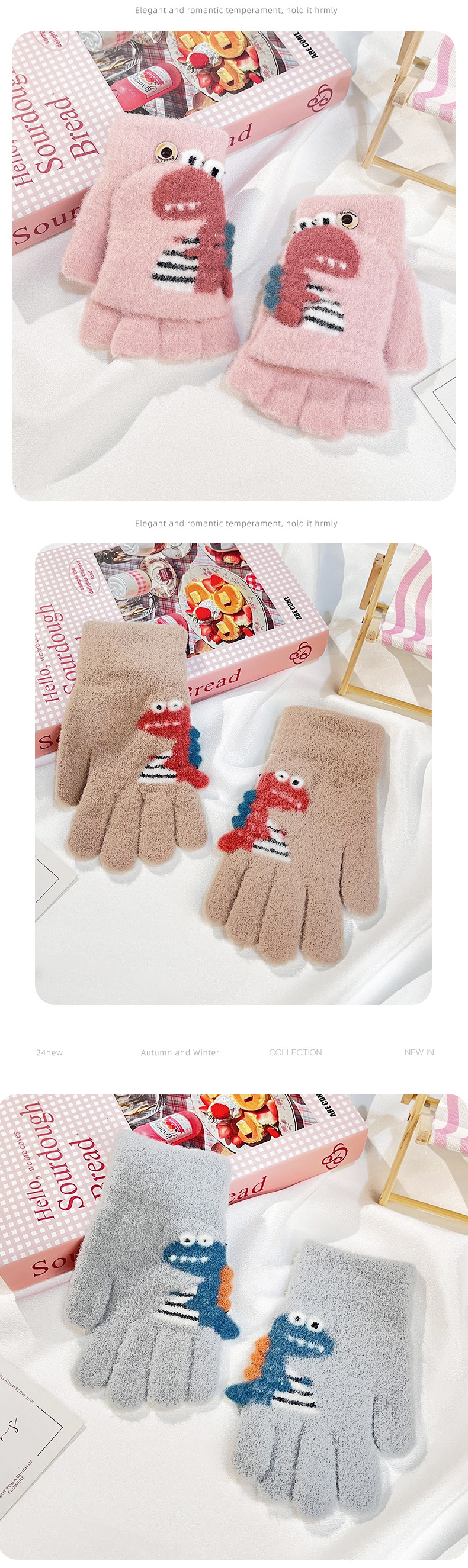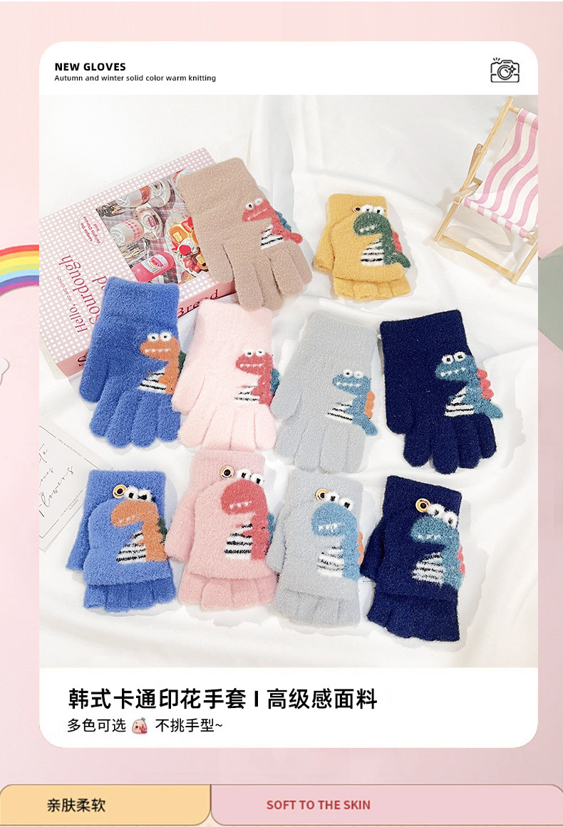 Impresión de dibujos animados coreanos dinosaurios guantes de niños lindos ociosos tejidos gruesos flip-up escritura guantes de cinco dedos