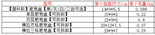 | Color | [Plástico] Jabón Caja [Negro/gris/Blanco/Tres colores opcionales],Gris-caja de jabón de una sola capa [desmontable],Negro-caja de jabón de una sola capa [desmontable],Brillante-caja de jabón de una sola capa [desmontable],Gris-caja de jabón de doble capa [desmontable],Negro-caja de jabón de doble capa [desmontable],Brillante-caja de jabón de doble capa [desmontable],Caja de jabón gris-horizontal de doble rejilla [desmontable],Negro-caja de jabón de doble rejilla horizontal [desmontable],Caja de jabón brillante-horizontal de doble rejilla [desmontable],Caja de jabón gris-horizontal de tres rejillas [desmontable],Caja de jabón de tres rejillas negro-horizontal [desmontable] |