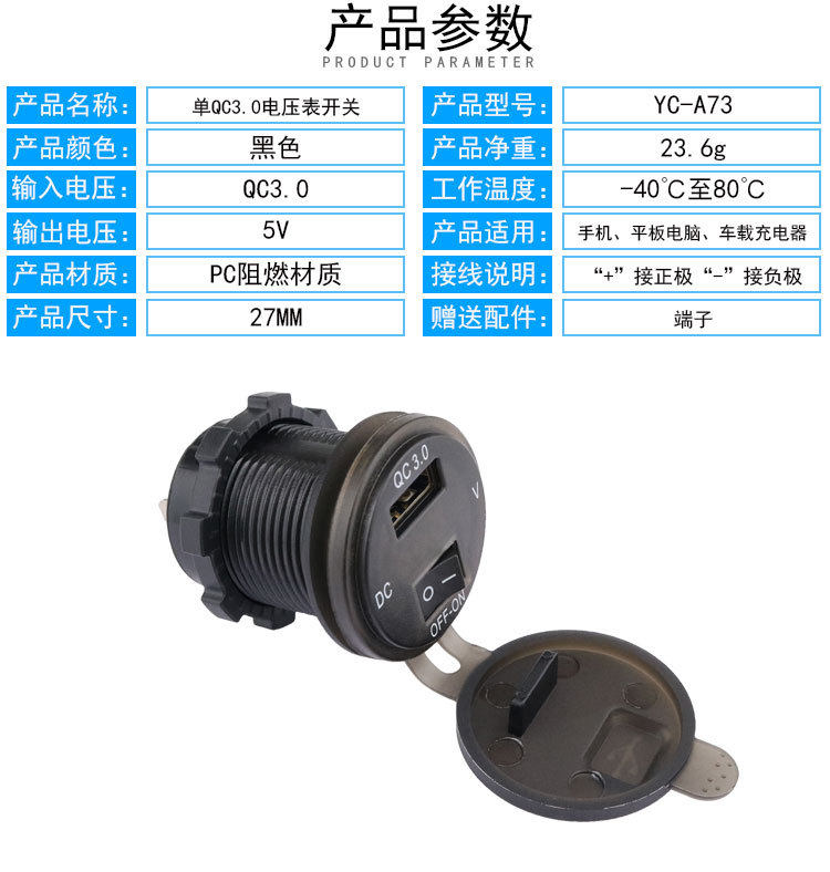 | Especificaciones | Doble usb con cubierta de voltaje ancho 9 - 90V adecuado para enviar terminales aislados, doble usb rojo cuadrado con cubierta deslizante con cableado de alimentación, doble usb azul cuadrado con cubierta deslizante con cableado de alimentación, doble usb verde cuadrado con cubierta deslizante con cableado de alimentación, voltímetro rojo de carga rápida QC con cubierta, voltímetro verde de carga rápida QC con cubierta, voltímetro azul de carga rápida QC con cubierta, voltímetro rojo de carga rápida QC con cubierta, voltímetro rojo de carga rápida QC con cubierta, Con cubierta QC de carga rápida un solo voltímetro USB verde + entrega de apertura, con cubierta QC de carga rápida un solo voltímetro USB azul + entrega de apertura, con cubierta doble usb de voltaje ancho 9 - 90V aplicable + entrega de apertura, 1.5 cable de alimentación |