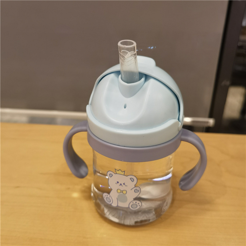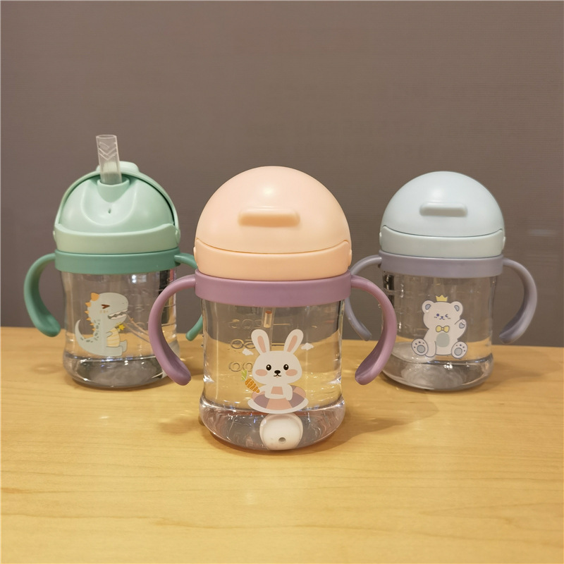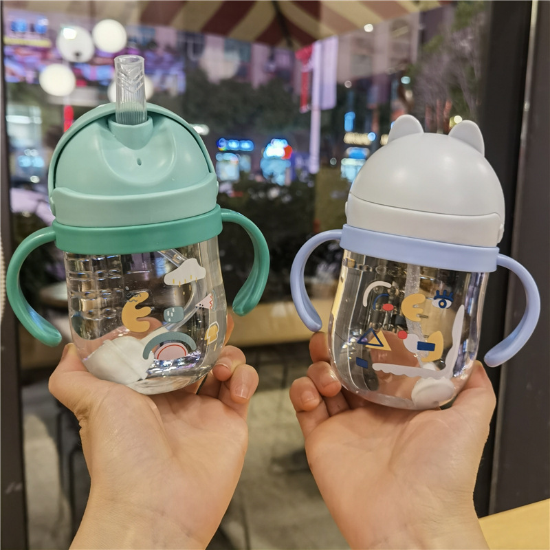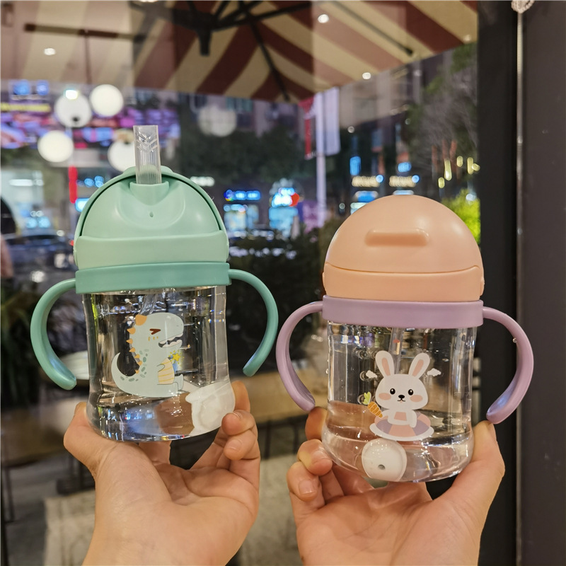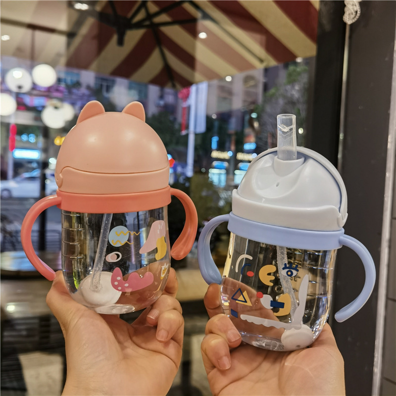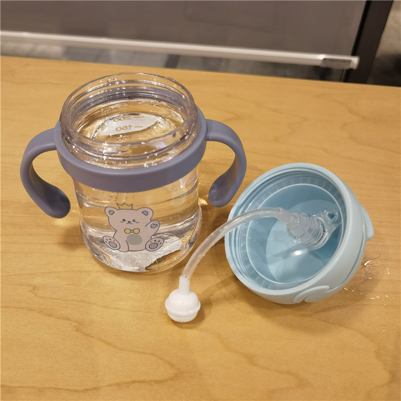 2023 bebé boquilla de succión en forma de V taza de bebida lindo bebé de dibujos animados anti-estrangulamiento Bola de gravedad taza de paja mango