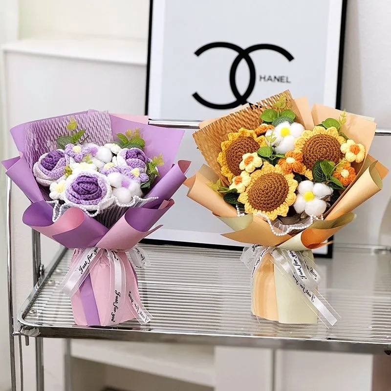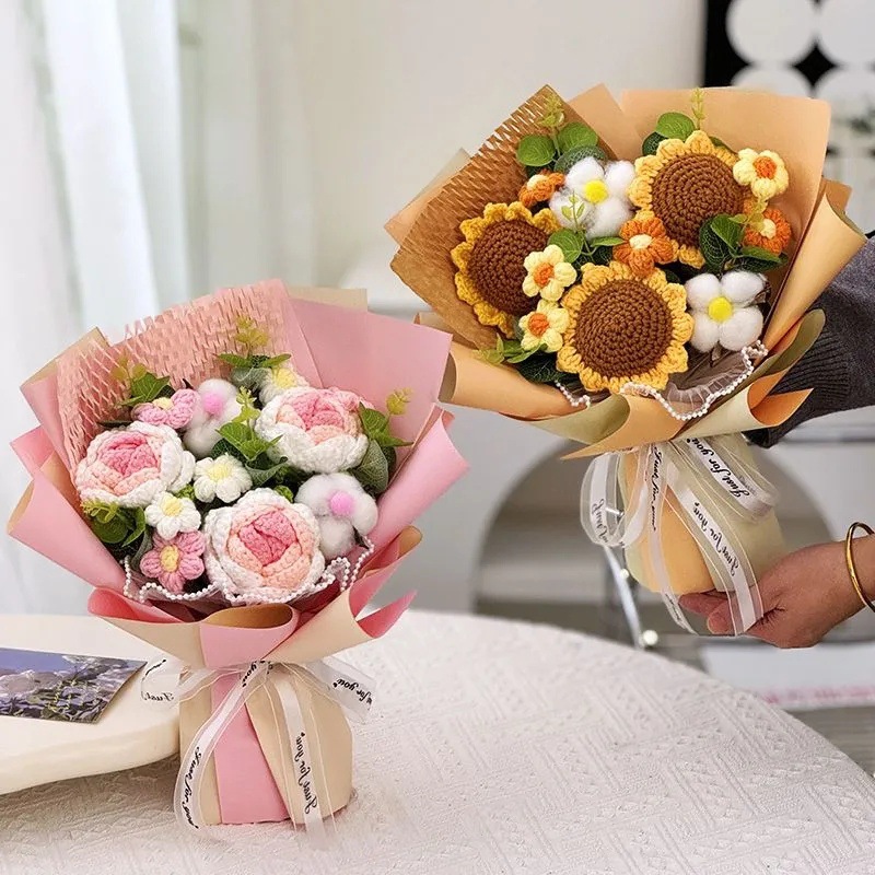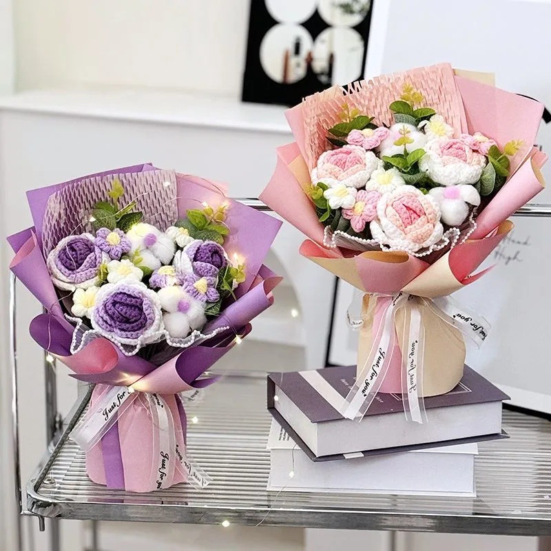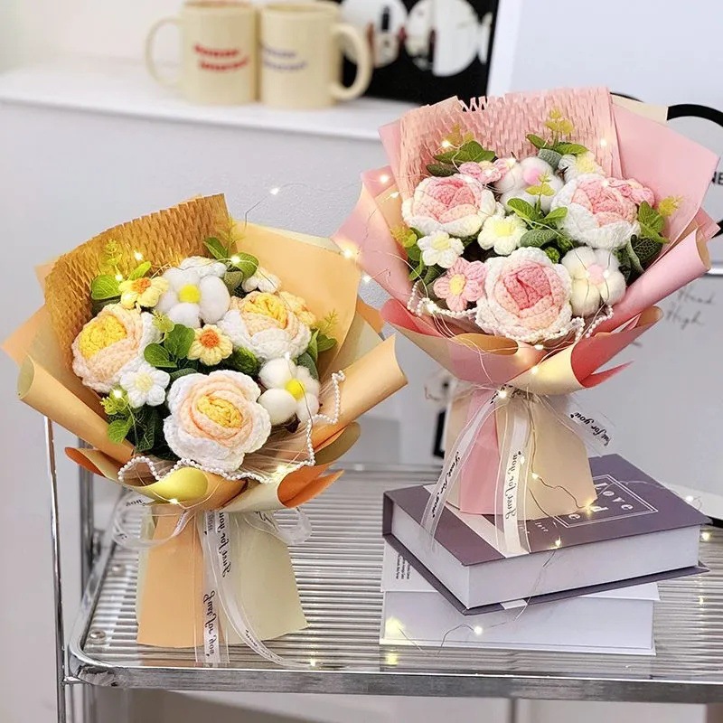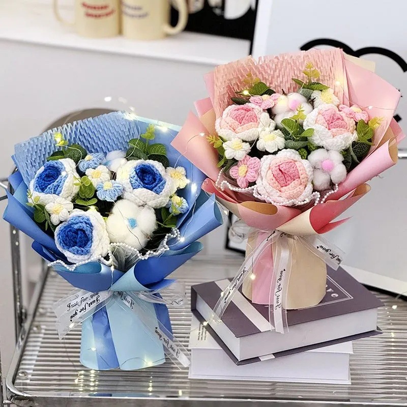 Ramo terminado de rosas tejidas a mano transfronterizas, flor de lana, regalo de cumpleaños para novia, amigo, madre