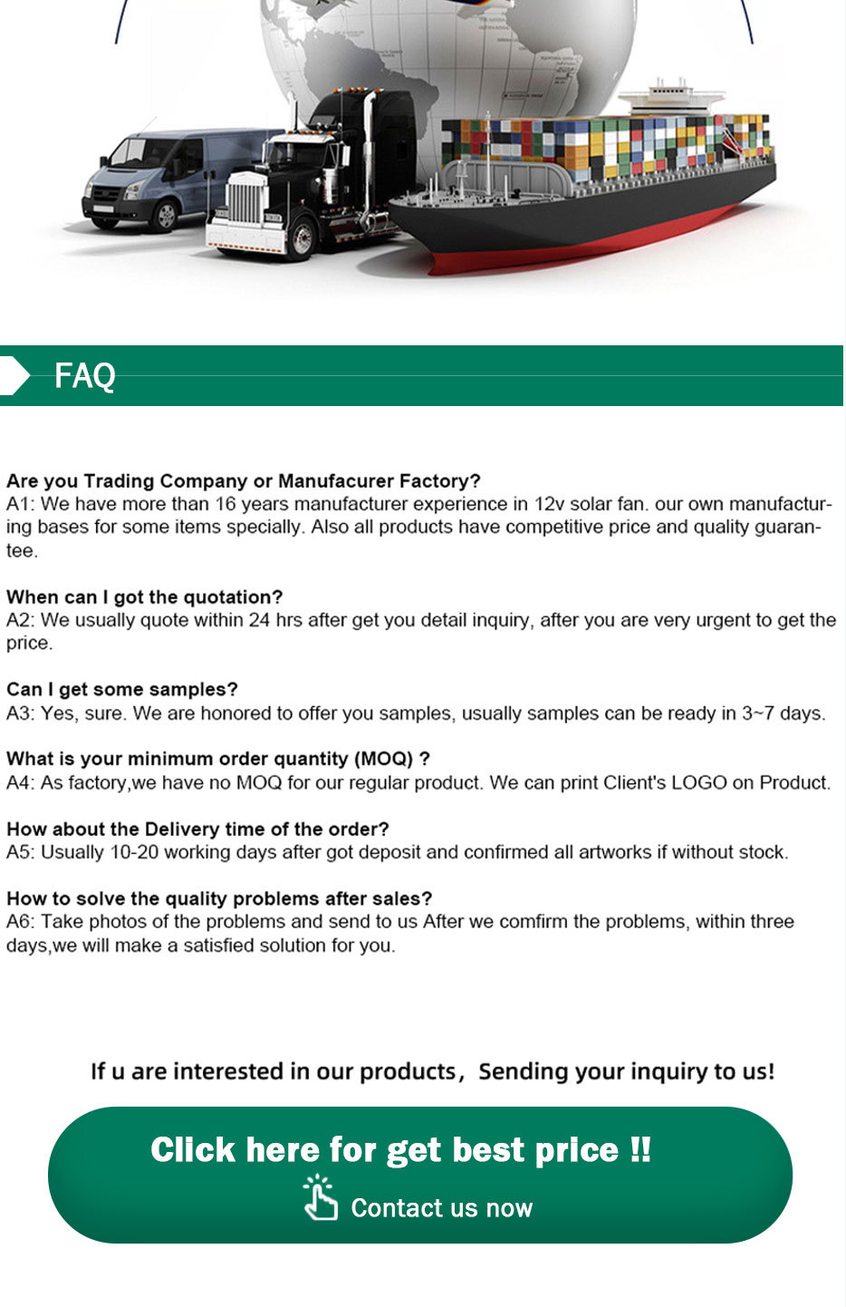 Ofrecemos cotización integrada con precios EXW (recogida en fábrica) o FOB (entrega en puerto de salida)