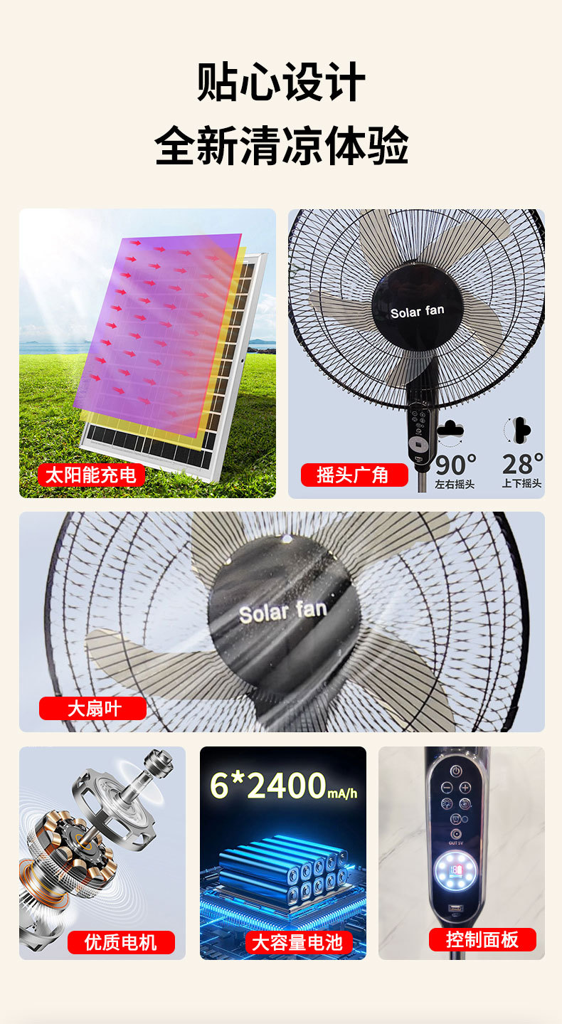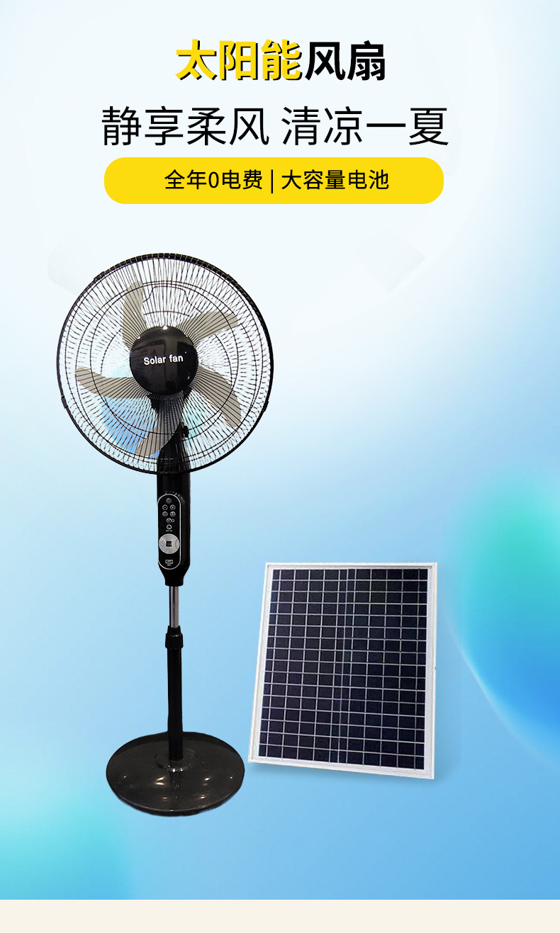 Ventilador de carga de viento grande solar para exteriores Ventilador de piso de control remoto doméstico Ventilador de motor sin escobillas para interiores transfronterizos