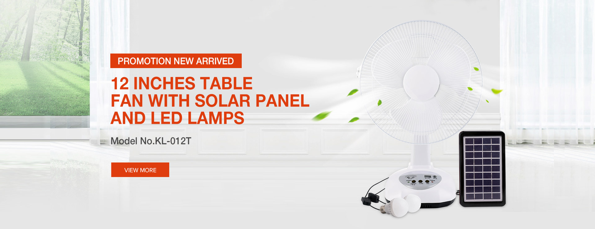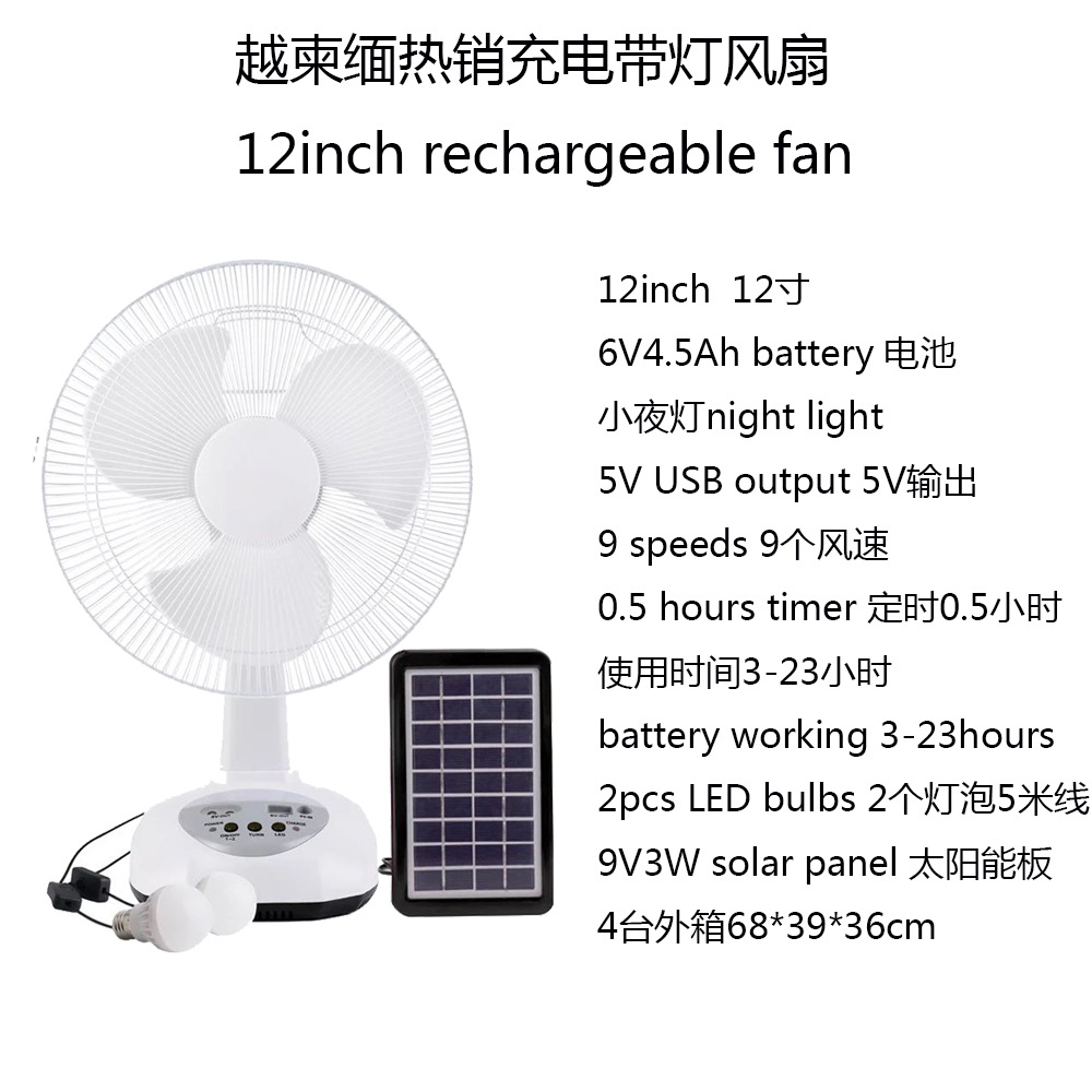 Ventilador recargable solar de 12 pulgadas más vendido del sudeste asiático con paquete de promoción de bombilla de panel solar de 3W, gran volumen de aire