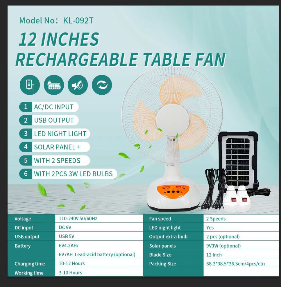 Ventas calientes de Oriente Medio y Sudeste Asiático 12 pulgadas de tres hojas 6V ventilador de carga multifuncional con una sola unidad de carga solar