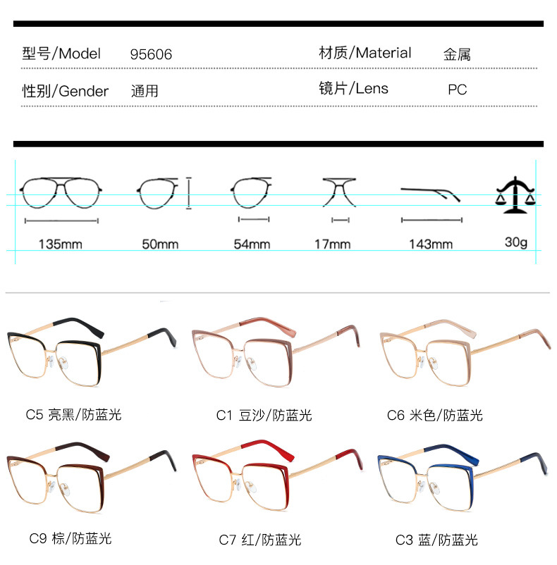 95606 nuevo metal anti-azul gafas de luz estilo europeo y americano gafas lisas transfronterizo marco artístico gafas para las mujeres en stock