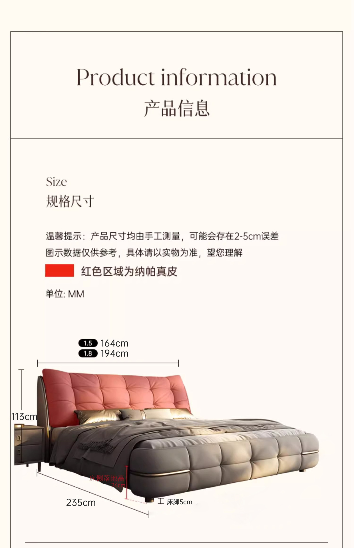 TamañoCama individual 1.5 * 2 m (sin colchón), cama individual 1.8 * 2 m (sin colchón), cama 1.5 * 2 m + colchón de coco de cresta, cama 1.8 * 2 m + colchón de coco de cresta, cama 1.5 * 2 m + colchón de látex natural, cama 1.8 * 2 m + colchón de látex natural