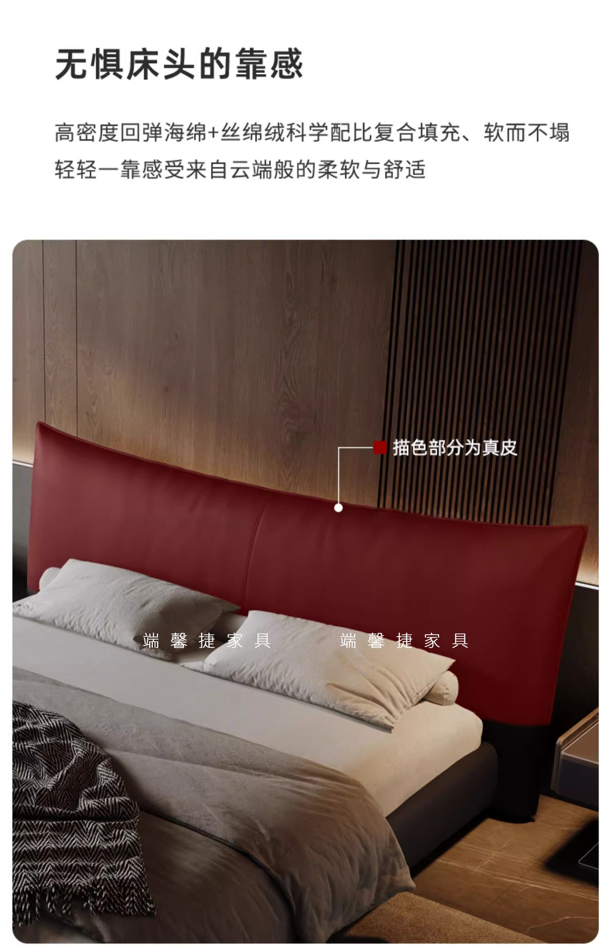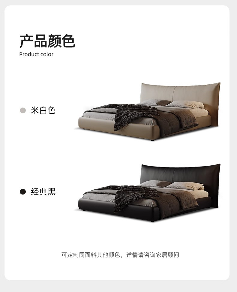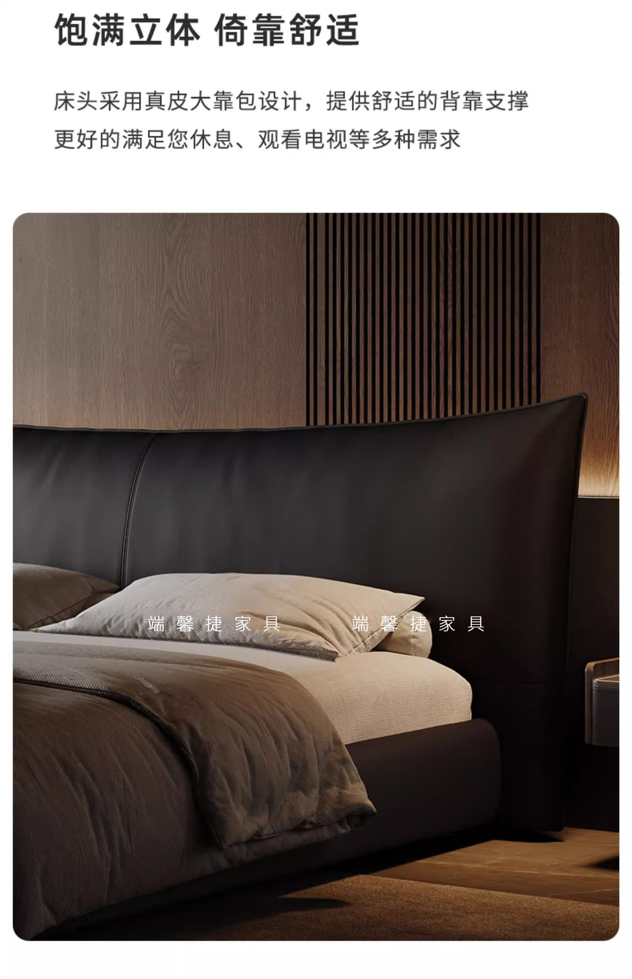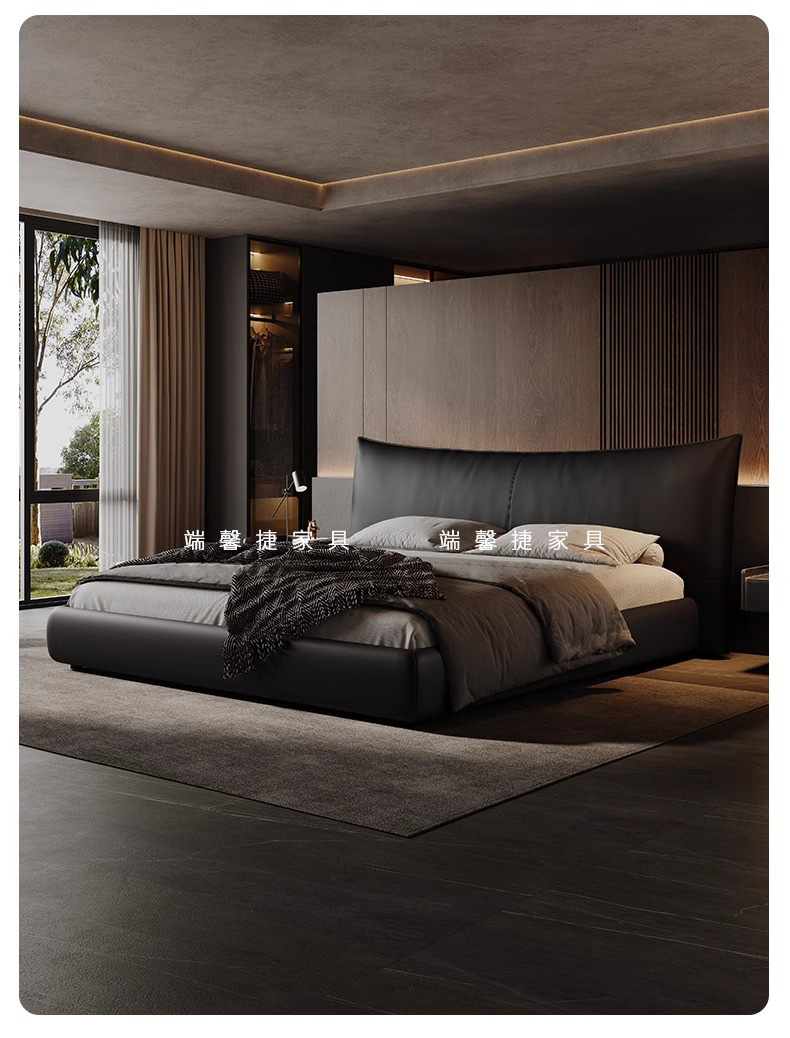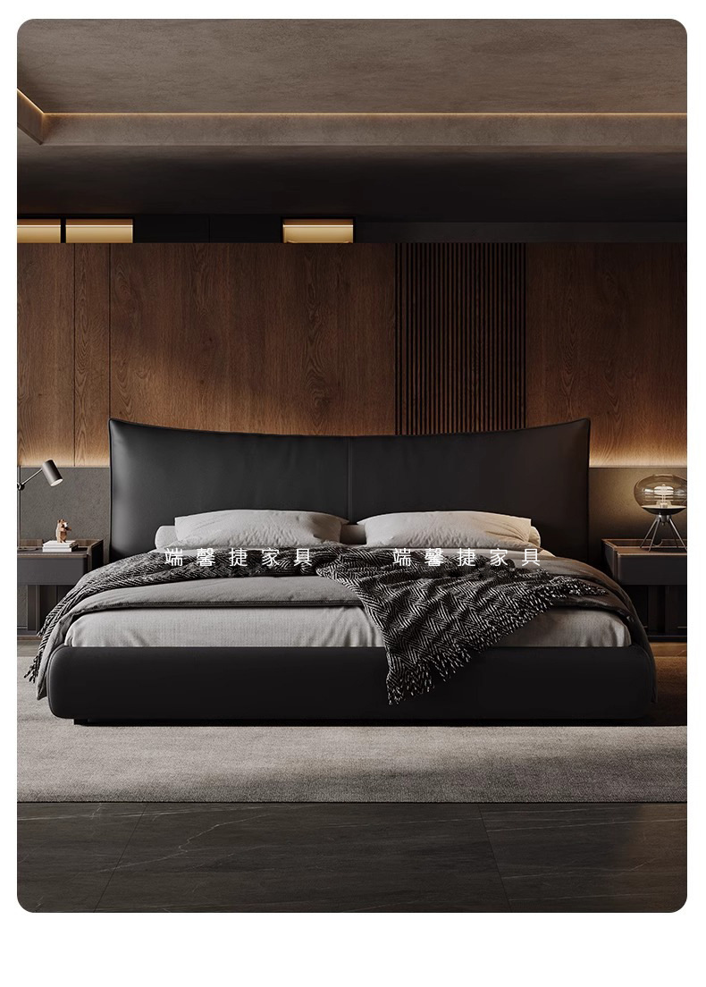 Cama de cuero minimalista italiana Chanel, primera capa de cuero de vaca, cama doble, cama de cuero suave negra de 1.8 m