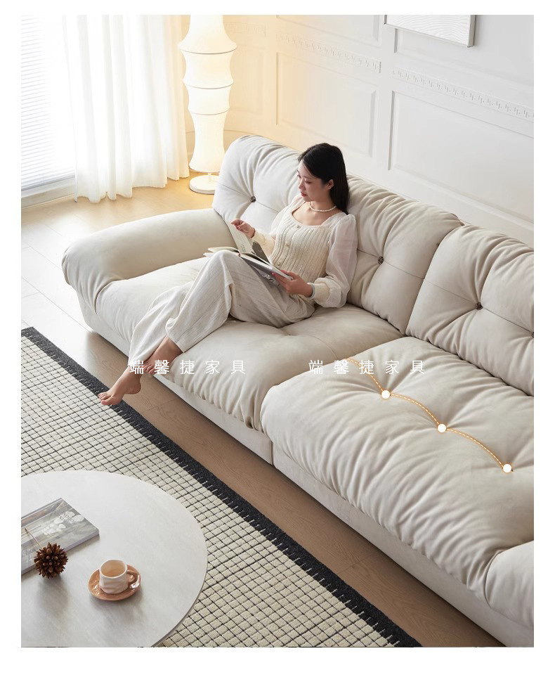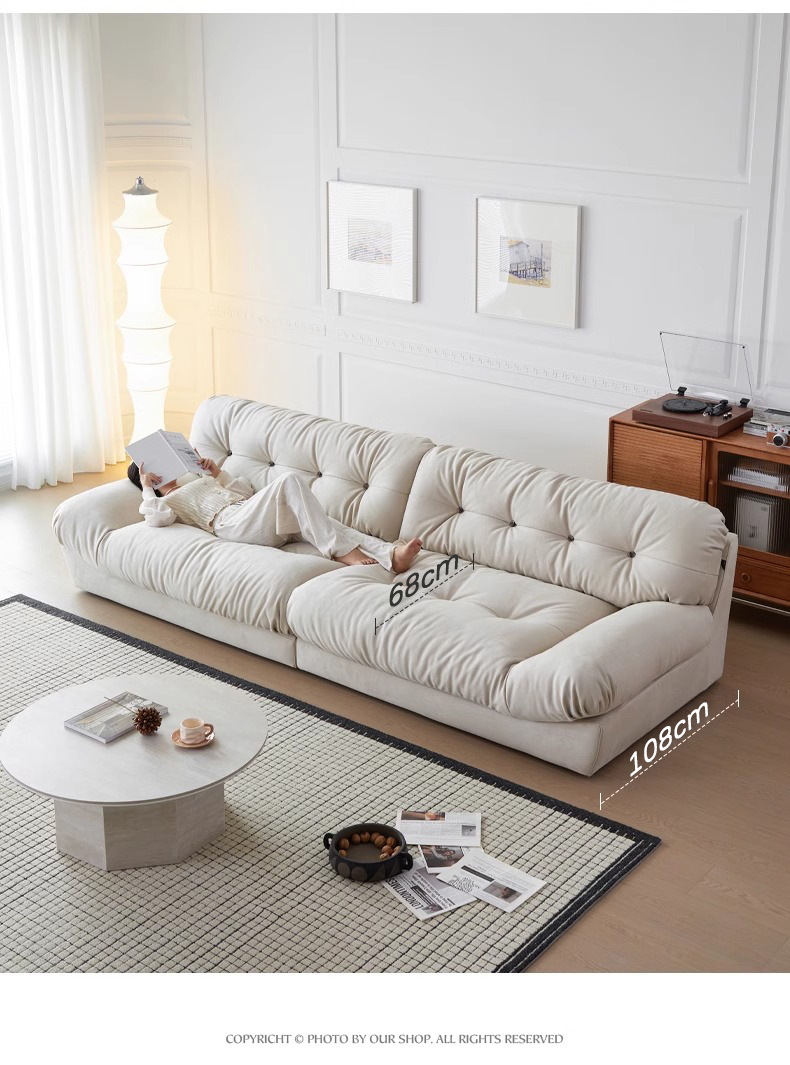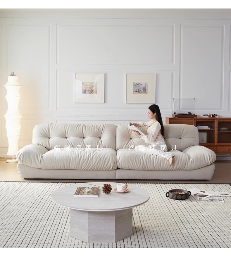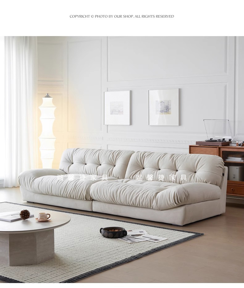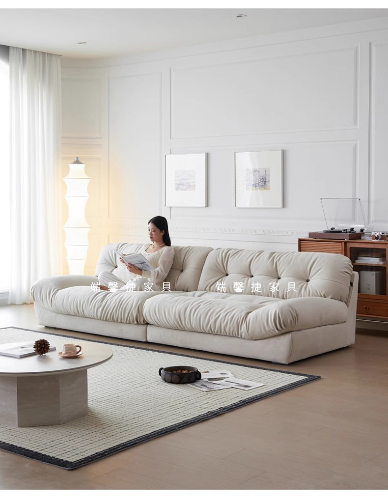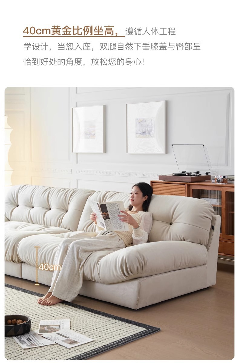 Sofá de nube línea recta crema estilo retrógrado anti-cat tela esmerizada pluma sofá de tres personas