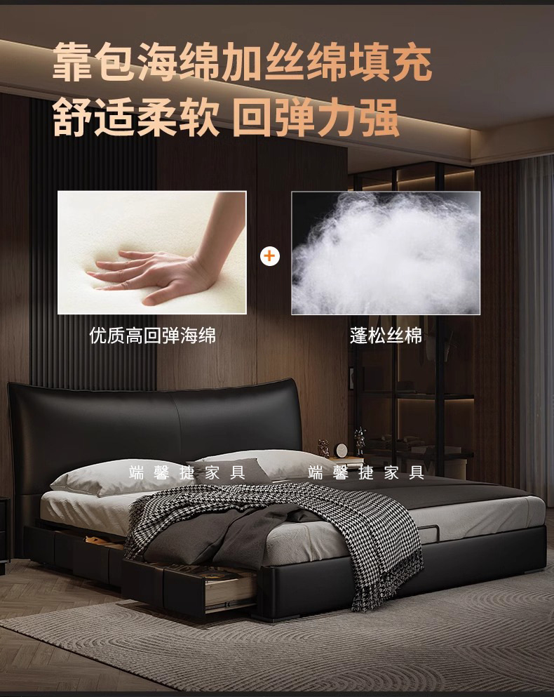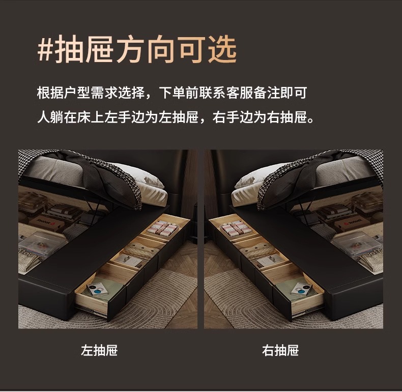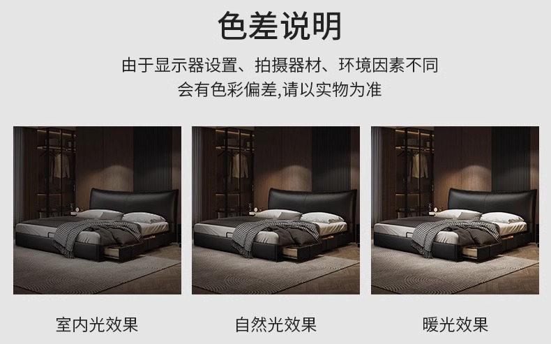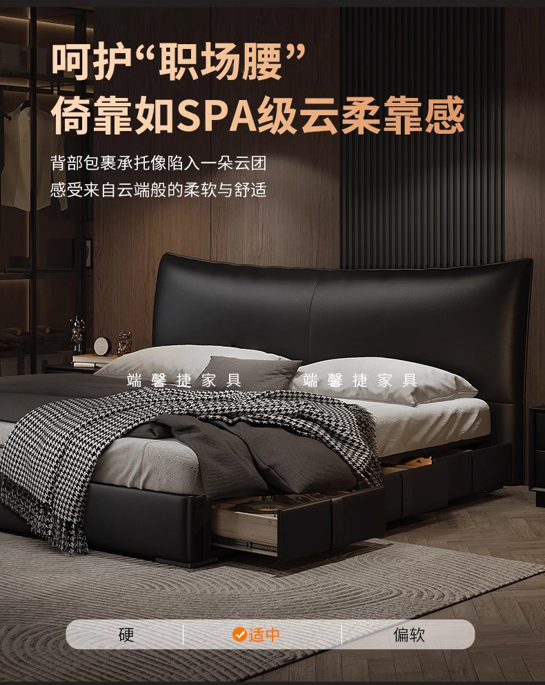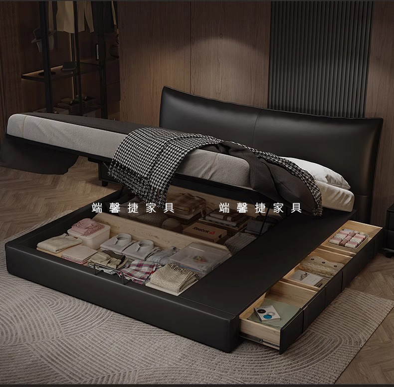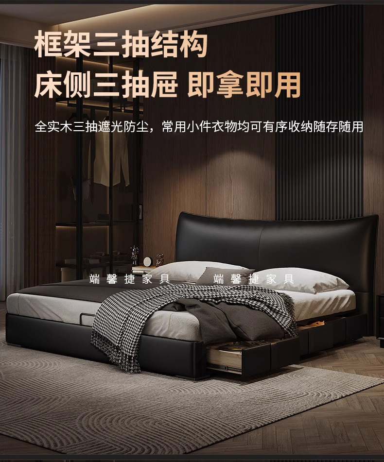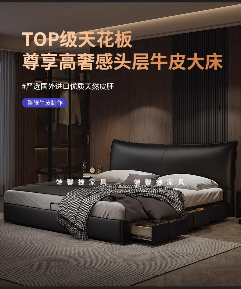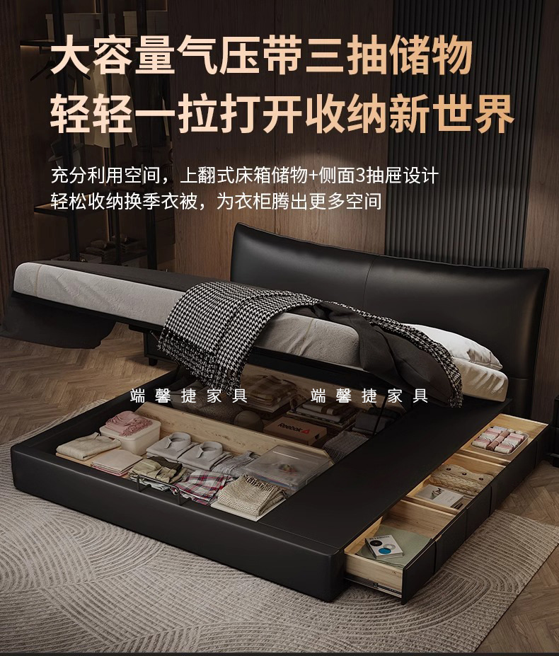 Cama de cuero, cama principal de cuero de vaca, cama de almacenamiento de tres extracciones, cama doble moderna y simple.
