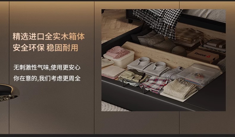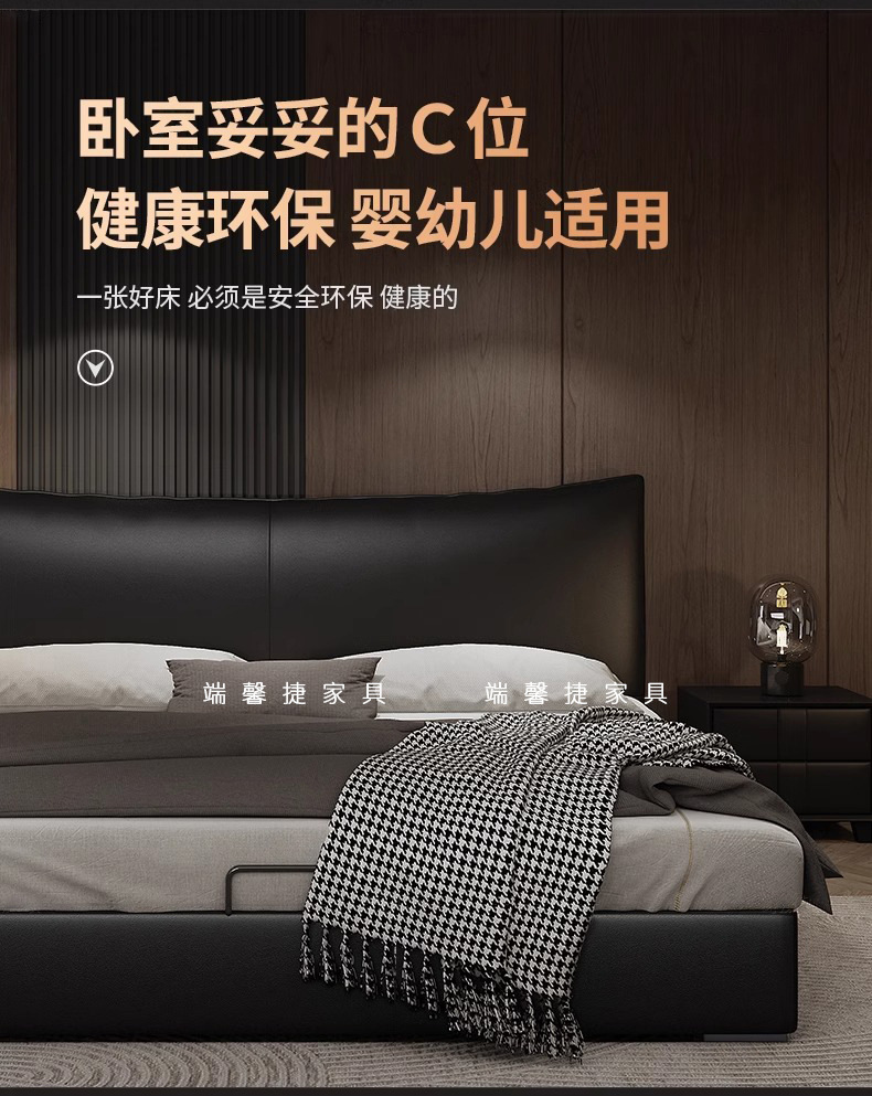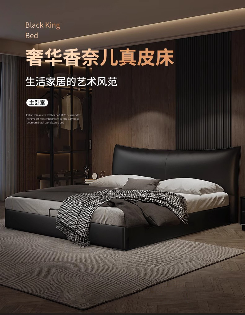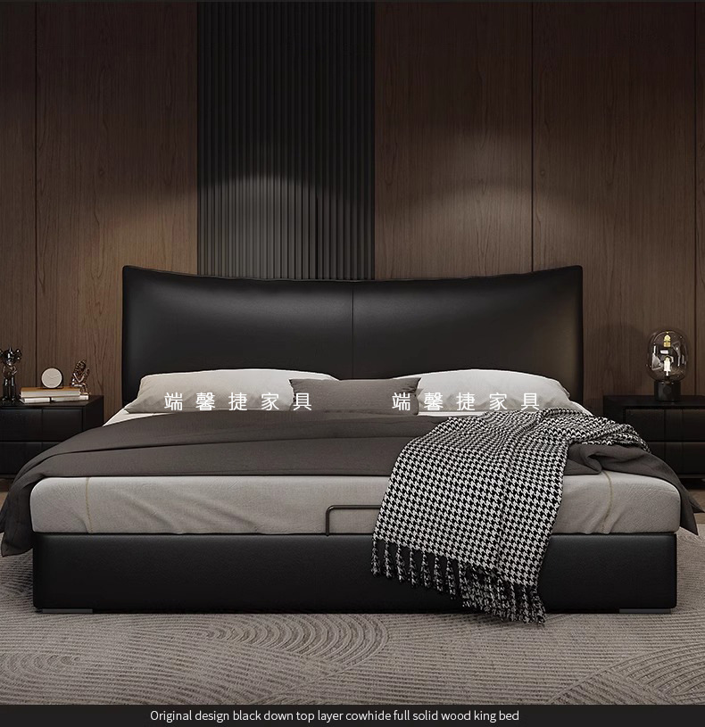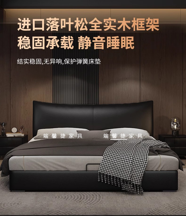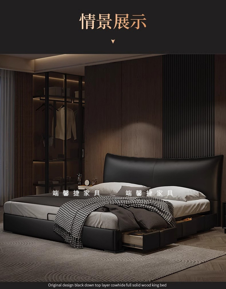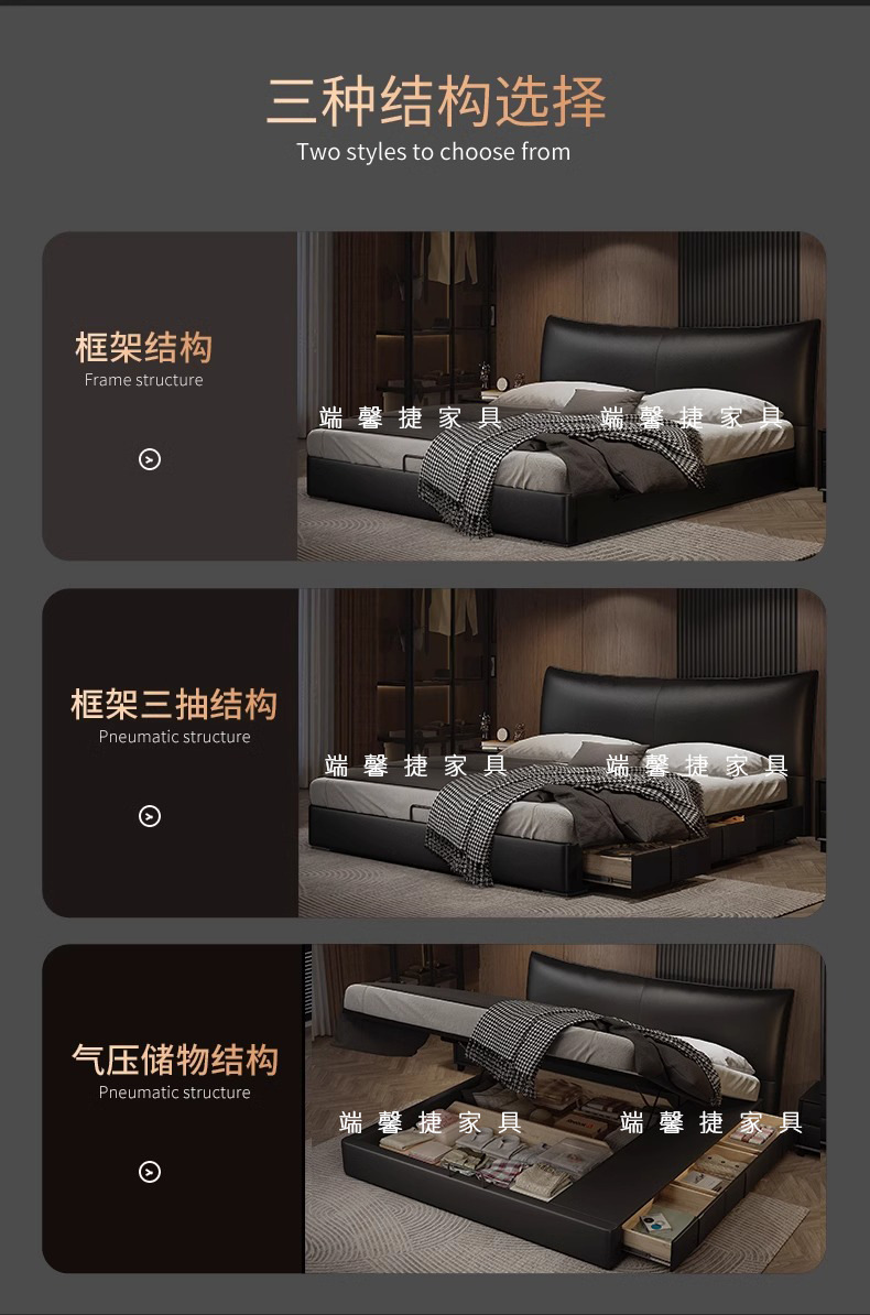 Cama de cuero, cama principal de cuero de vaca, cama de almacenamiento de tres extracciones, cama doble moderna y simple.