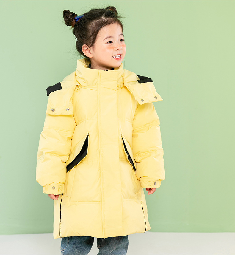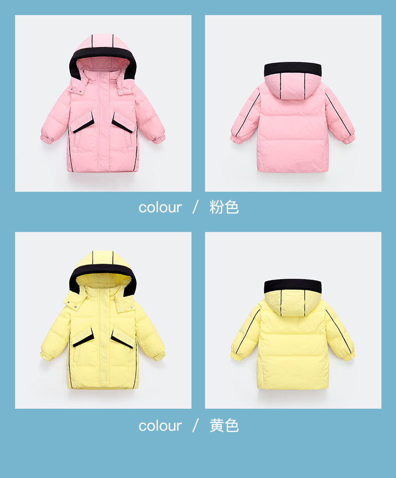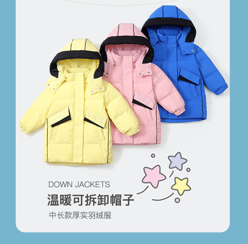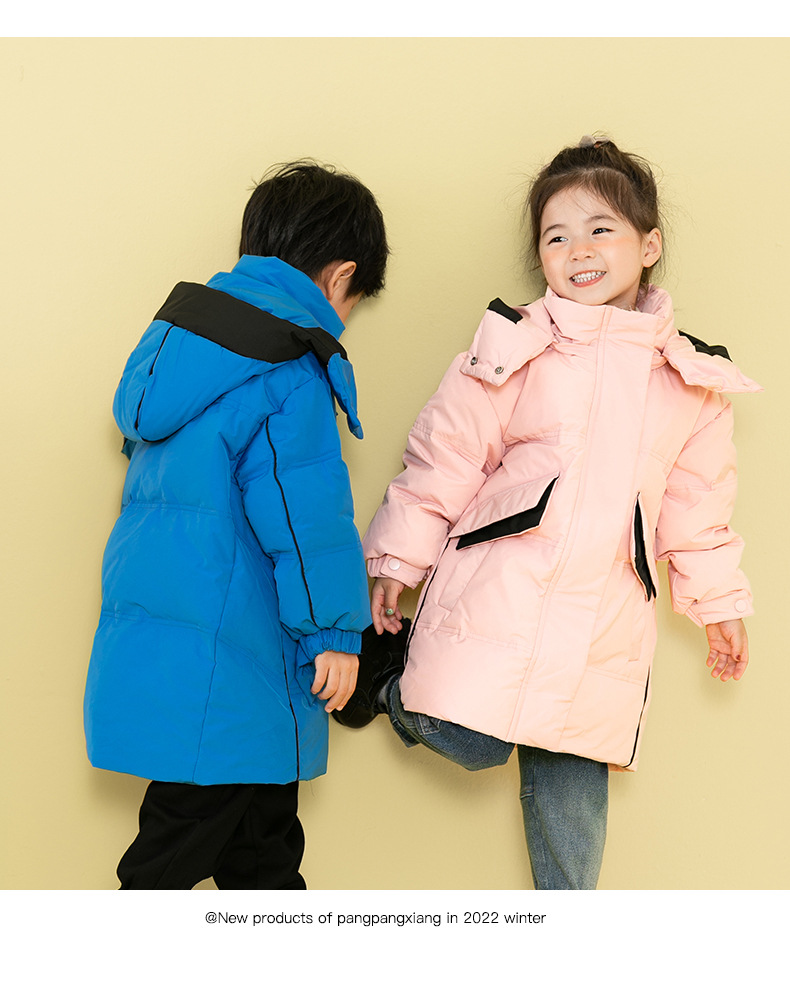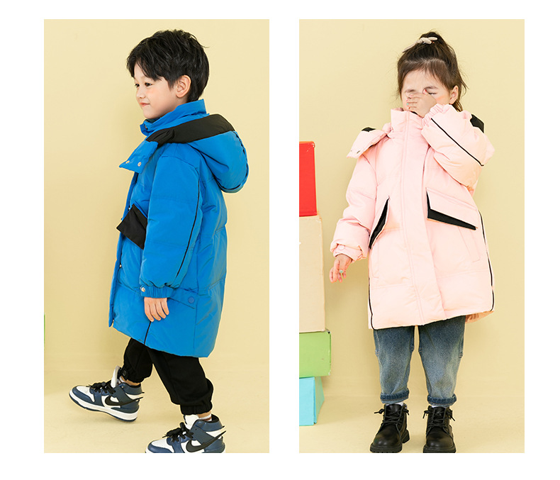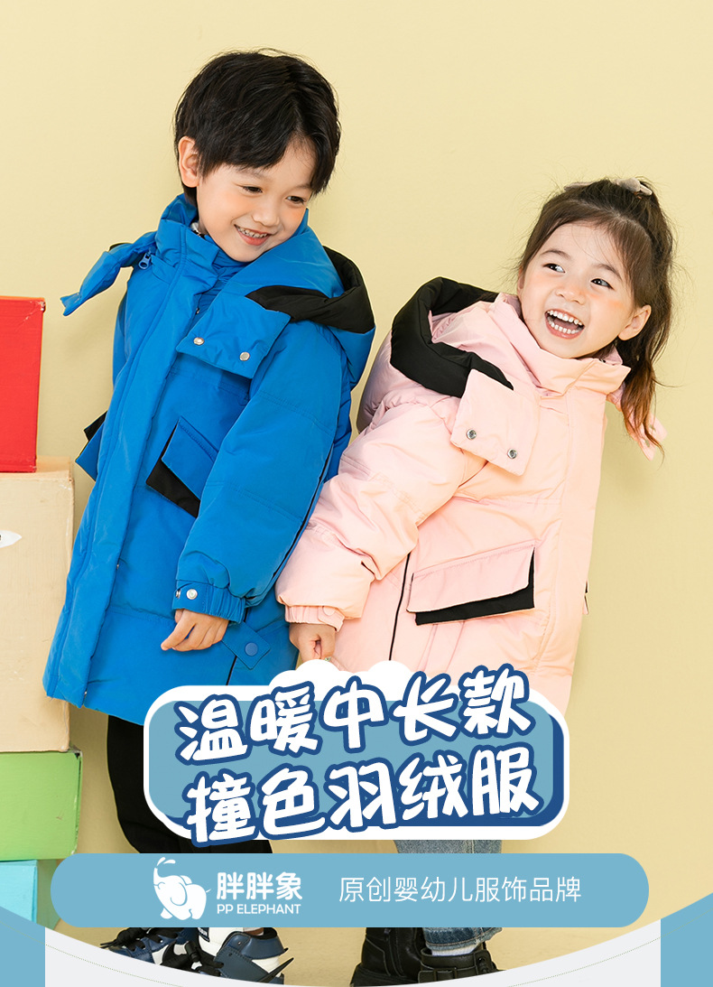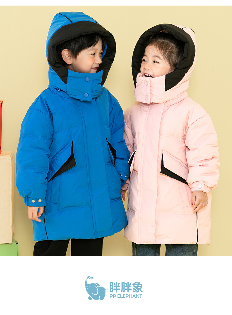 Chubby elefante invierno niños y niñas ropa infantil chaqueta infantil mediana y grande para niños color a juego con capucha cálido pato blanco abajo abrigo largo