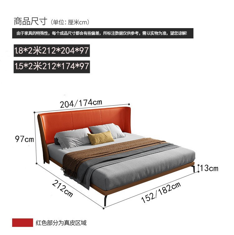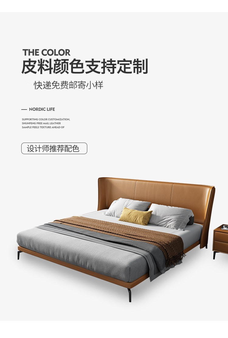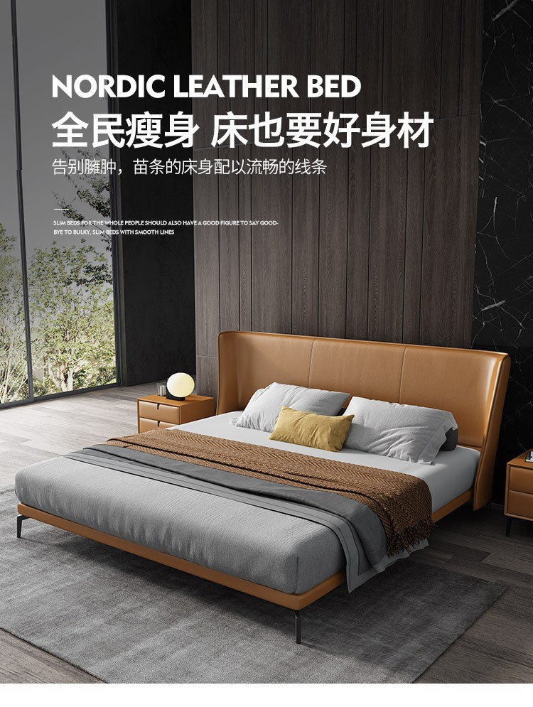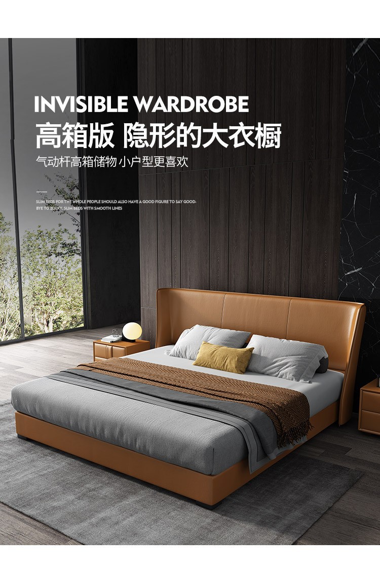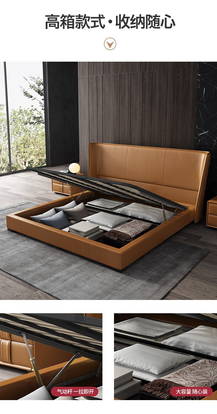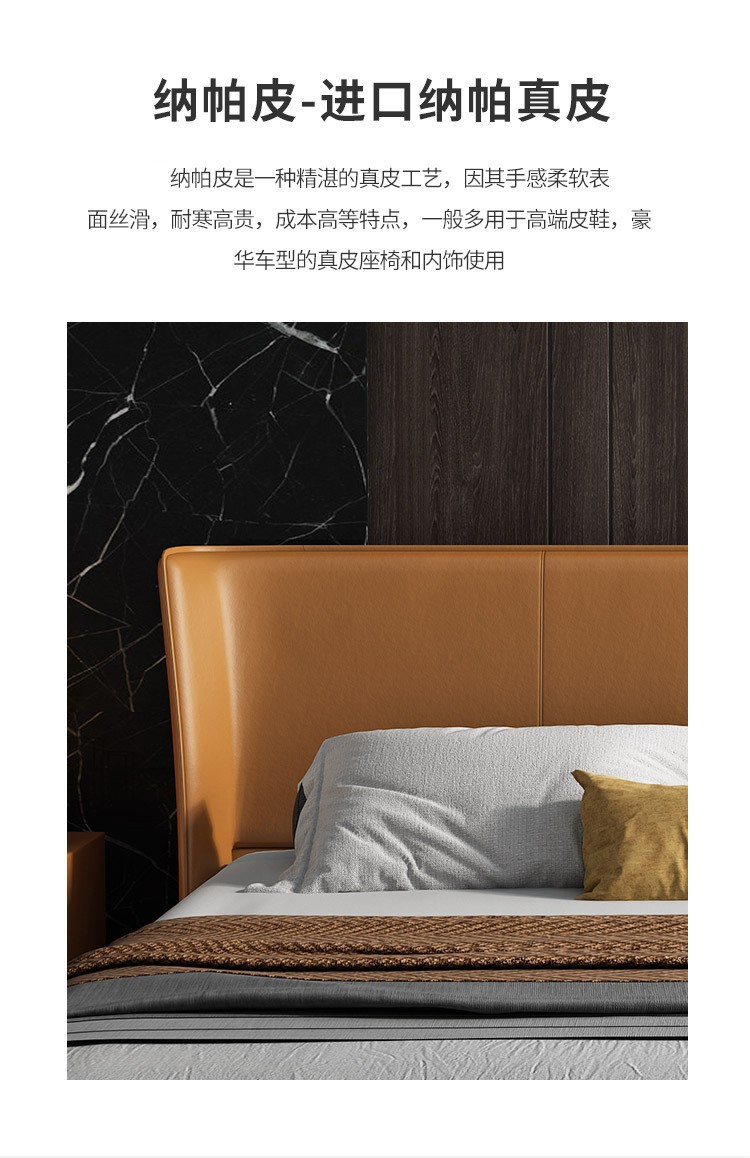 Cama de cuero real minimalista italiano moderno dormitorio principal minimalista cama naranja de gama alta elegante diseñador cama doble cama de boda