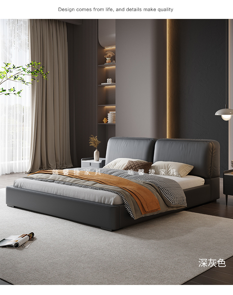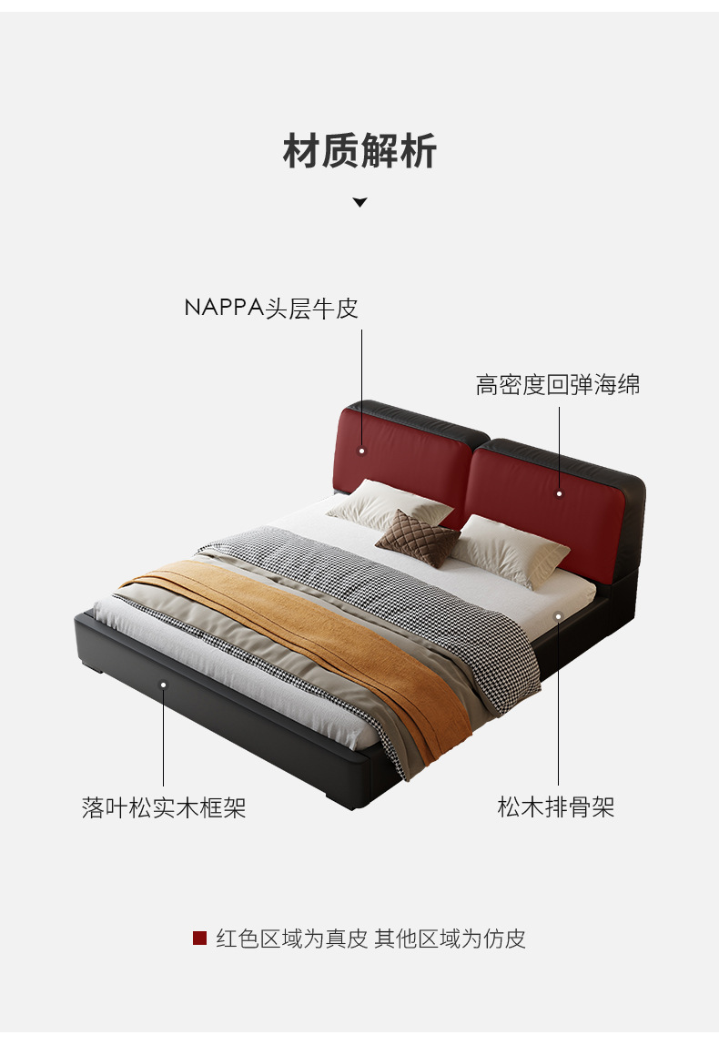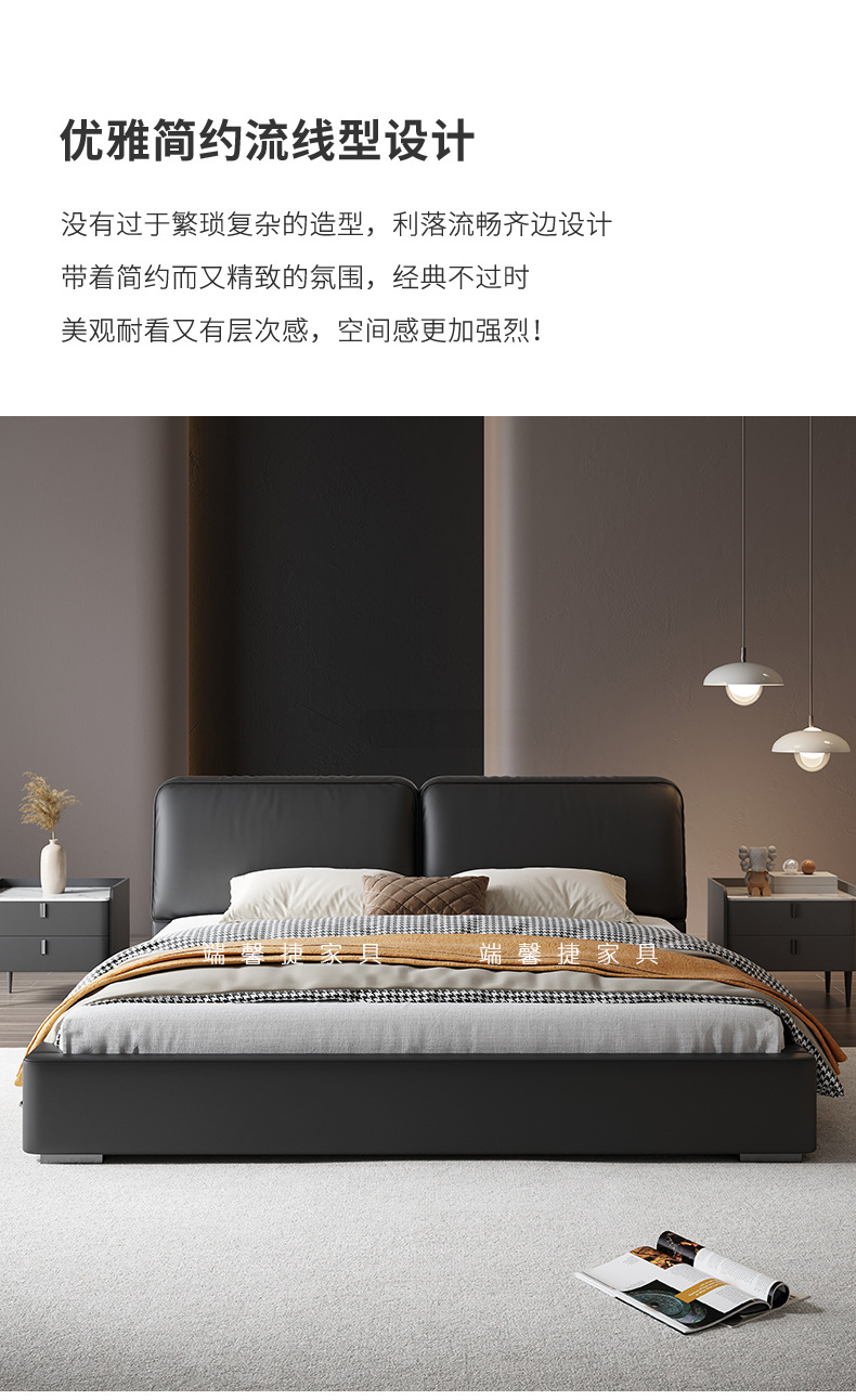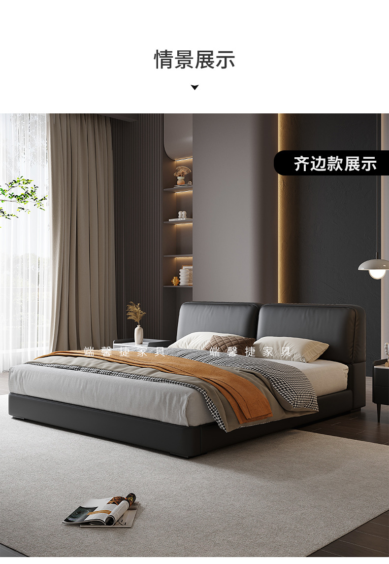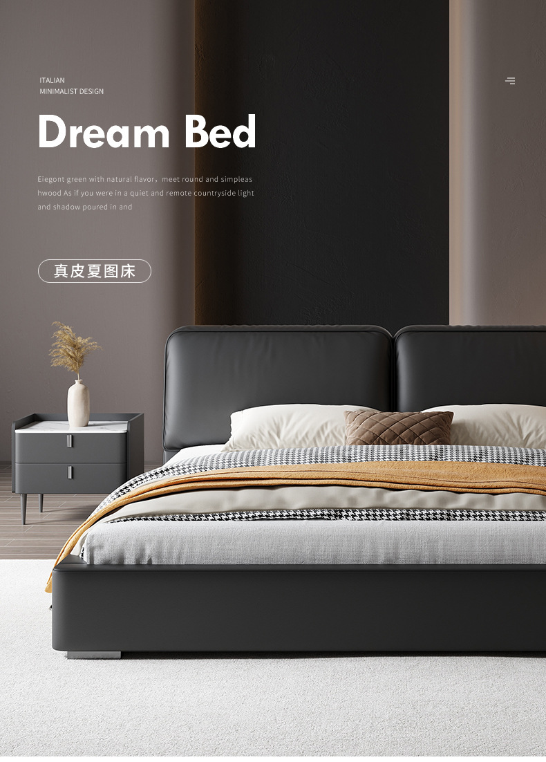 Imagen de verano cama de cuero genuino italiano minimalista gran vaca negra cuadrada cama doble 1,8 m Cama grande piso simple cama de boda negro
