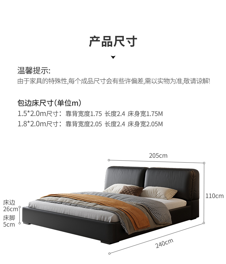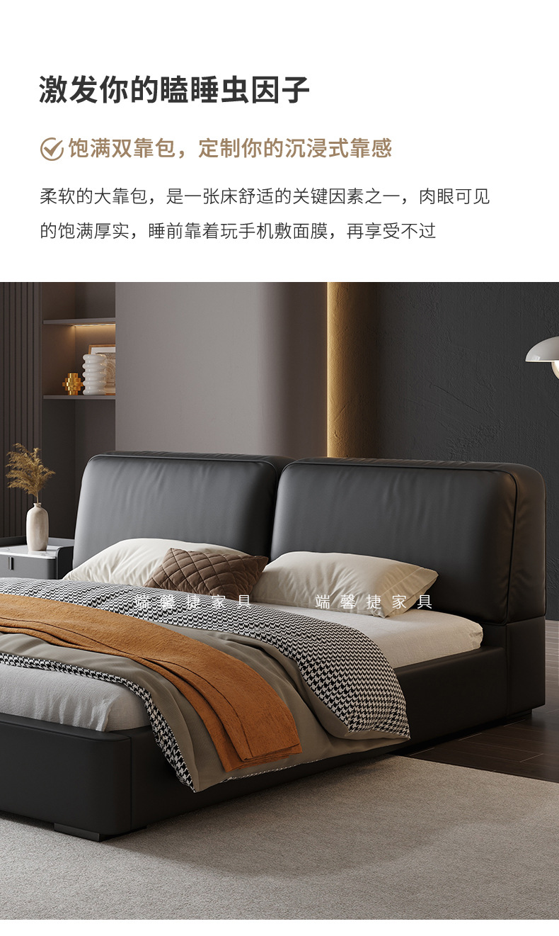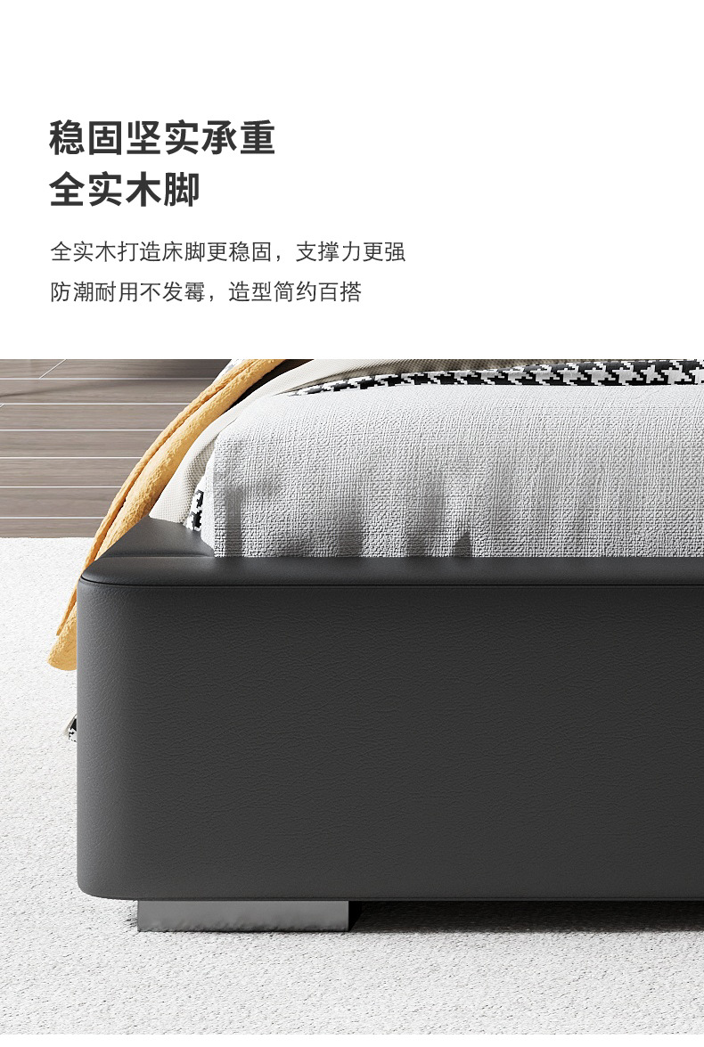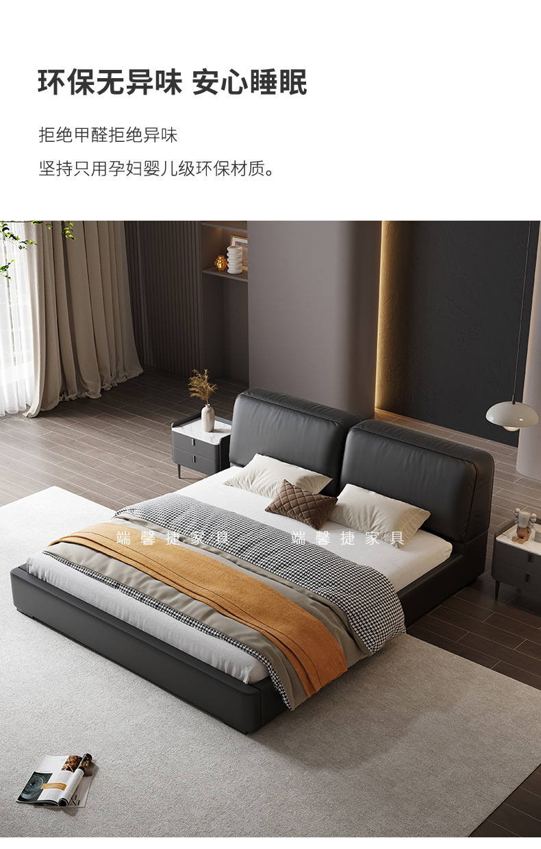 Imagen de verano cama de cuero genuino italiano minimalista gran vaca negra cuadrada cama doble 1,8 m Cama grande piso simple cama de boda negro
