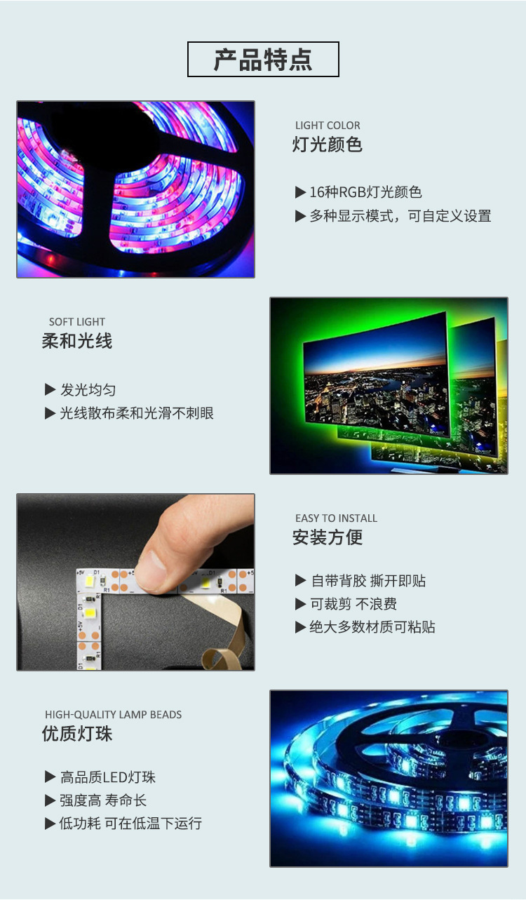 En stock tira de luz RGB traje 5050 de baja tensión USB TV Fondo colorido Bluetooth música 5V tira de luz LED tira de luz