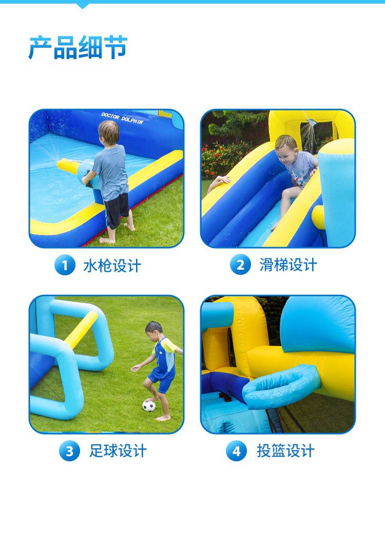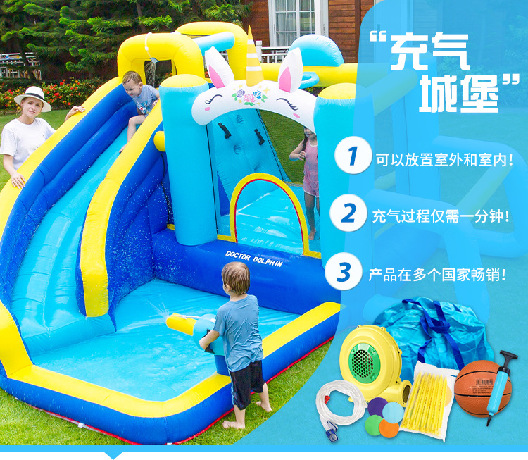 Dr. Dolphin | Parque acuático pequeño para niños, tobogán de castillo inflable para niños en casa, tobogán de agua combinado, cama de salto
