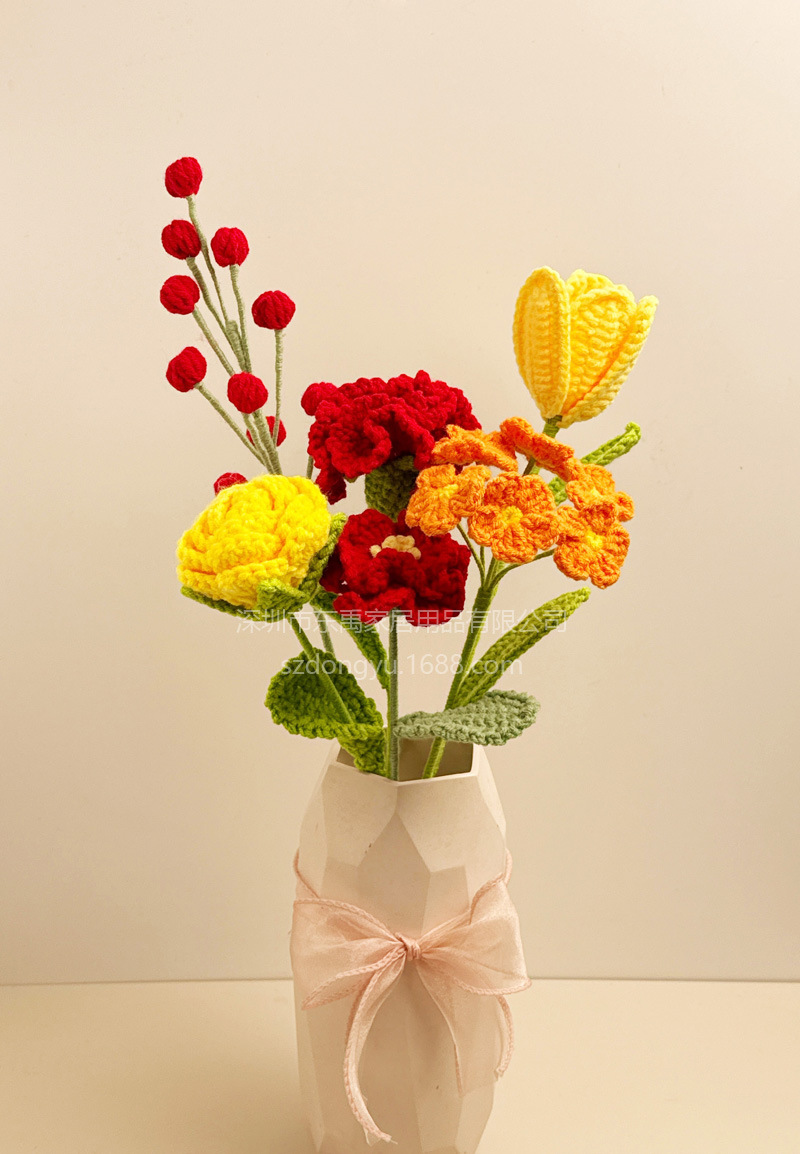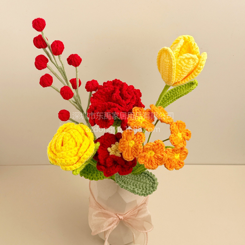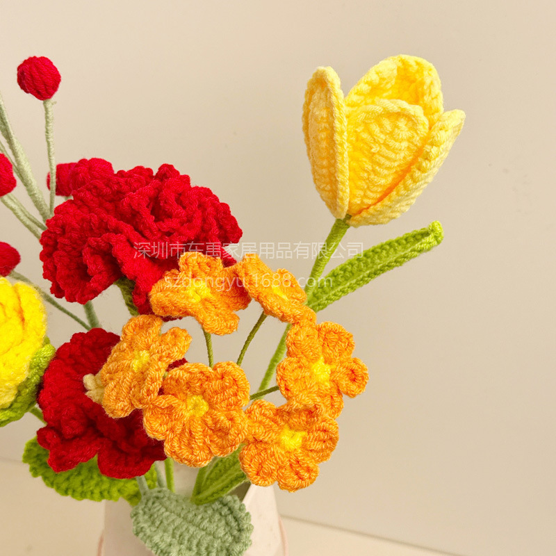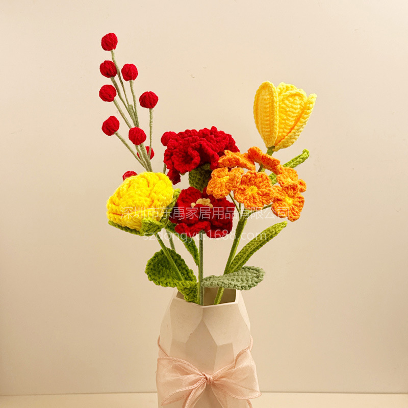 Tulip Not Forget Carnation Flor artificial Rosa Decoración del hogar Lana Ramo tejido de ganchillo hecho a mano Producto terminado