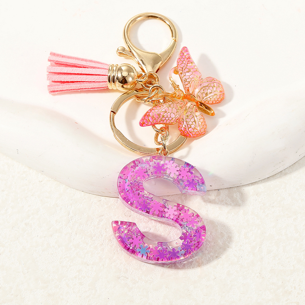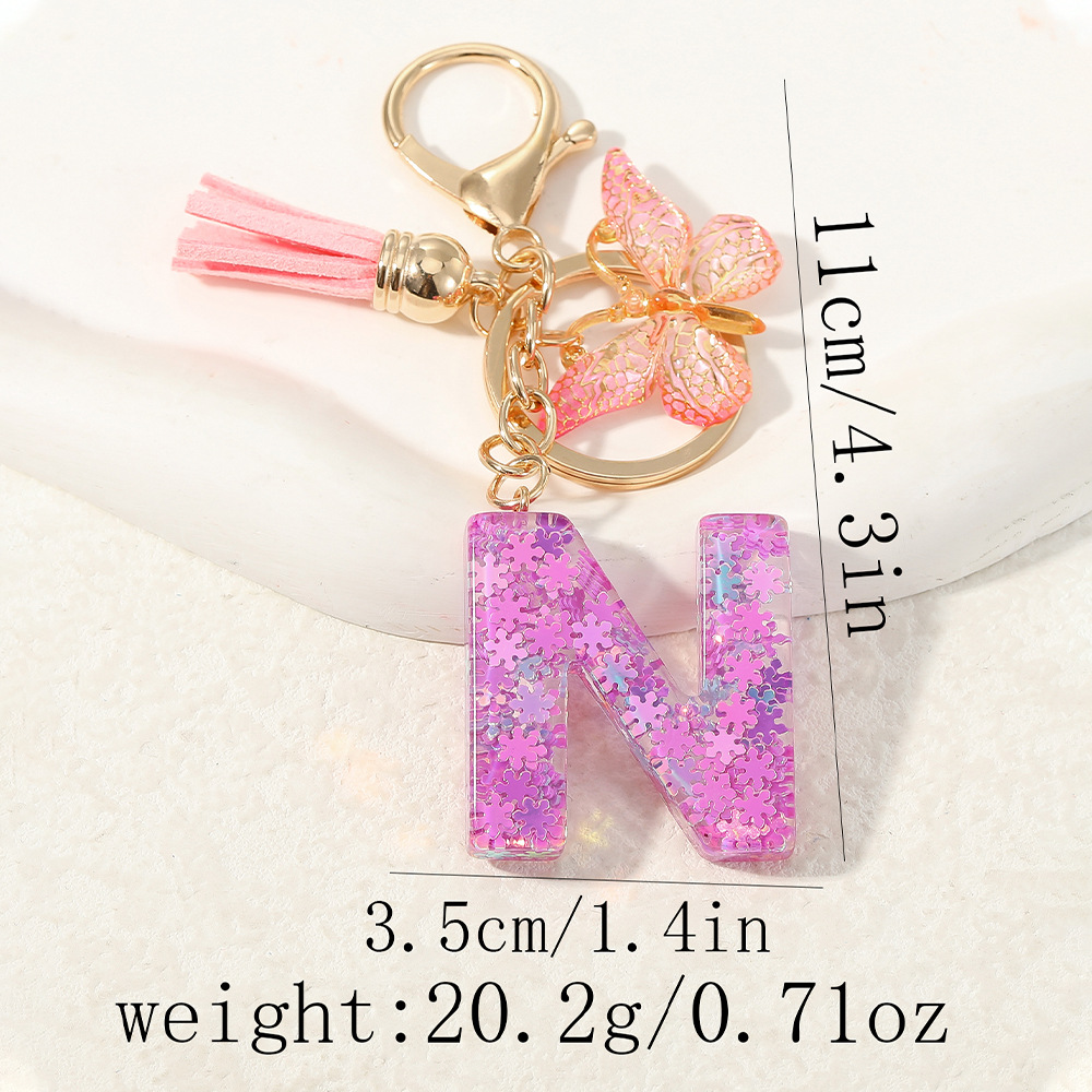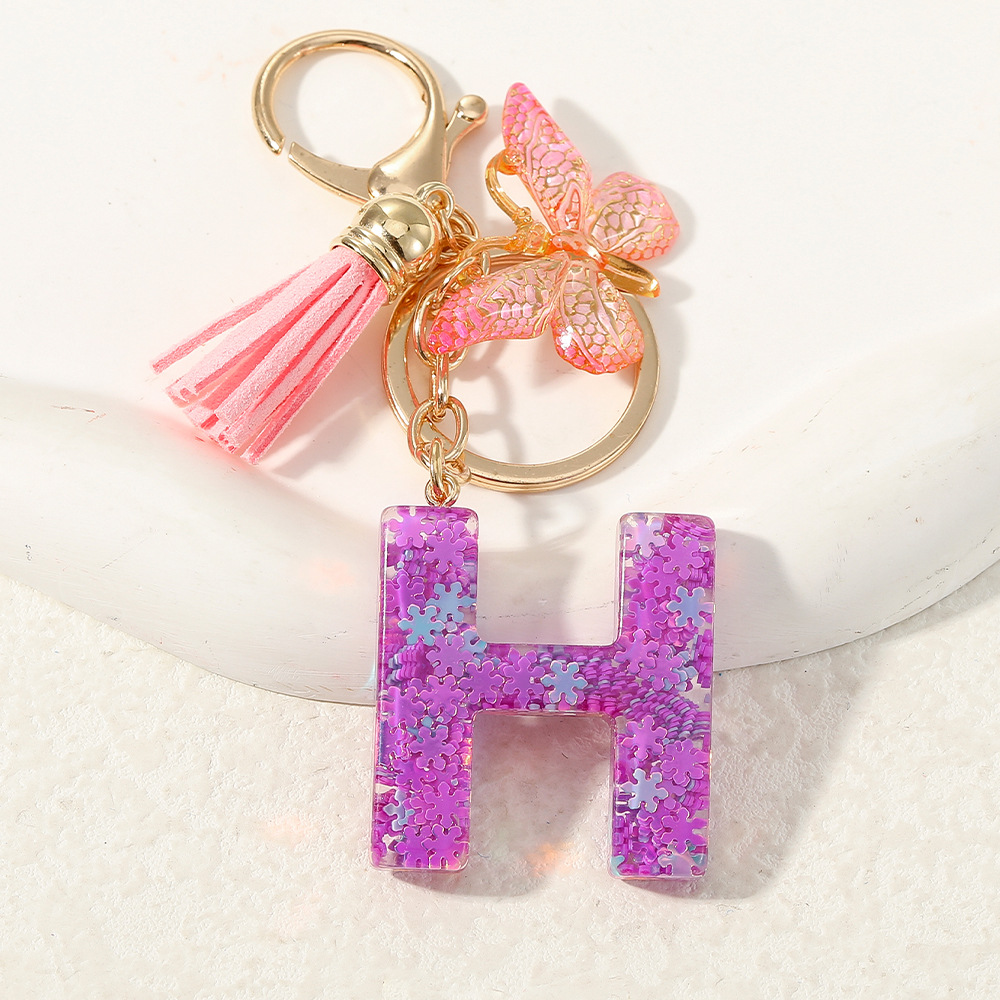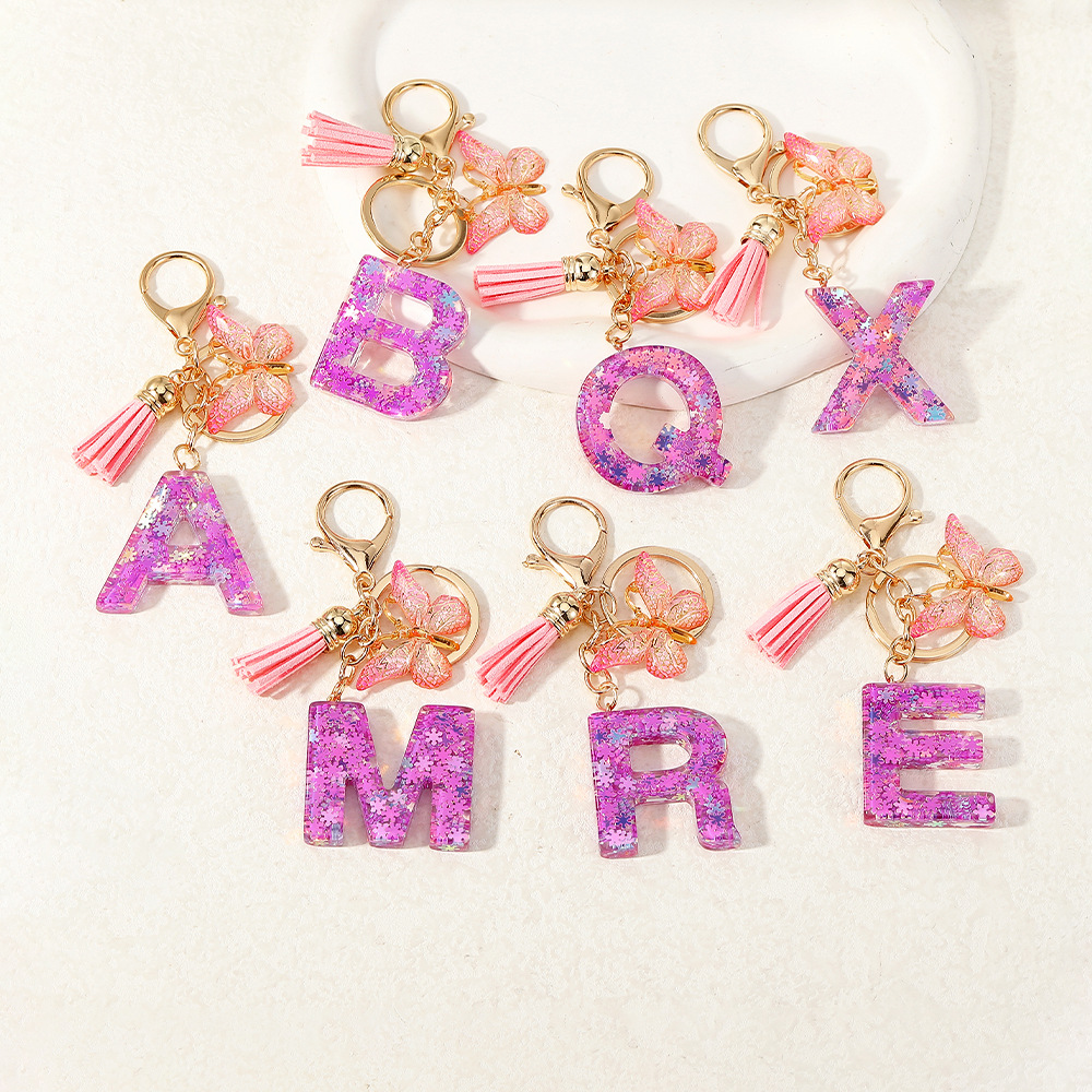 Nuevo color púrpura claro mezcla de polvo brillante letras inglesas resina llave colgante estilo simple mariposa borda colgante