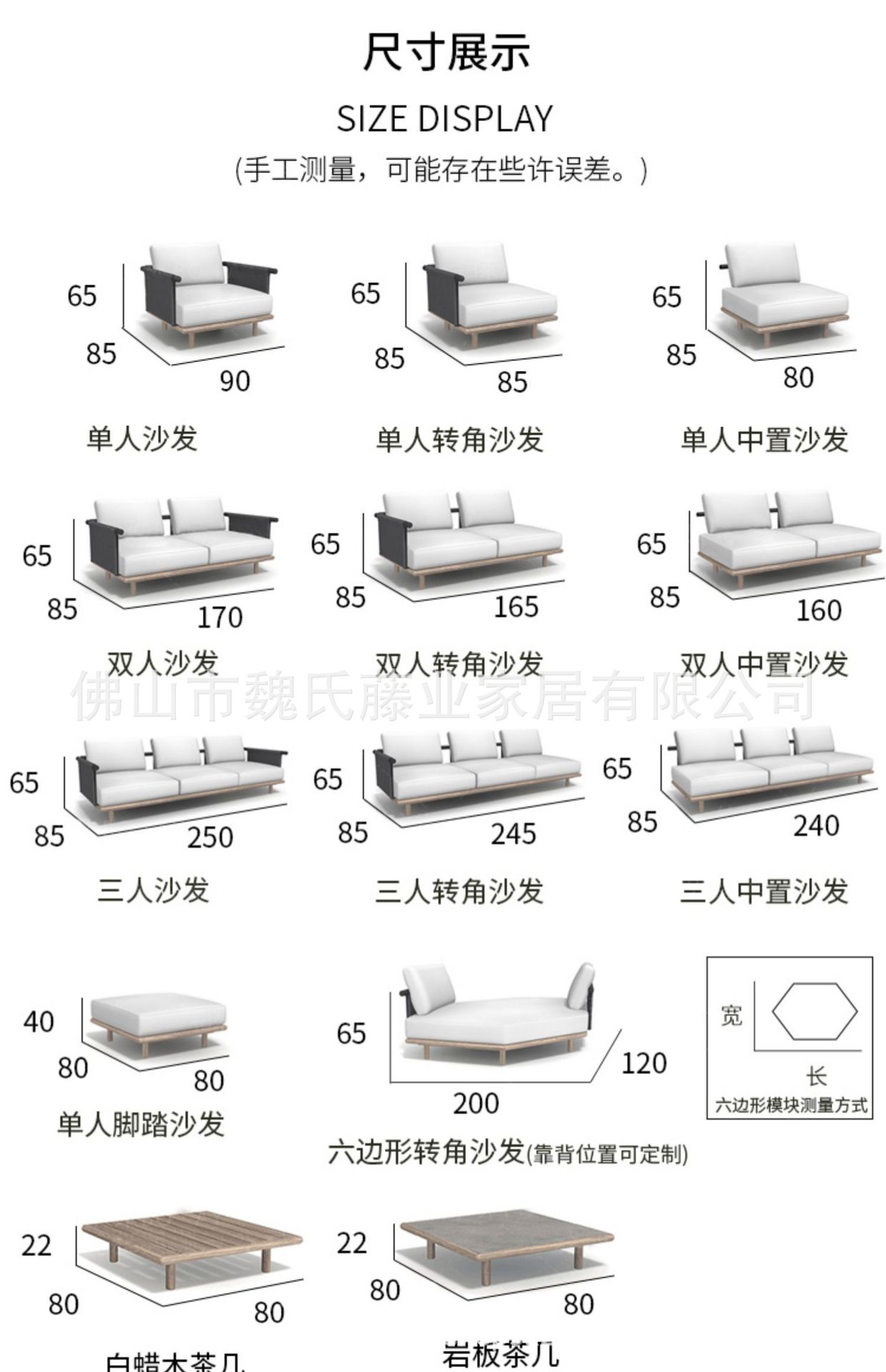 | Color | Individual, esquina individual, mediana individual, doble, doble esquina, mediana doble, triple, triple esquina, triple plaza, sofá hexagonal, pedal, Mesa de café de madera maciza, Mesa de café de pizarra |