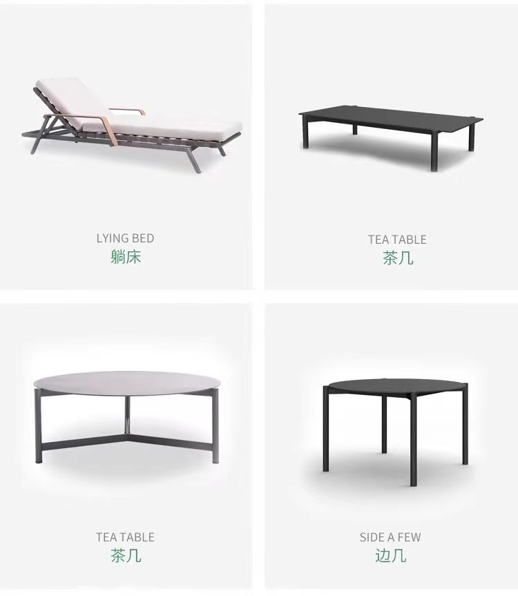 | Color | Sofá individual, sofá doble, sofá para tres personas, Mesa de café larga, Mesa de café redonda grande, Mesa de café redonda pequeña, silla individual, reposabrazos, Mesa larga, silla de bar, bar, tumbona |