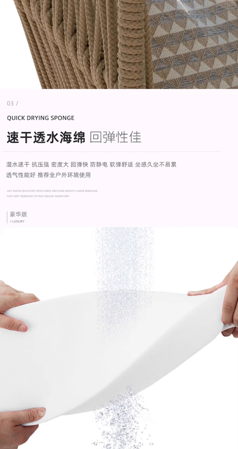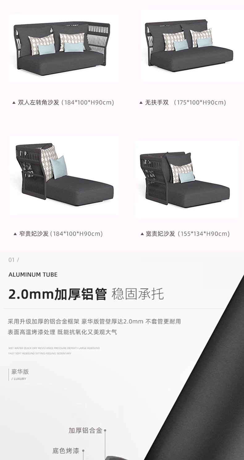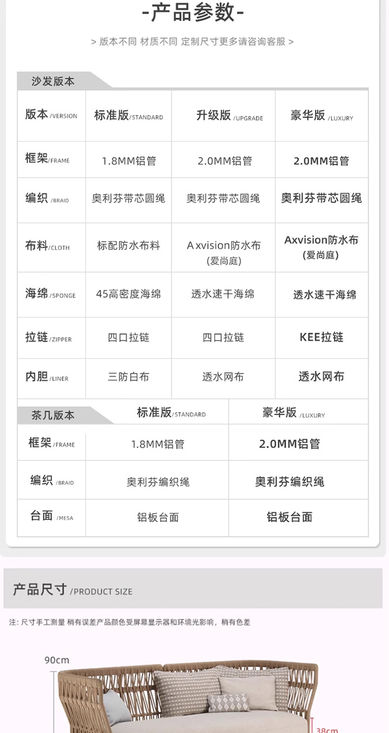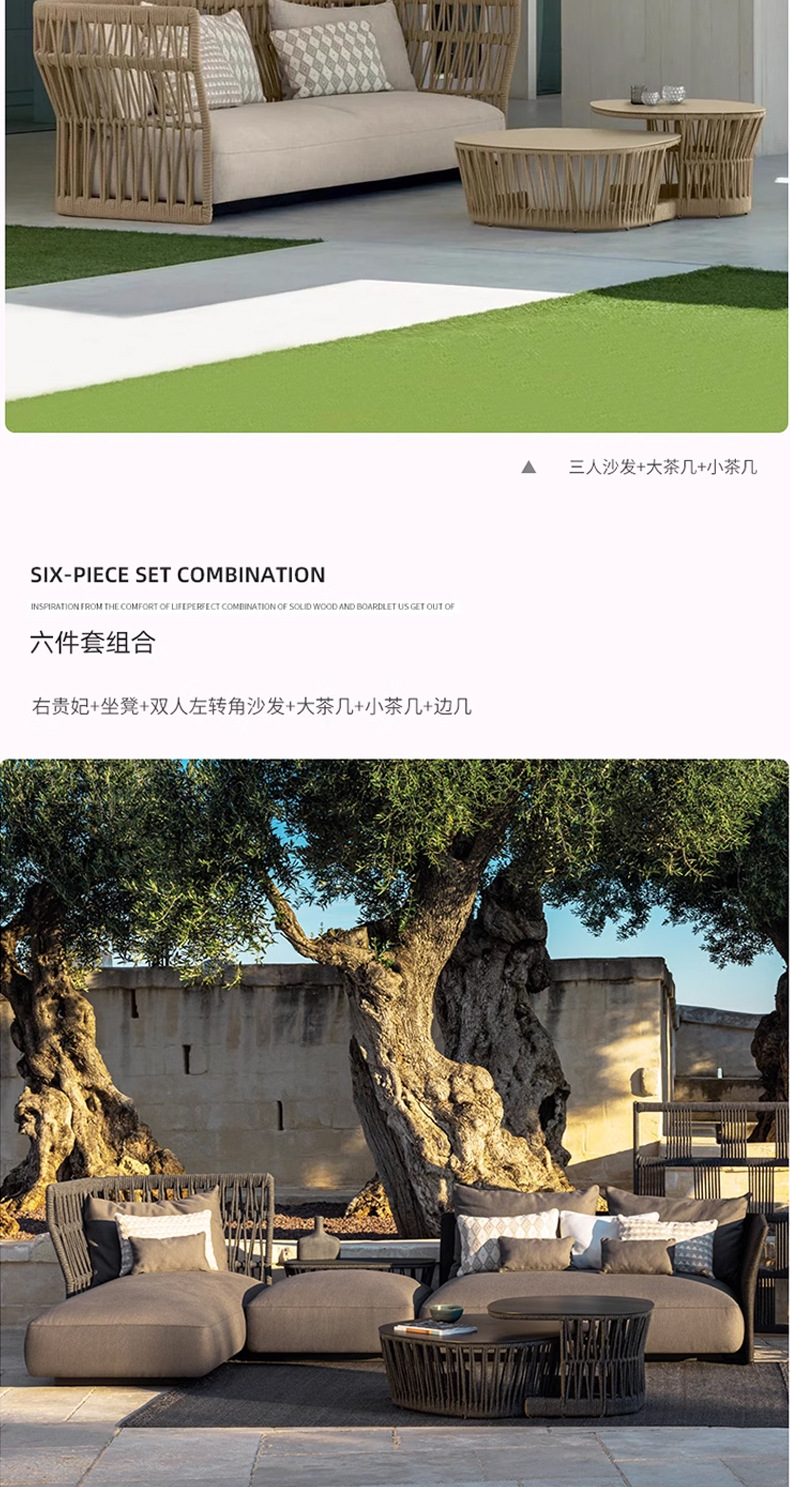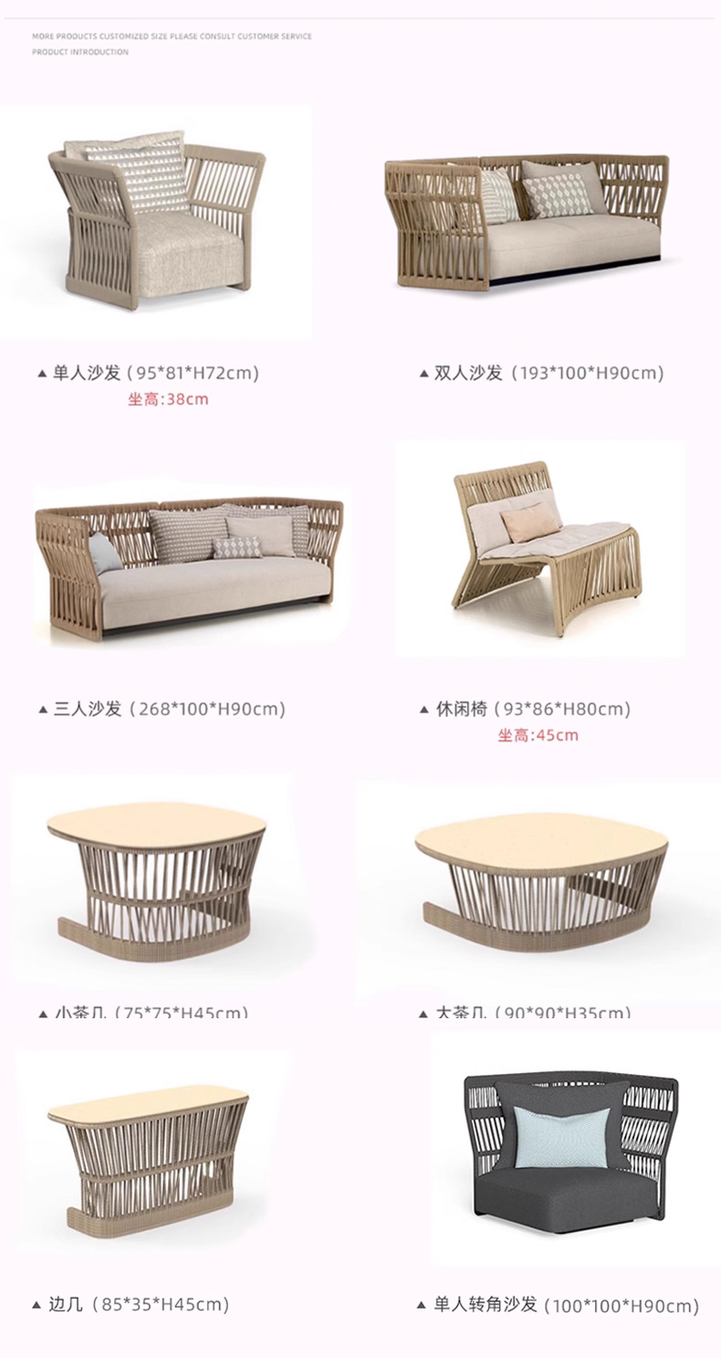 | Colores | Sillón individual (tejido de cuerda),Silla de sofá individual (tejido de ratán),Sofá individual,Sofá doble,Sofá de tres personas,Cama recostada,Sofá doble esquina,Sofá doble sin reposabrazos,Concubina única,Mesa de café enana,Mesa de café alta,Mal lateral,Mesa de centro de tres piezas,Combinación uno,Combinación dos,Combinación tres,Combinación cuatro,Combinación cinco,Combinación seis,Combinación siete |