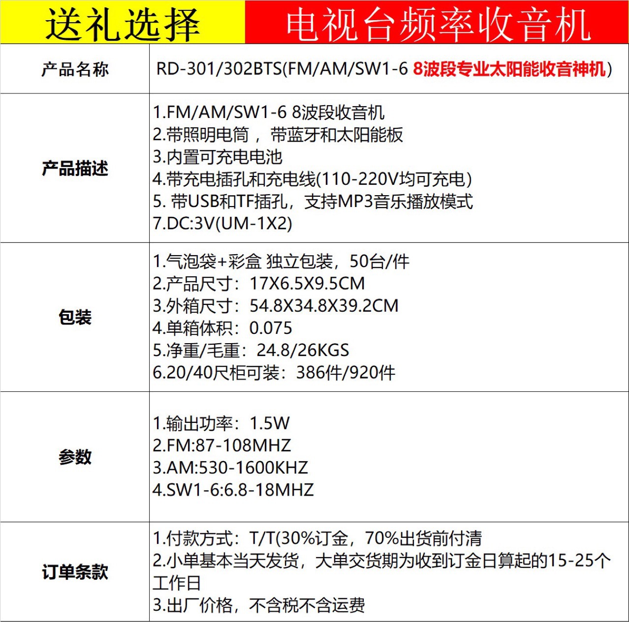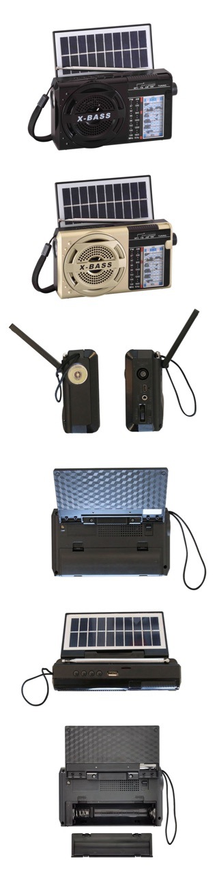 Fabricante de exportación multibanda portátil reproductor MP3 con linterna Bluetooth recargable solar radio retro