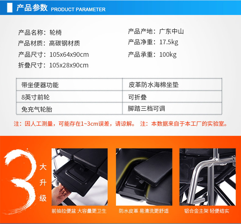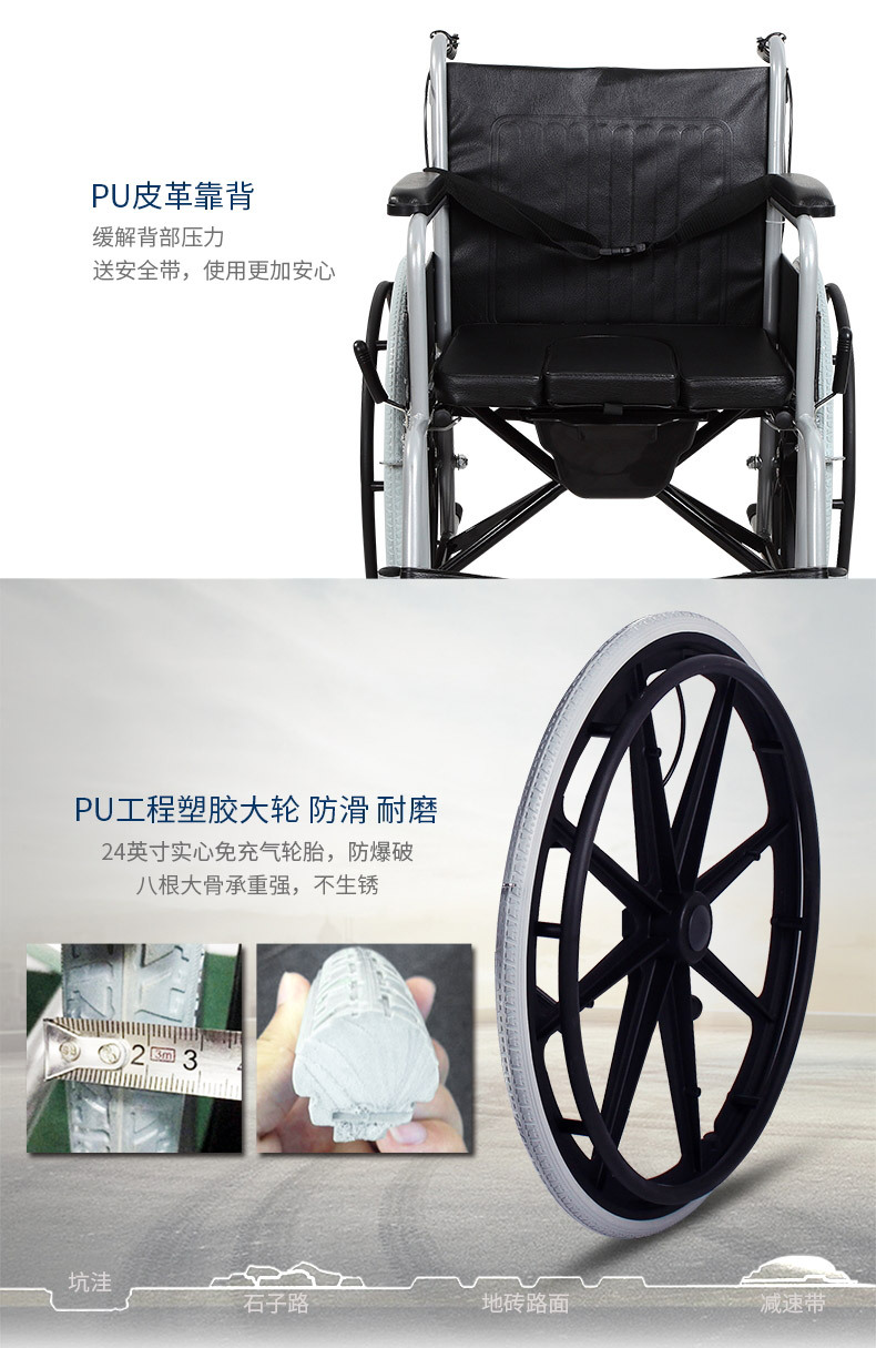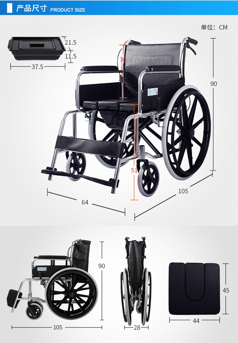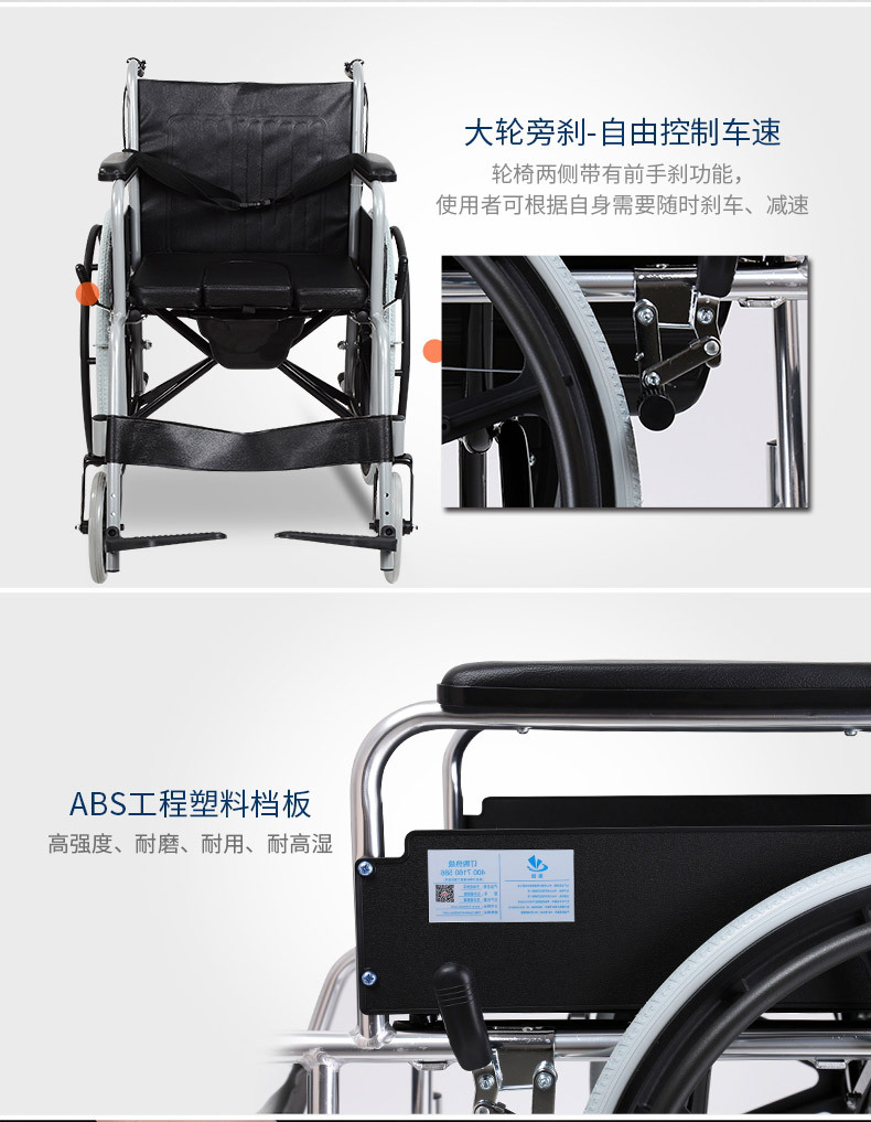 Silla de ruedas de la silla de ruedas de la silla de ruedas de acero de alto carbono para personas mayores con inodoro plegable carro de mano multifuncional ligero