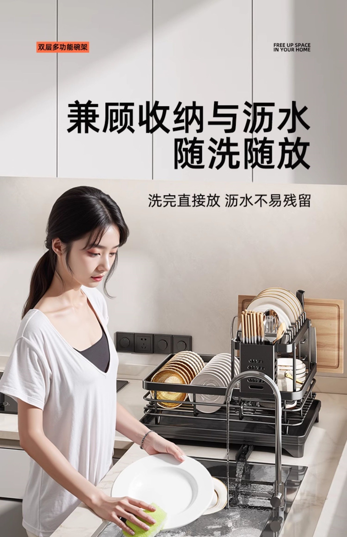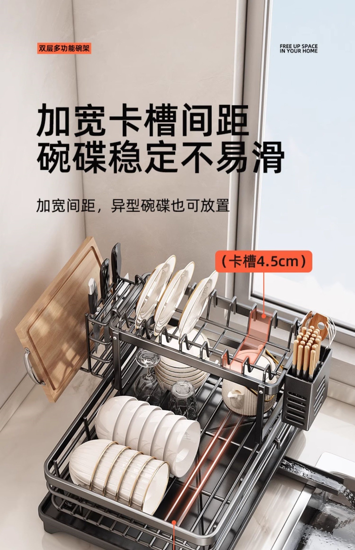 Estante de almacenamiento de platos Youqin Estante de drenaje Estante de cocina Cuenco de acero inoxidable Platos y platos Cesta de drenaje de doble capa