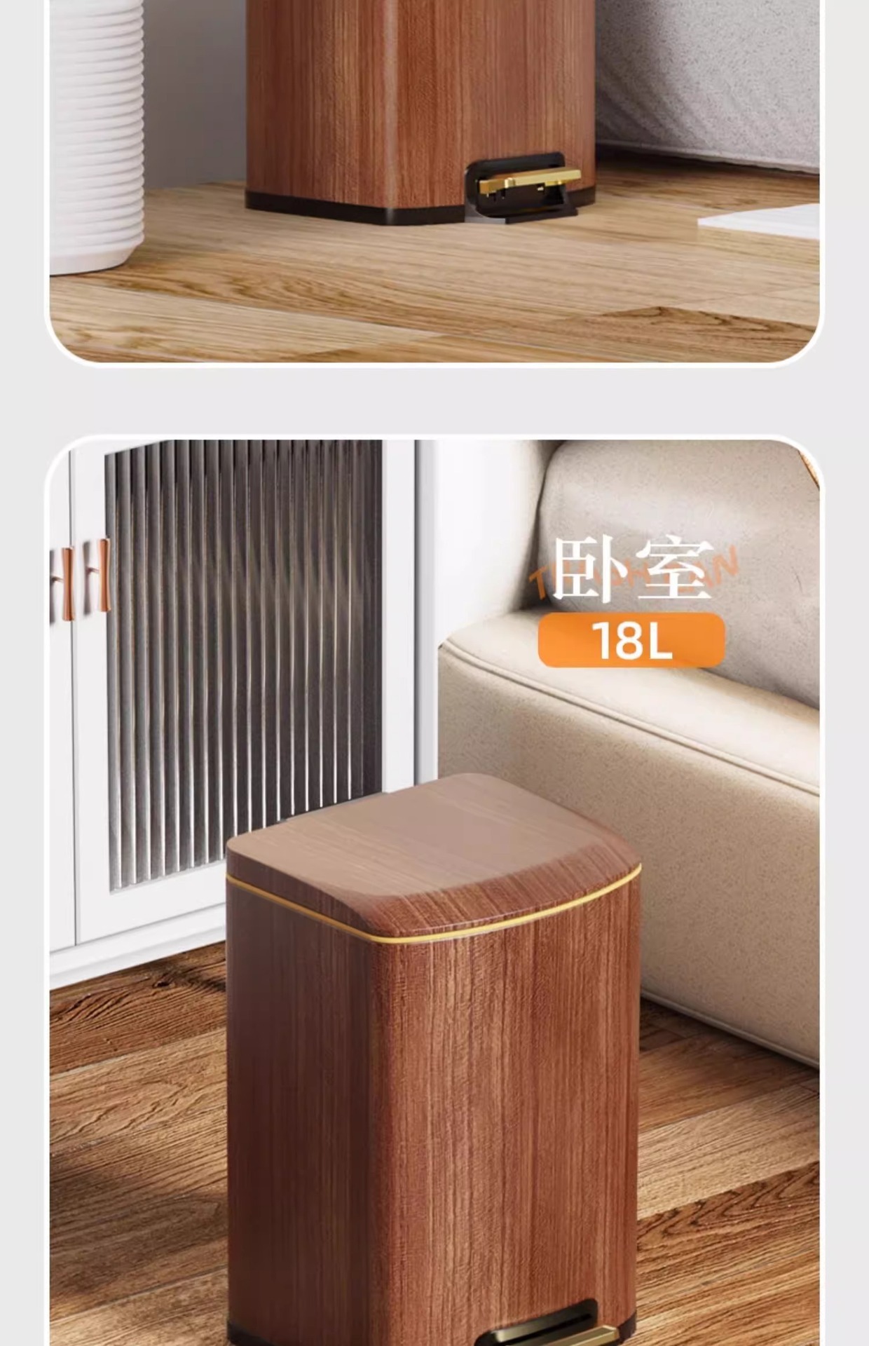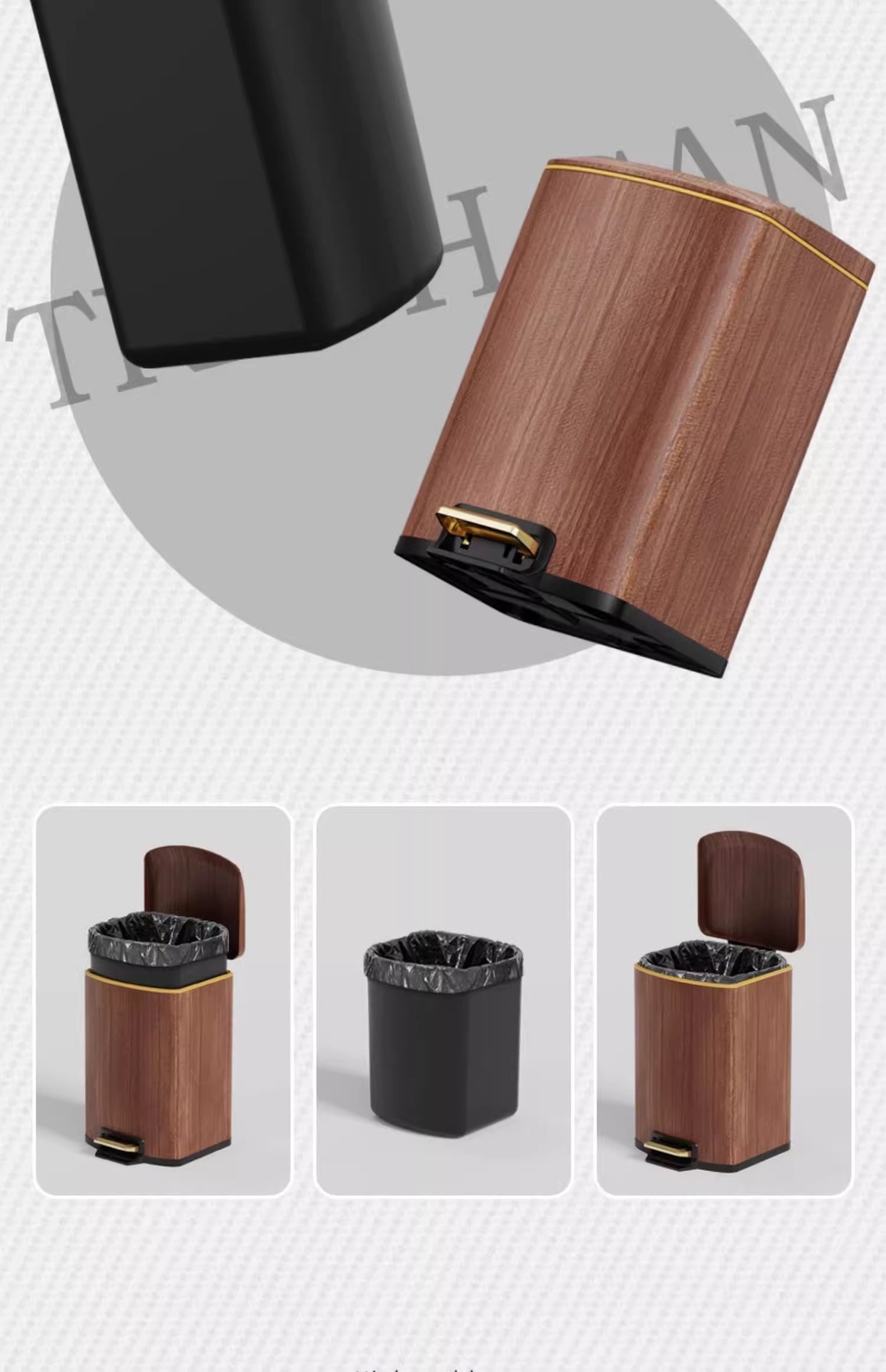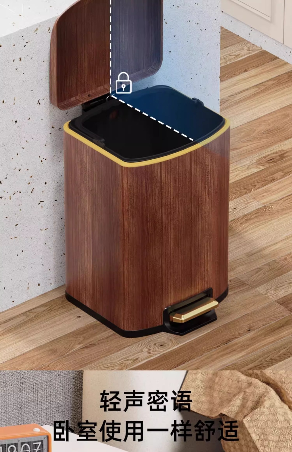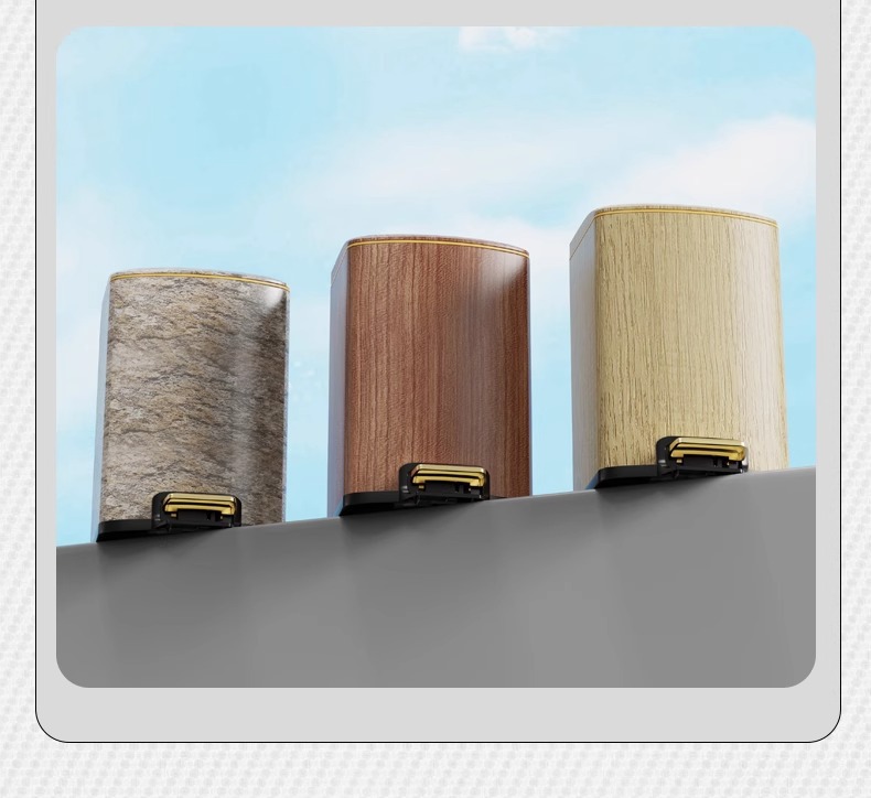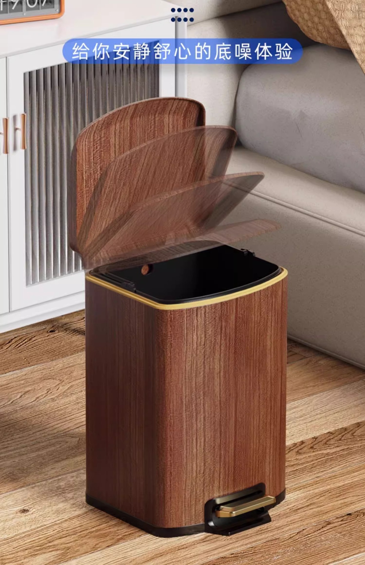 Nuevo estilo chino imitación de madera de acero inoxidable cubo de basura sala de estar cocina doméstica con cubierta suave pie de mesa de té de oficina