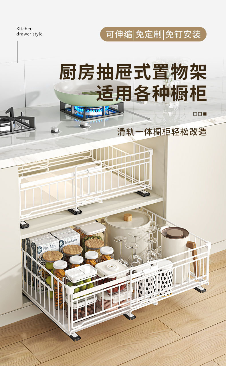 Estantes de cocina extraíbles, cajones plegables, condimentos para platos, canastas de extracción, lavabo, estante de almacenamiento extraíble