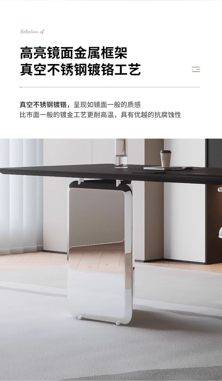 Mesa de comedor de placa de roca negra pura [Base de acero inoxidable espejo]
