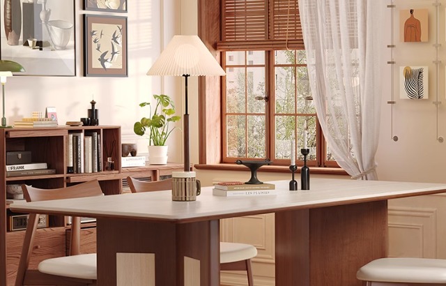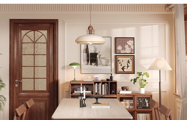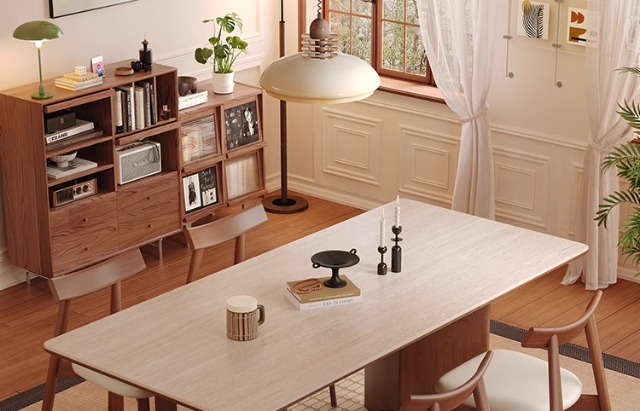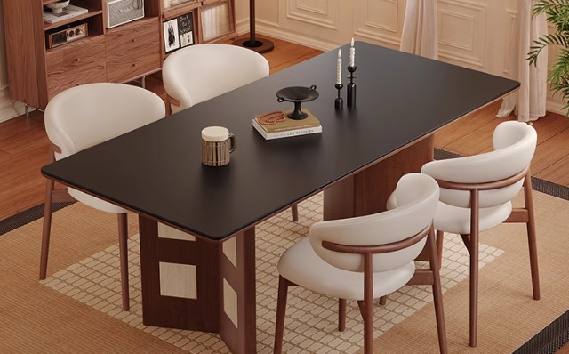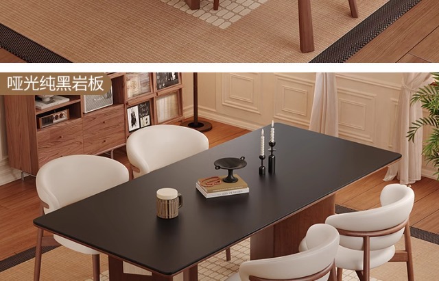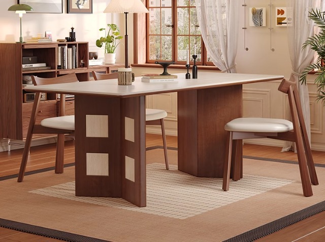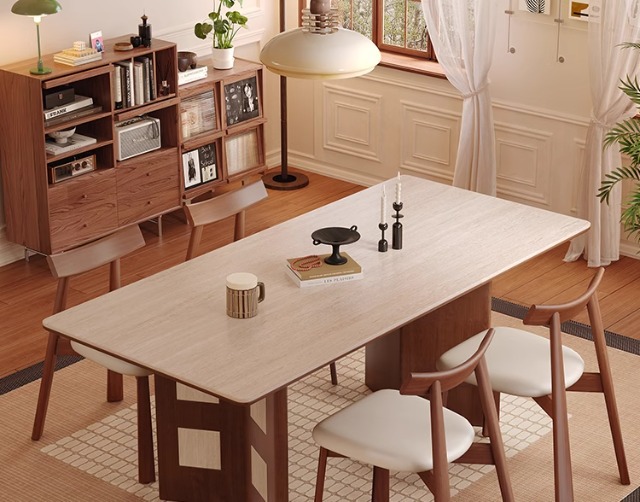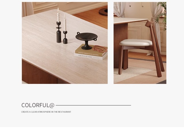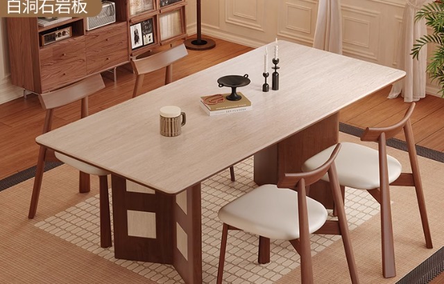 Mesa de comedor Carmen de madera maciza de estilo medio, tablero de roca travertino 2024 nuevo hogar pequeño apartamento francés retro familia nórdica