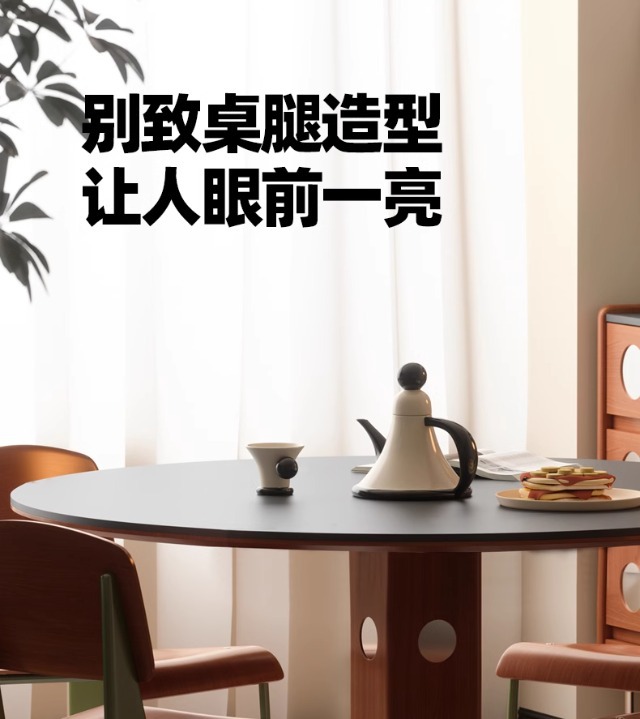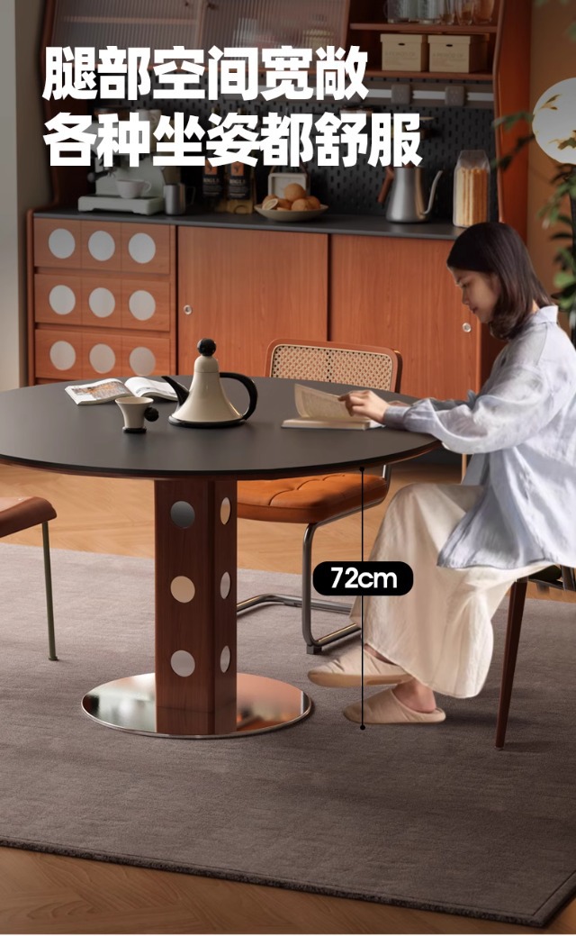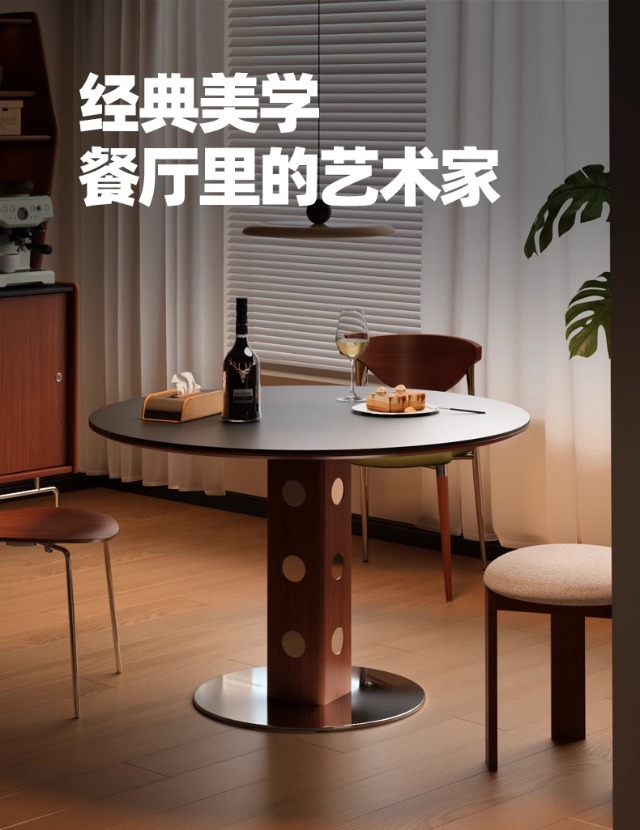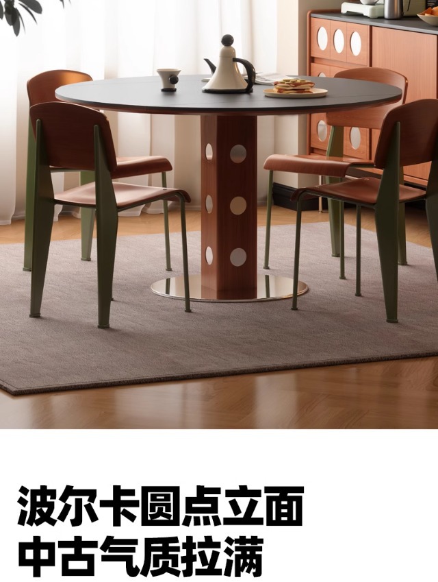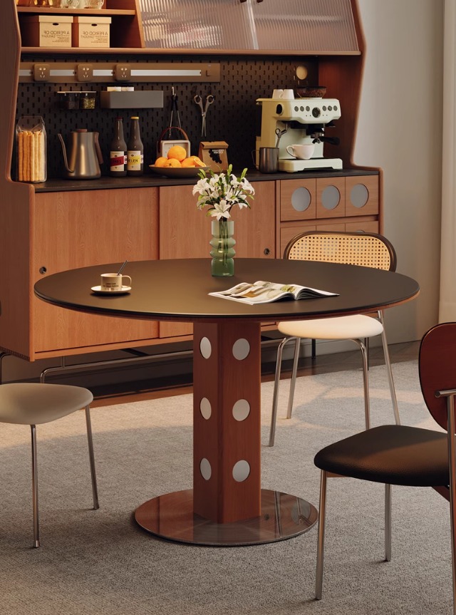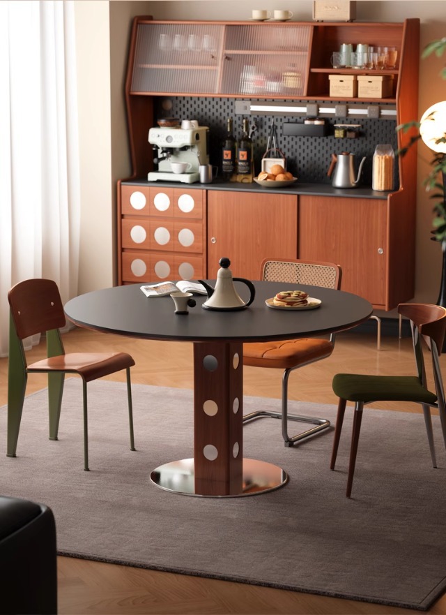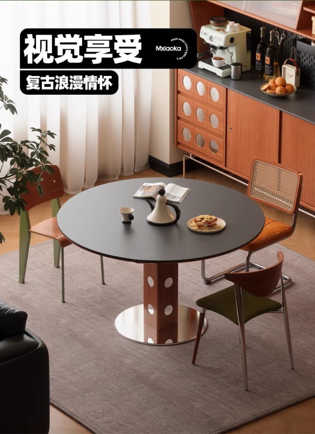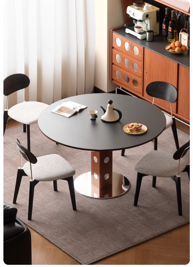 Mesa redonda de la placa de roca de estilo medieval, mesa de comedor redonda de piernas metálicas retro, mesa de comedor de madera sólida de Bauhaus nórdica.