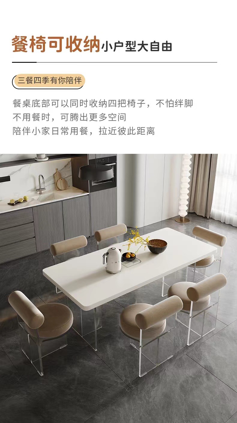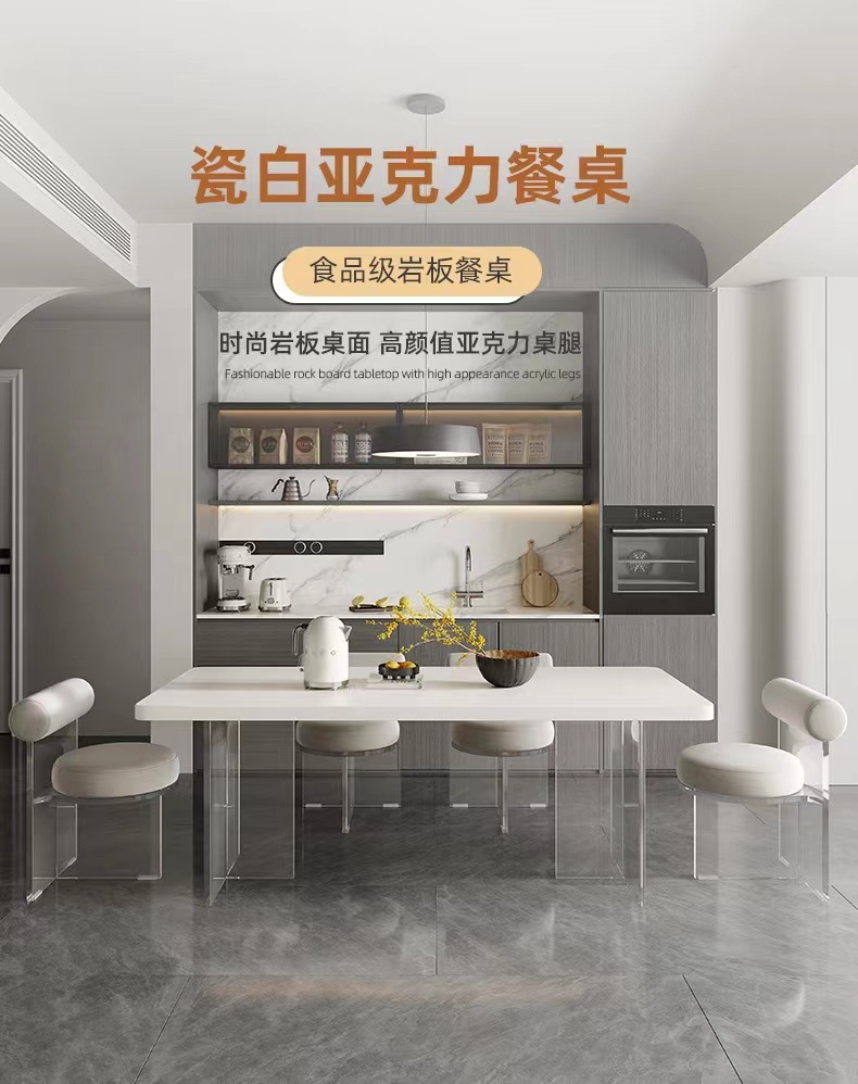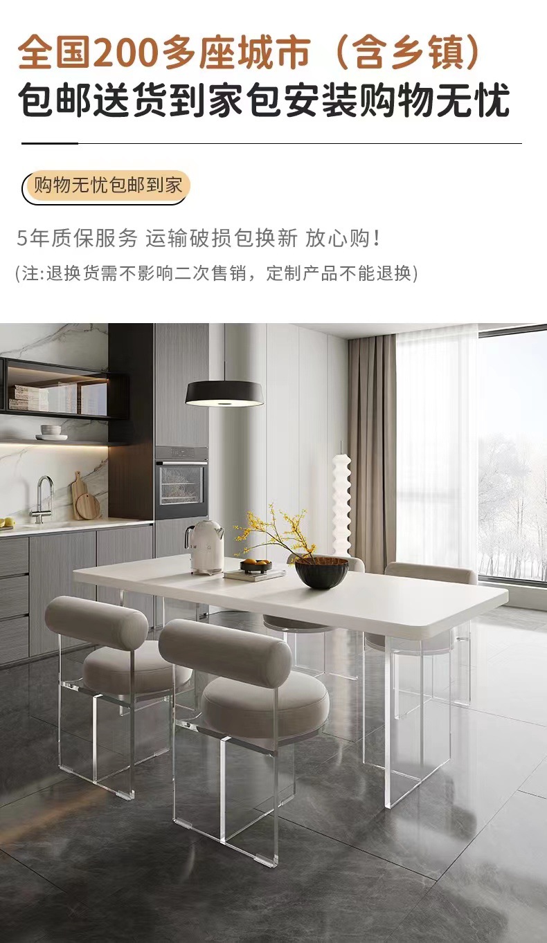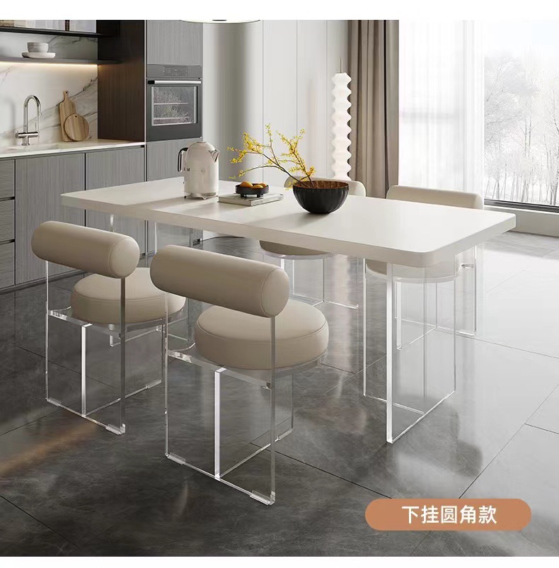 Luz moderna de lujo acrílico suspensión mesa de comedor y silla combinación inferior colgante redondeado blanco mesa de comedor hogar pequeño apartamento Mesa transparente