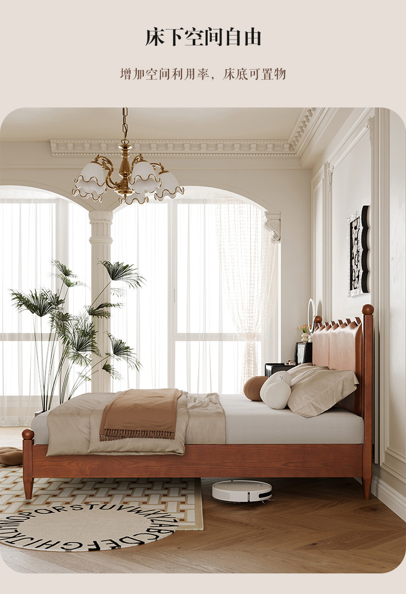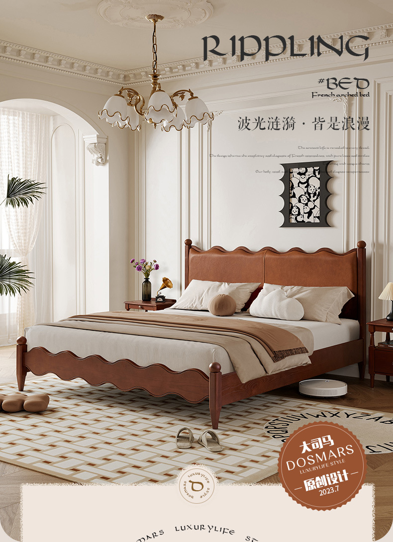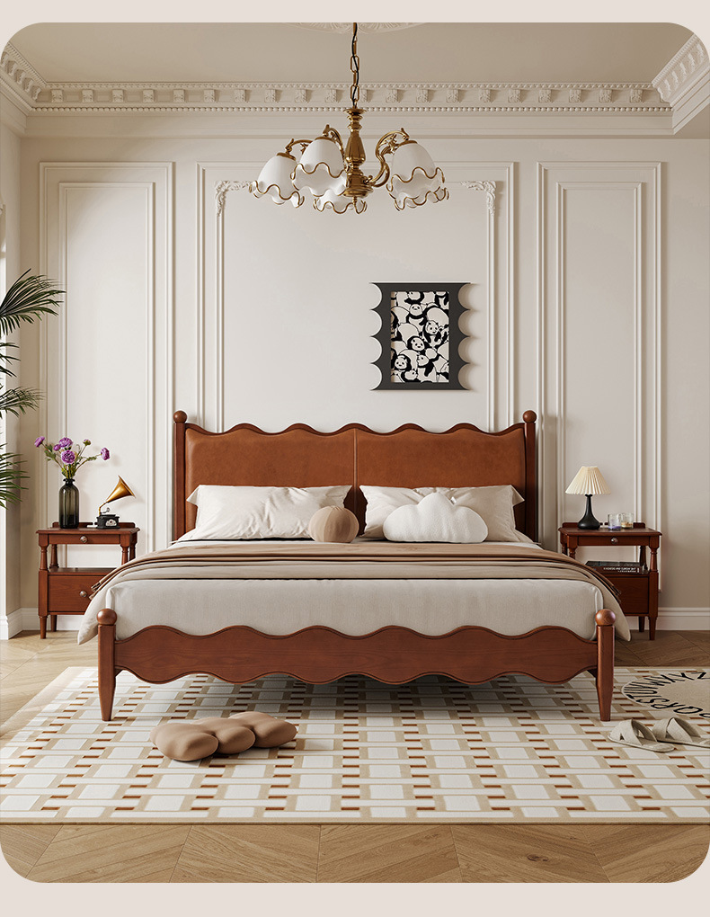 Cama de madera maciza de cera blanca estilo retrógrado medieval estilo francés, cama de cuero de vaca, cama de envoltura suave, cama principal doble