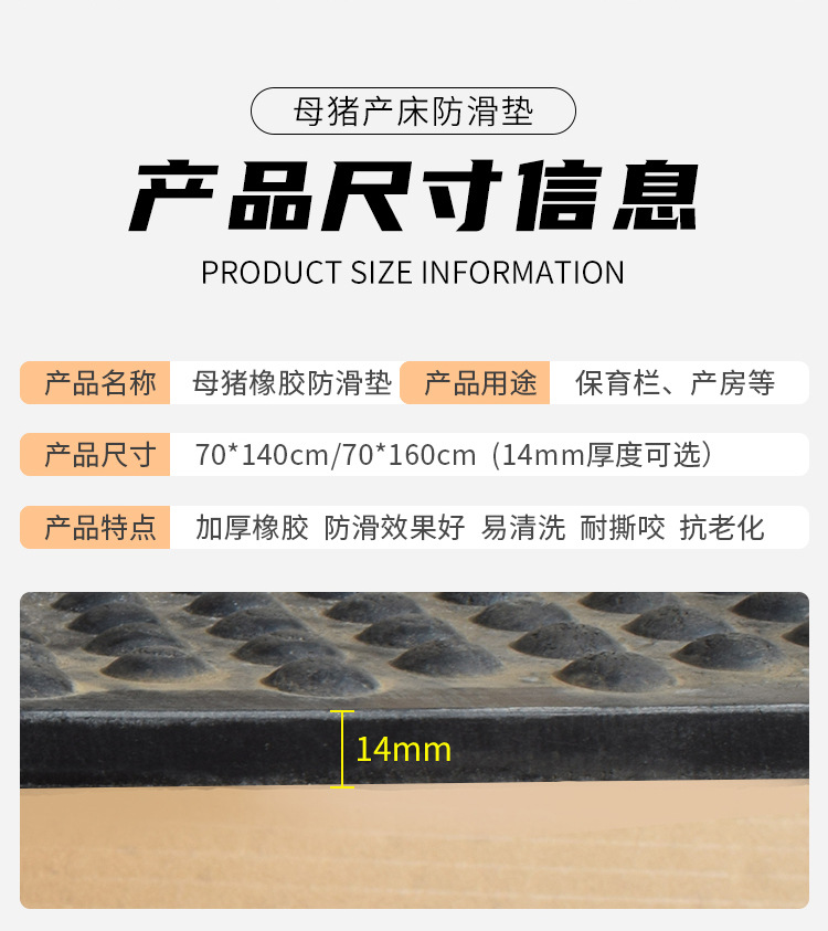 | Especificaciones del producto | 70 × 140 cm (almohadilla antideslizante para la cama de parto de cerdas de 14 mm de espesor), 70 × 160 cm (almohadilla antideslizante para la cama de parto de cerdas de 14 mm de espesor) |